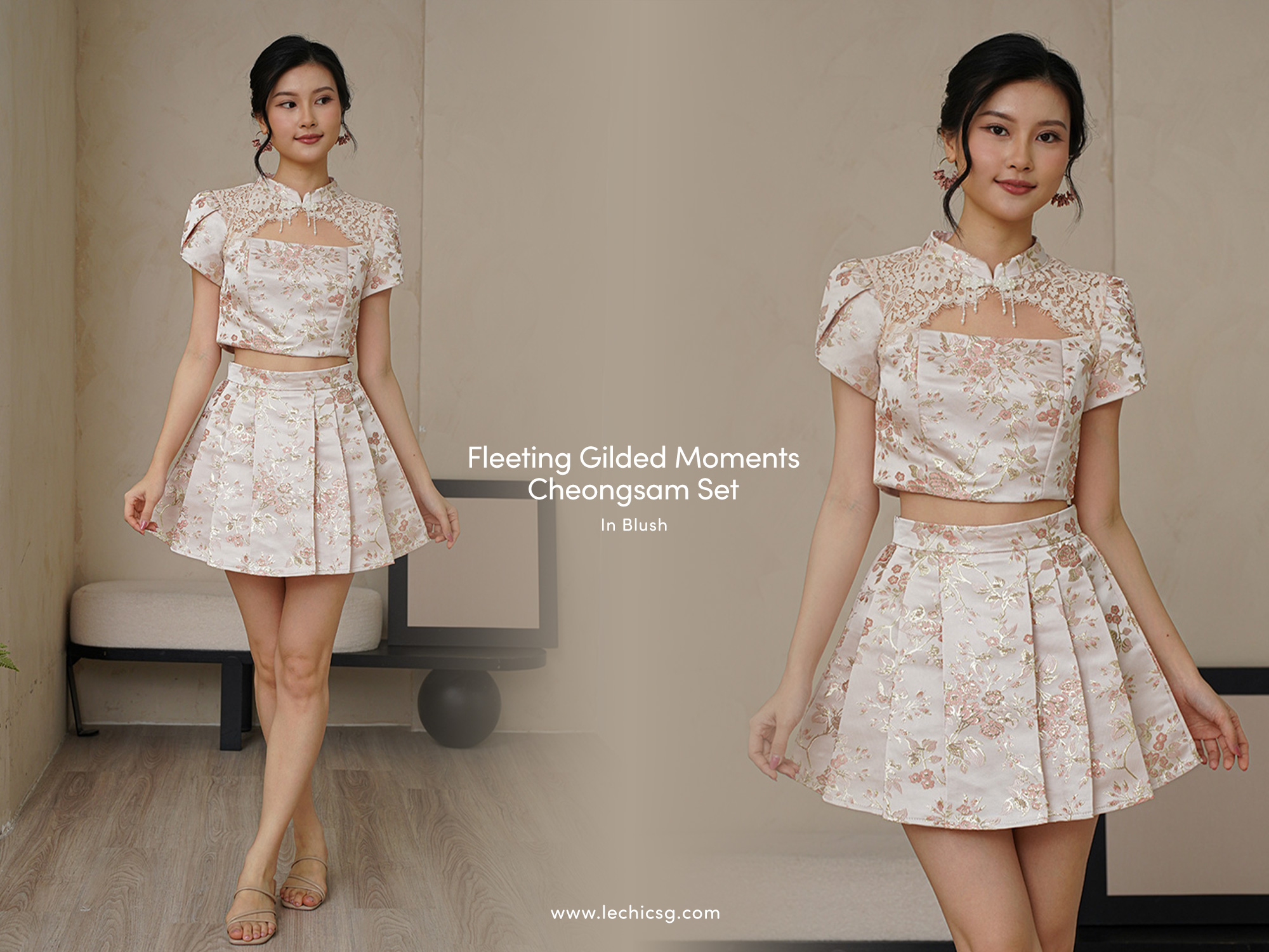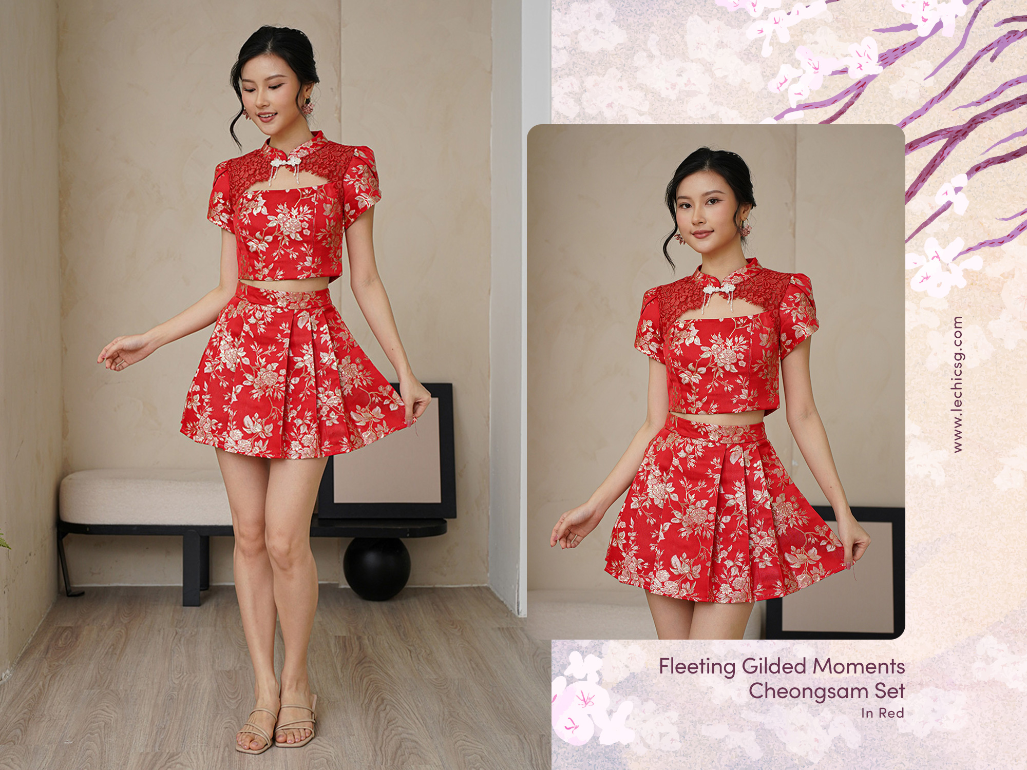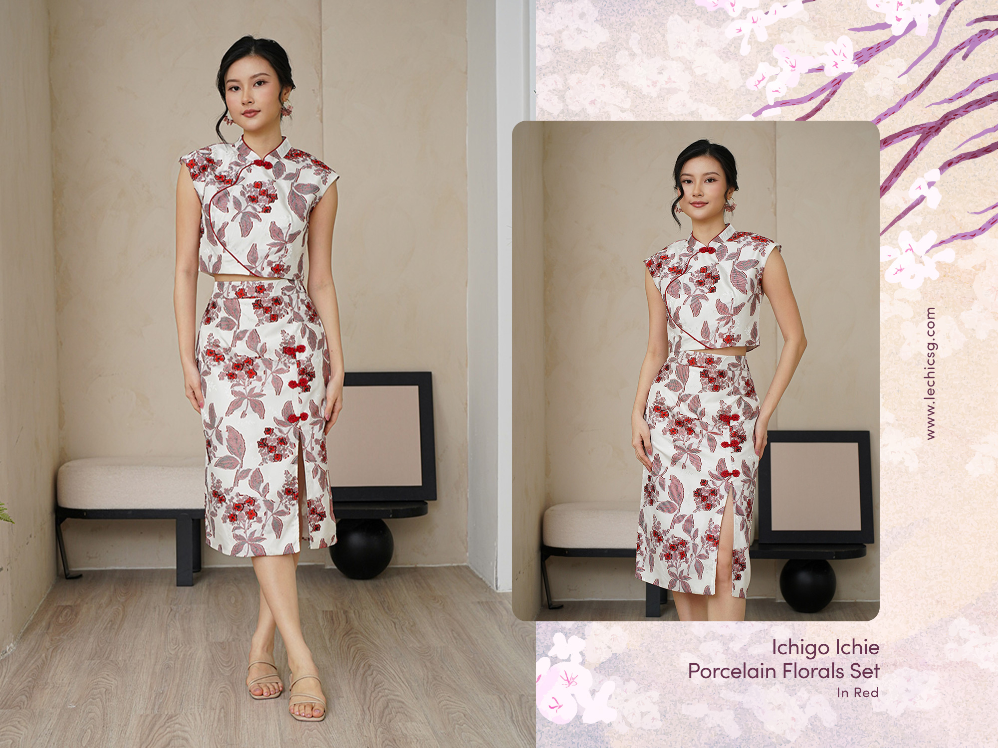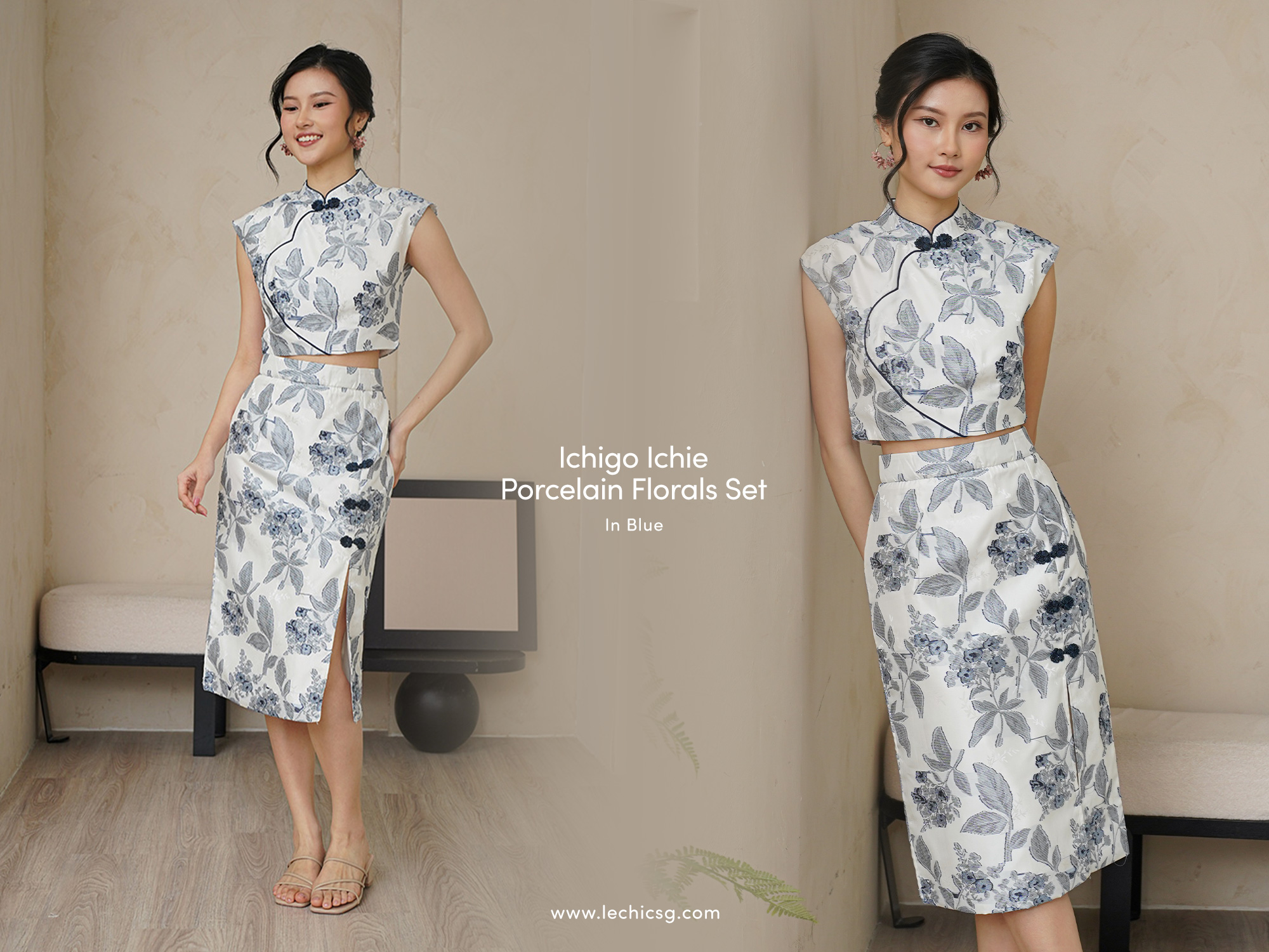 Inspired by the tender bloom of lilies, this cheongsam number captures elegance in its most effortless form, inspired by a porcelain vase. Lightweight tonal florals drift over a silhouette designed to shape and soften, while its subtle details complete the look with quiet romance. Adorned with a soft-blue / festive-red botanical print that bring painterly charm to the silhouette. Brushstroke flowers sweep soft colour over this sharp-but-flowy coordinate. It's decorated with pretty tonal lilies inspired by prints from the '30s and has capped cheongsam sleeves that enhance the feminine feel. With 3D florals in peonies, camellias, lilies, our oriental number carries the essence of each flower. Inspired by porcelain artistry and modern romance, this white base cheongsam number features tonal vase florals blooming across. The mandarin collar nods to tradition, while the tempered porcelain florals add soft, contemporary allure. Delicate porcelain-like vintage flowers adorn a regal tonal background, unexpectedly harmonizing with the interplay of festive floristry. Delicate peony and lily motifs in blue or red on an ivory base, mirroring the artistry of Ming Dynasty porcelain. The porcelain colour scheme pays homage to China’s ceramic mastery, transforming traditional art into wearable elegance. Functional pankou buttons. Fully lined, not sheer. Exposed back zip closure for top, concealed back zip closure for skirt. Made of cotton poly blend. Comes in red and blue. Available in sizes S, M & L.