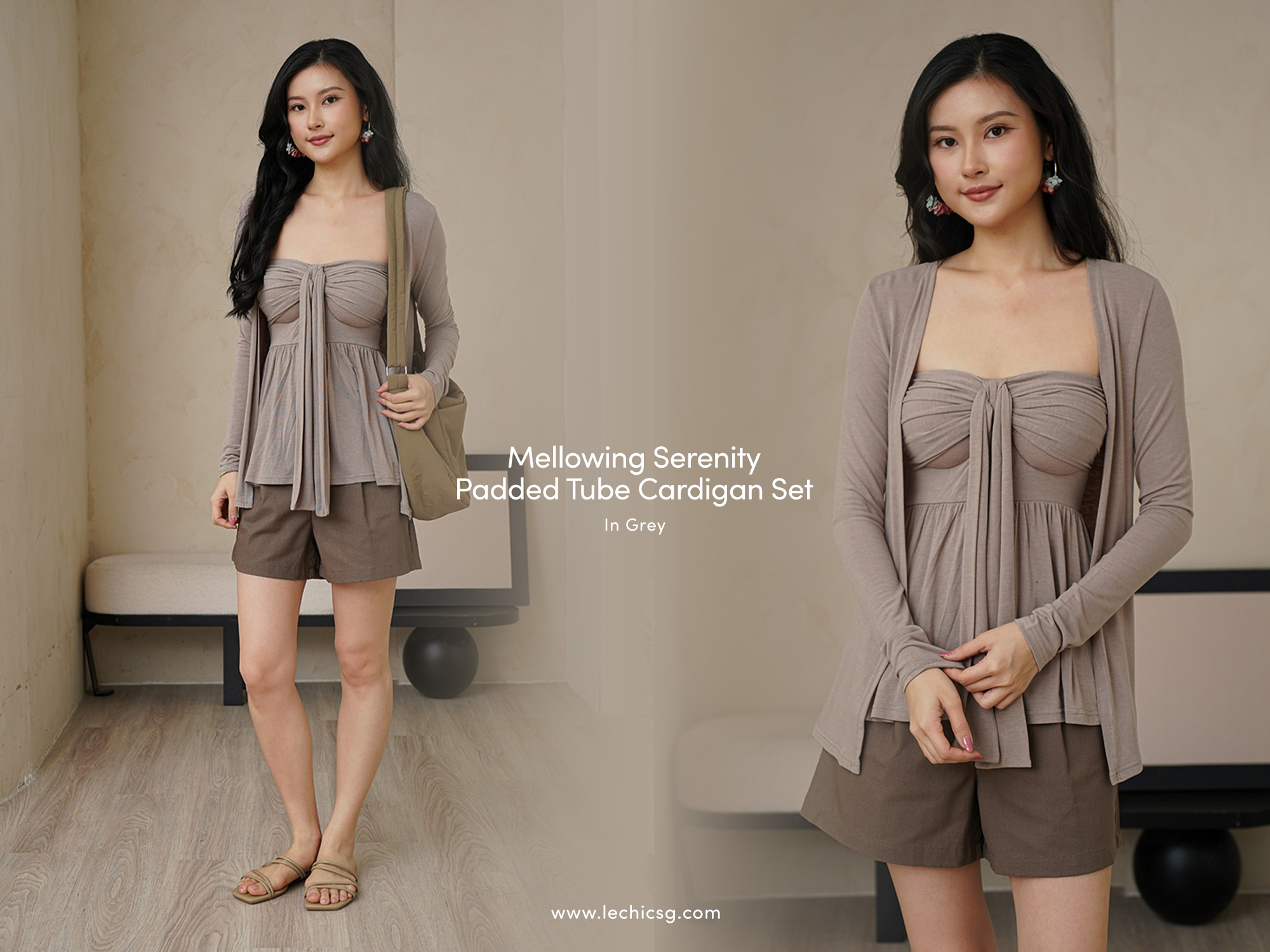Padded at bust. This rayon soft cardigan set is perfect for brunch and an afternoon of shopping. The unique tie bust detail gives the strapless design built in support, and also the removable paddings give unparalleled support. Adjustable ties along the padded bust add a dynamic touch and soften the waistline. Delightful drapey bows tether the front of this tube cardi set that's full of warmth and charm. The feminine ribbon knot detail on the basic line makes it a lovely point, and you can tie the ribbon in various ways according to your taste. Designed in a breathable, crease-ease rayon knit, it’s your go-to layer for breezy days. With a classically cozy silhouette, this must-have cardigan and tube set will be the crush-worthy wardrobe addition of the season. A skin smooth cardigan meets the flirty tie-front bodice, complete with long drop that angle your frame nicely. Padded camisoles/tubes and cardigan sets are having a moment, currently. Wear the tube top solo to exude flirty confidence or layer it with the matching cardigan for a stylish, coordinated look that's perfect for any occasion. Oh so buttery soft rayon cotton and in the most eye pleasing shades ever, this set doubles up on all the reasons to adore cardigans and top sets! There's nothing as darling as you in this distinctive set! Sold together only and not separately as the size is cut to be the same size up top. This product is considered to be one top together and so it is not sold separately. Tube is padded at bust. Paddings are detachable. Pull on styling. Made of stretchy 66% rayon, 29% acrylic, 5% spandex. Comes in taupe grey, mint green and lilac. Available in sizes S & M.