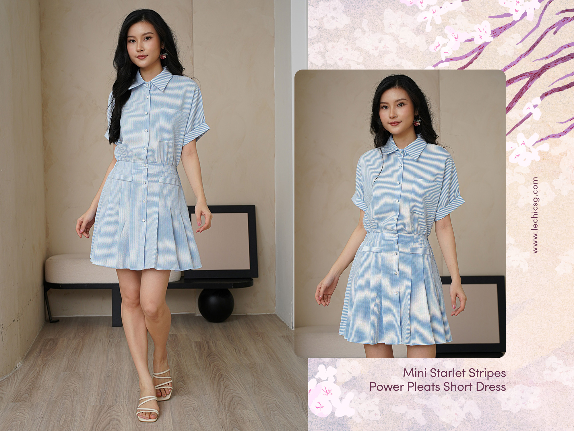 A mini version of our Starlet Stripes Power Pleats Midi dress! We have sailor stripes and power pleats, the whole package – in this. Resolutely feminine, understated, glamourous and bold, that is the statement silhouette flaunted by this hybrid shirt dress rendered in all stripes. Designed in oatmeal beige stripes and sailor blue stripes, this striped shirt dress cinches at the waist whilst falling into a pleated skirt. We know you do it all, so we designed a hybrid shirt dress that's just as versatile (and fabulous!) as you are. This timeless piece is a refreshingly feminine rendition of the classic menswear shirt with brass buttons and thin pinstripes. A relaxed silhouette means you can take this dress from brunch to business with the addition of a belted waist and heel. Or, style open as a layering piece over a silk camisole and trousers for a look that's casual-chic. Combining avant-garde silhouettes with resolute practicality, as showcased by this shirt dress, the garment features a shirt bodice with a vertical stripe pattern that falls to a combined pleated skirt. The fitted waist and A-line silhouette create a slimming effect. Additionally, the pleated skirt comes with an elastic waistband for added stretch and inclusivity. Featuring a subtle vertical stripe print, the versatile elastic waistband allows it to alter its silhouette, which is finished with a mid-pleated skirt. A button-down collar and full placket bring classic shirt styling to this organic cotton midi dress, while sharp pleats add feminine flair. Crafted using a cotton blend that’ll smooth and skim the figure, the carefully placed stripes also define your bust and draw attention in at the waist. Languid elegance defines this draped midi dress, balancing a flourishing nautical print with a softly pleated skirt and a concise tailored bodice. Nothing combines the best of both worlds (stripes and pleats) in such flair, seriously. Functional buttons and chest pocket. Decorative skirt pockets. Elasticised waistline. Full button down styling, with concealed metal hook closure on waistline. Made of cotton polyester blend. Comes in ecru and blue. Available in sizes XS, S, M & L.