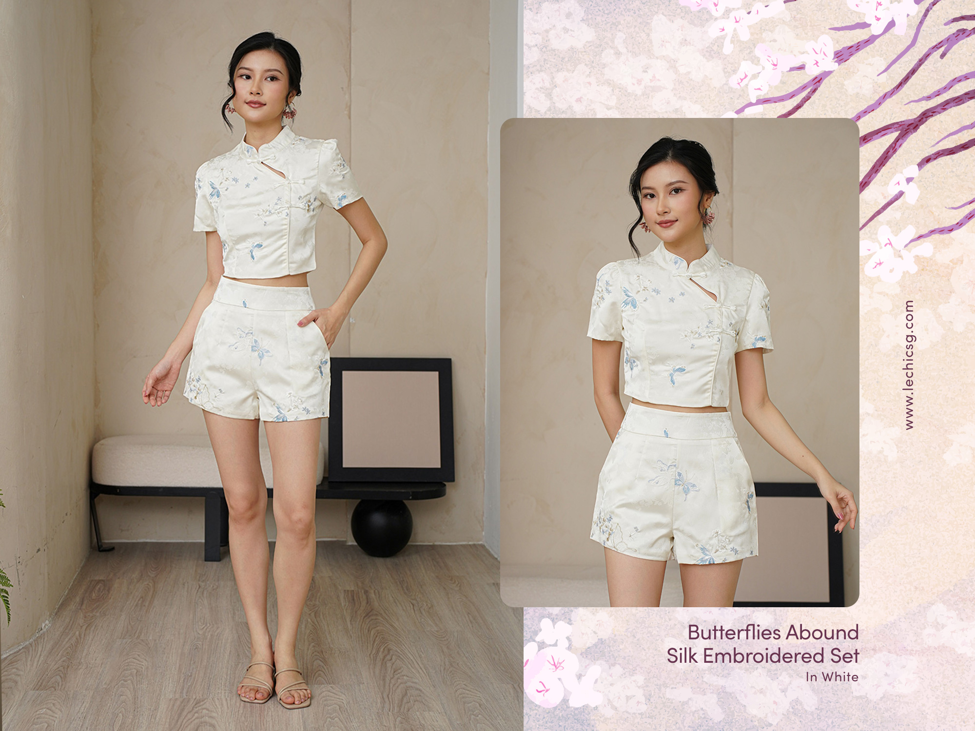 Butterflies and flowers bloom on this oriental coord set, swaying gracefully in the breeze. Paired perfectly with one another, exuding a fresh and elegant charm. Beneath the flowers, the butterflies on the fabric dances, embroidered with blue and white threads, the butterflies flutter and shimmer on the jacquard. Like a butterfly drawn to the lamp's glow, dancing gracefully in the night. Adorned with the gentle colours of light spring, the young maiden appears, wearing a bamboo hat and veil, her beauty both gentle and refined. Like the light flutter of the wings of a butterfly. The silk jacquard are heavily embroidered with butterfly motifs in a satin stitch reminiscent of what is used by traditional embroiderers. From the vibrant floral patterns to the majestic flights of butterflies, from tranquil landscapes to profound poetic and calligraphic themes, each pattern is the crystallization of artisans' wisdom, with every stitch embodying profound cultural heritage. Let us step into this beautiful world woven with silk threads and feel the infinite charm of oriental embroidery patterns. The butterflies with beautifully elongated and swirling wings fly amidst a profusion of densely woven flowers. Side pockets on shorts. Functional pankou buttons on top. Fully lined, not sheer. Exposed back zip closure for top, concealed back zip closure for shorts. Made of silk and taffeta poly blend. Comes in white and pink. Available in sizes S, M & L.