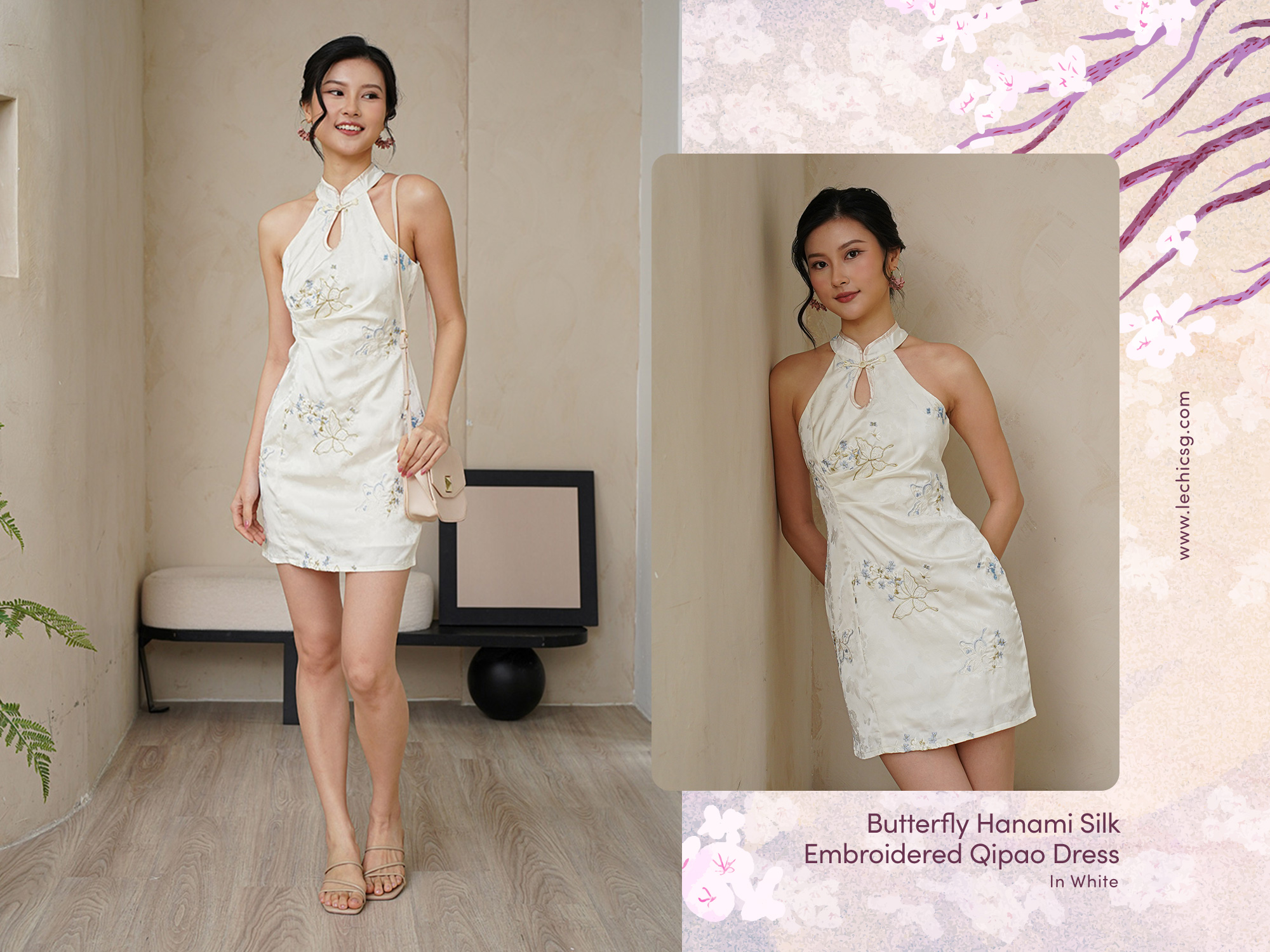 Inspired by the fluttering imagery of butterflies among peonies, the motif settles onto pink/white gambiered silk. In tailor made butterfly-embroidered silk jacquard, this delicate floral cheongsam reinterprets heritage with contemporary grace, where every stitch whispers a carefully woven tale. A modern cheongsam with soft tones and 3D floral artistry—where tradition meets timeless elegance. Adorned in a garden of silk and thread, this cheongsam blossoms with delicate butterflies—symbols of love, transformation, and joy. Each embroidered wing flutters with stories of grace and renewal, weaving tradition into every stitch. A timeless dance of elegance and heritage. The motifs symbolize femininity, growth, and nature’s quiet strength. This oriental dress is made as an heirloom piece, suited for formal occasions, portraits, or meaningful celebrations. Fine silk threads and soft, layered shading, with tonal butterflies shadowing the coloured pretty things. It captures flowers, birds, and natural scenes with lifelike depth. Adorned with hand-embroidered butterflies and floral motifs, it embodies the poetic grace of traditional Chinese aesthetics. The sleek oriental collar and tailored style honor the cheongsam’s iconic silhouette, while the lustrous satin fabric shimmers like misty moonlight over a lotus pond—an image steeped in Chinese poetry that symbolizes purity and elegance. The delicate embroidery, a hallmark of broderie craftsmanship, weaves the symbolism of butterflies (representing transformation and joy) and orchids (a metaphor for nobility and modesty in Chinese culture) into the fabric, turning the cheongsam into a wearable piece of art that bridges timeless tradition and soft femininity. Delicate oriental embroidered threads, vivid and full of classical charm, exudes the charm of a woman. Flowers and butterflies express mutual attraction and admiration, implying blooming love. Fully lined, not sheer. Inner lined shorts. Functional pankou buttons. Concealed back zip closure. Made of silk and taffeta poly blend. Comes in white and pink. Available in sizes S, M & L.