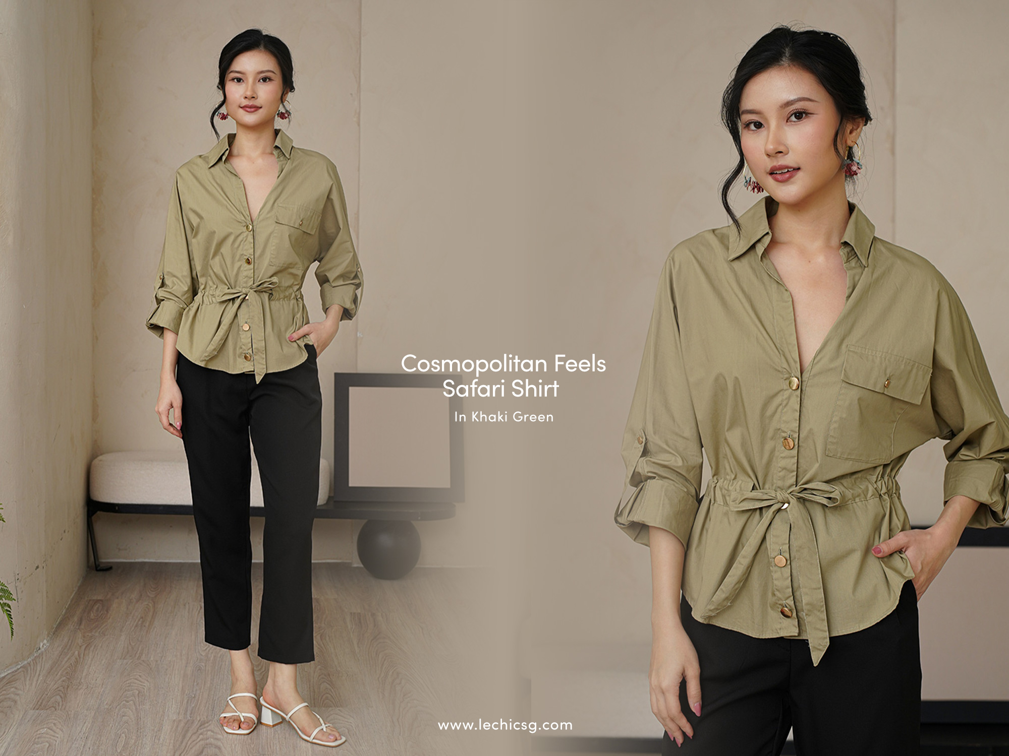 It’s all about relaxed and elegant utility. Take on all latitudes in safari-chic details such as the utility pocket, scrunched waist and button up bodice. This earthy, rugged hue translates wonderfully for a day nature-loving outdoors, and allows for easy, failsafe combinations with a neutral colour. Featuring sleeves finishing below the elbow with a turn-up, tab and button detail, a front patch pocket with flap, an adjustable tie waist and a button-up front. Make a statement with this striking safari-style shirt that combines bold design with timeless sophistication. Inspired from parka jacket styling, it features a flattering tie waist that creates a beautiful hourglass shape. Crafted in lightweight woven cotton, it features a soft cinched waist and easy rolled up sleeves for that perfect blend of structure and ease. Finished with a clean button-through front, wide cuffs and subtle shaping that gives it a draped, undone look. Style it with denim jeans, pair back with denim shorts, or layer over your favourite tees for some grunge attitude. If there's one item that's a must-have on your new season wish list, it's a safari-style shirt. A mix of utility and sophistication, this sturdy and supple safari shirt dress is accented with single chest pocket, gathered waist, and buttons. Functional buttons and functional pockets. Drawstring tie on waist. Button front styling. Made of cotton poly blend. Comes in navy blue and khaki. Available in sizes XS, S, M & L.