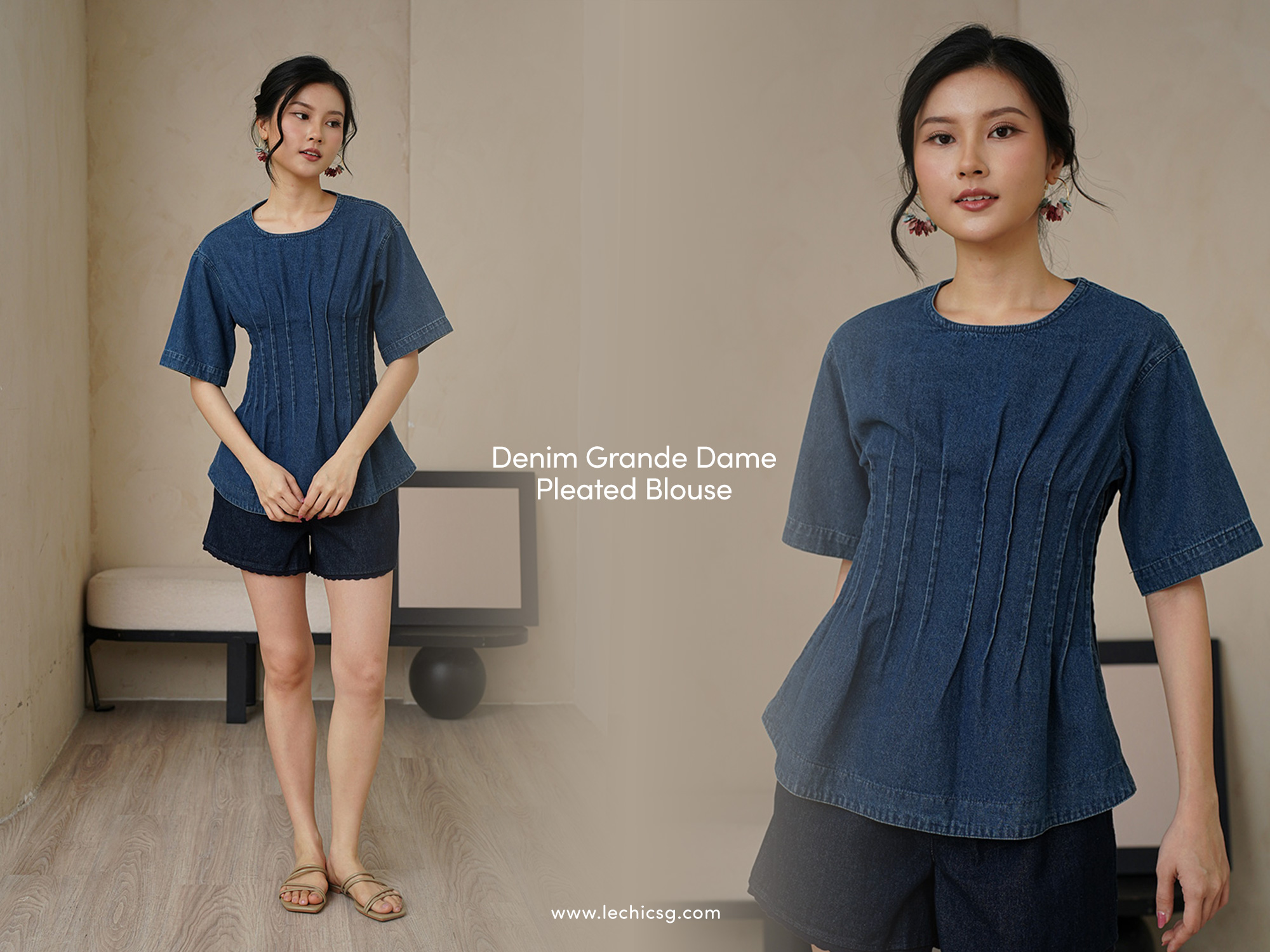 Our latest spring top ticks off two key trends of the season: cinched waists and blouse details. Add polish to your casual wardrobe with this dark indigo cinched waist peplum denim top. Featuring a tailored waist and flared peplum hem, style this piece with a matching denim shorts for a flattering and feminine silhouette. Fitted blouse in structured cotton denim with a round neckline and boxy, elbow-length sleeves. Pintucks all around and a flared peplum for a nipped-in, structured silhouette. Using a new technique that involves folding fabric into neat ornamental rows that create a focal point along the waistline. Go ahead and dress up with this top even when you're feeling bloated—we promise, there's enough room for you. The topstitching highlights the pintuck pleats on the denim shirt abounding with easy chic vibes thanks to its longer tunic silhouette that flares to the hem. It adds details with tight pintuck wrinkles and shirring. Pintuck pleats on the bodice add delicate detail, while gathers on the shoulders create on-trend fullness. Reimagined from the classic shirt, perfect for both your office days and weekend adventures, infused with a modern twist. Our new denim blouse features a collarless design with a round neckline, showcasing exquisite pintuck detailing that sets it apart from traditional shirts. Pull on styling with back keyhole closure. Made of denim cotton blend. One colour only. Available in sizes XS, S, M & L.