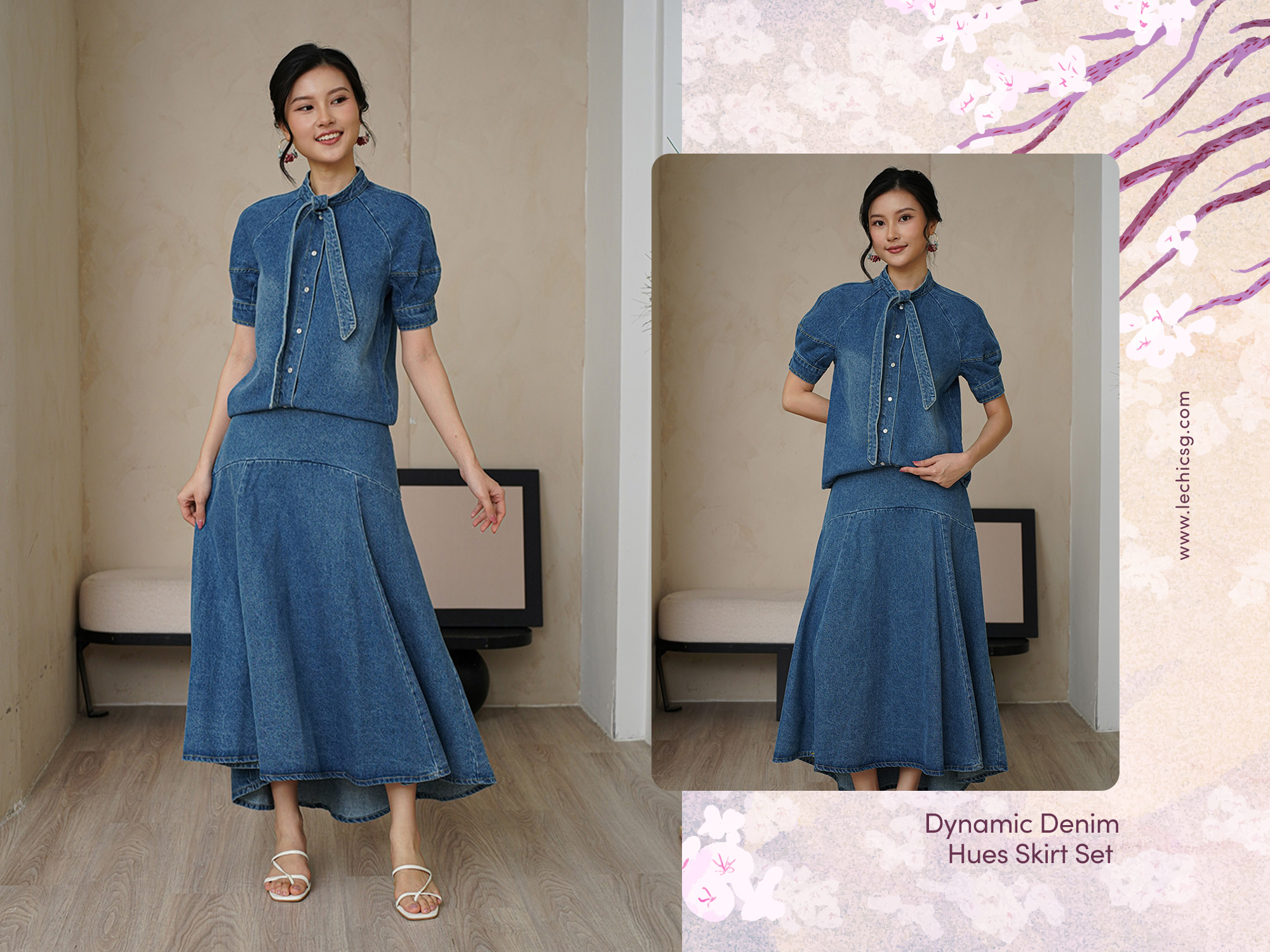 For sophisticated babes with a stylish objective, this two piece coord features cotton denim with a classic low-rise fit. A panelled design creates a trendy, drop waist-inspired silhouette that flares into a twirly, A-line midi skirt. With an adorable cut crafted from cotton denim, the denim blouse top can create infinite sunny day OOTDs. Short cuffed sleeves frame a collared tie neckline atop a trio of buttons that secure the boxy bodice. Designed for the woman who doesn't compromise on comfort and sophistication, this piece features a flowing drape and refined details. Do denim for skirt day with topstitched option cut in a swingy silhouette. We updated the classic maxi-length skirt in a lightweight chambray fabric for a relaxed look. As your wardrobe's best friend, these mix-and-match pieces work with everything in your closet. Designed with a structured collar, short sleeves, button-down front, this utility-inspired silhouette is both functional and flattering. Contrast topstitching and a long tie emphasize the collar line without disturbing the simplicity of the silhouette. A considered indigo skirt designed to stay in your wardrobe for years, shifting between everyday wear and more dressed-up moments. Explore the artful potential of a complete denim set, a contemporary skirt and top pairing. The right denim co ord delivers that confident, put-together feel for any agenda, acting as a versatile foundation you can build upon or wear simply as is. It's about making a considered statement without the fuss. Functional buttons and on sleeve cuffs. Attached neck tie to top. Button front styling for top, exposed back zip closure for skirt. Made of denim cotton blend. One colour only. Available in sizes XS, S, M & L.