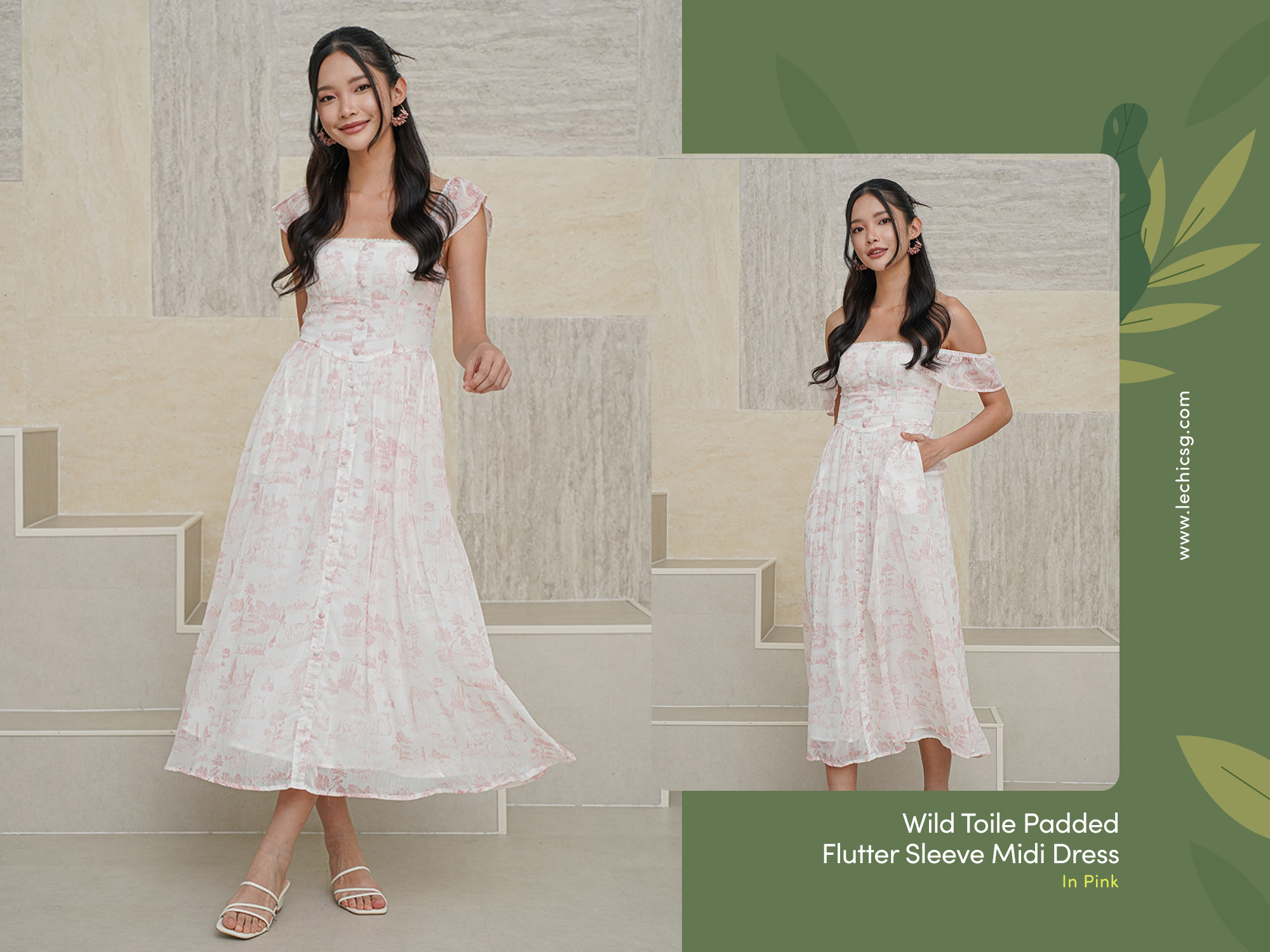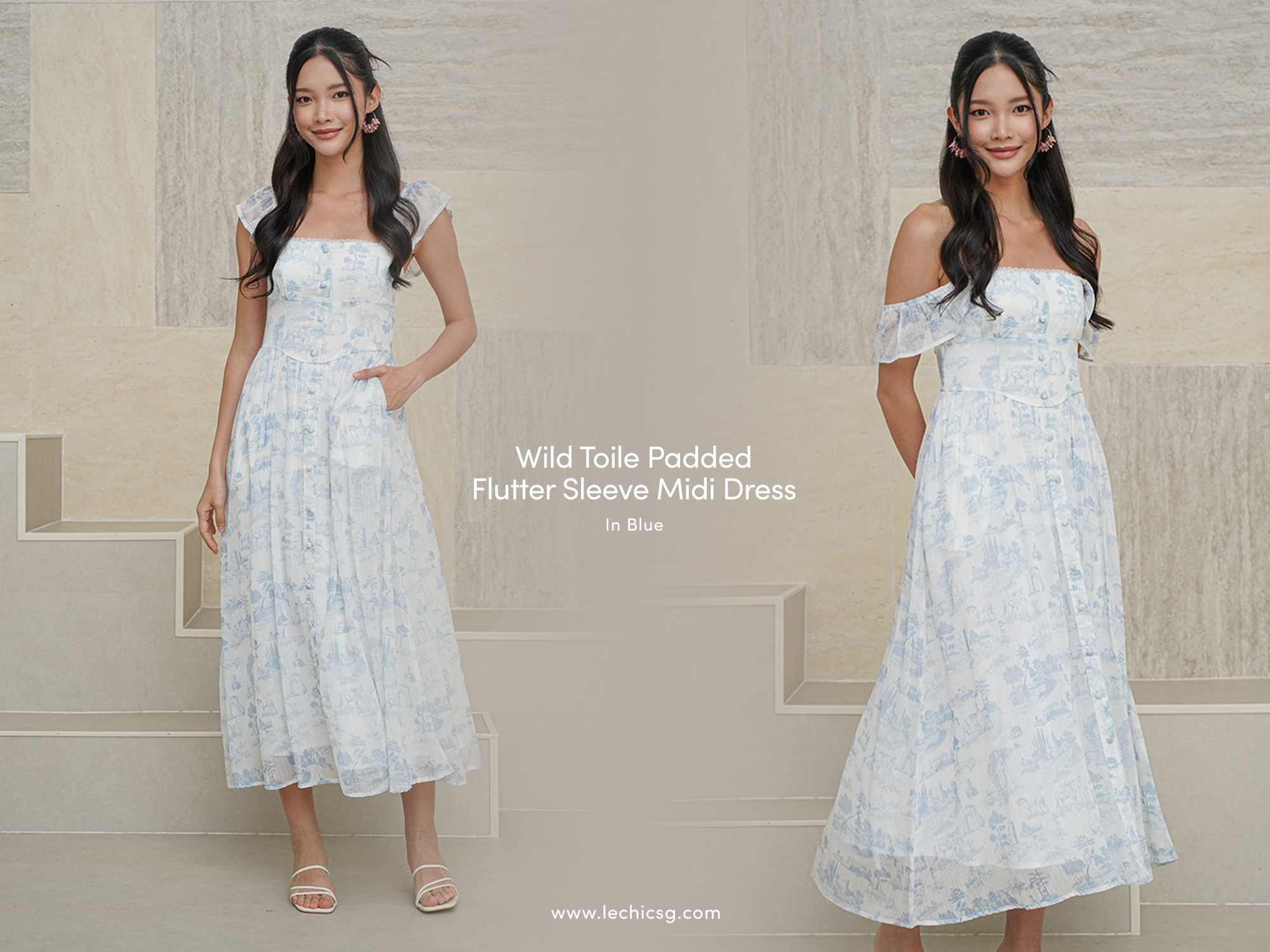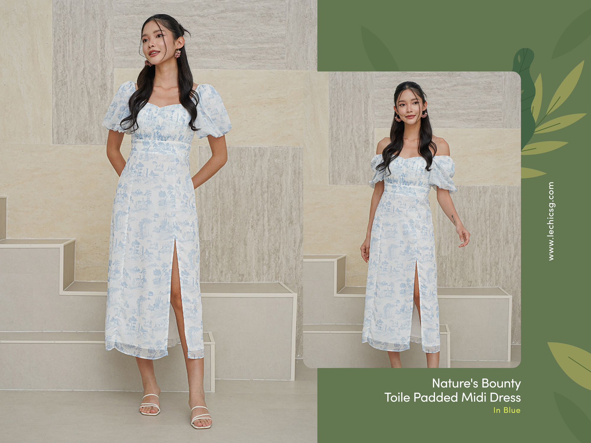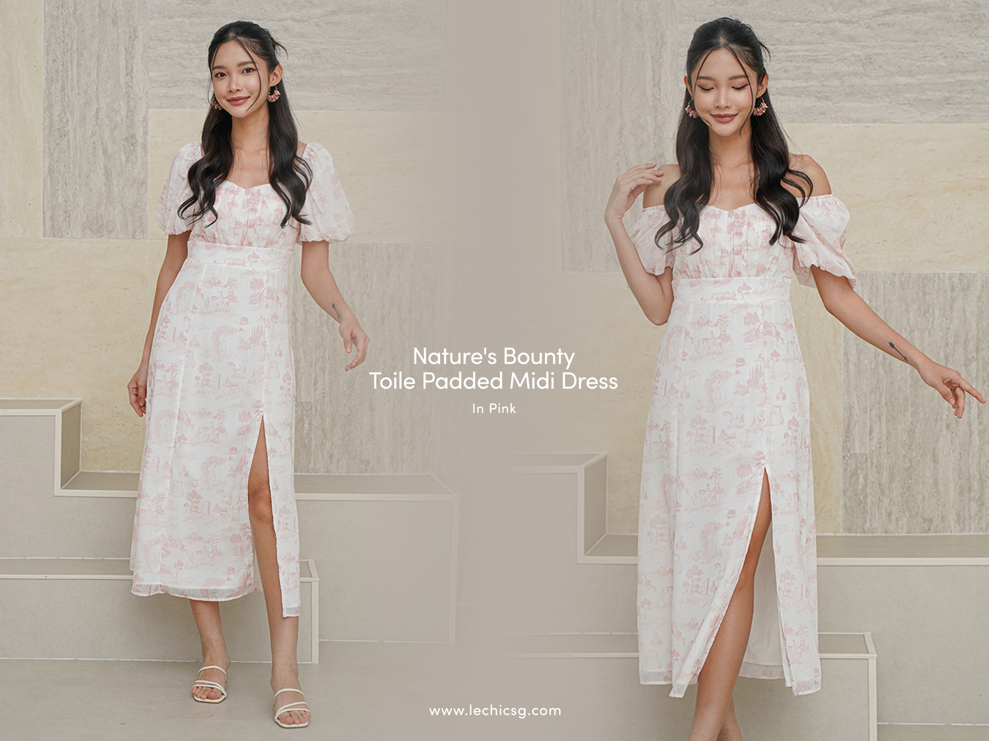 Light, airy, printed fabric with scenes of pastoral life, mythology, exotic travel, flora, and fauna, verging sometimes on the whimsical. It provides a gentle uplift to a person’s imagination. Enrich your repertoire to prepare well for the new season's evenings with this gorgeous toile printed number from our latest collection. Printed across a beautifully shirred neckline and a column silhouette with a slit. Beautifully tailored in premium cotton for a luxurious softness and feel packed with fine sheen and excellent drape, it's modern print pattern and trendy sweetheart design should get you bouquets of compliments. Enjoy hot days to the max with this pretty midi dress! Its shirred neckline and short puffy bubble sleeves will add a romantic touch to your outfit. You will love its ruched bodice and its A-line cut as they will highlight your beautiful silhouette. A soft, feminine piece made for daydreamers. Adorned with a delicate toile pattern in watercolour inspired pastel hues, this dress features a flattering neckline and voluminous puff sleeves that channel timeless vintage elegance. The gently gathered bodice creates a sculpted shape, while the flowing A-line skirt adds graceful movement with every step. Whether you're attending a garden wedding, brunch, or an afternoon picnic, this dress offers elegance with ease and charm. The easy choice for weddings and soirees of any kind, this will take you anywhere, and present a quiet confidence without upstaging the host. Padded at bust. Elasticised neckline. Bubbled sleeves. Smocked at back. Fully lined, not sheer. Concealed back zip closure. Made of cotton polyester blend. Comes in pink and blue. Available in sizes S, M & L.