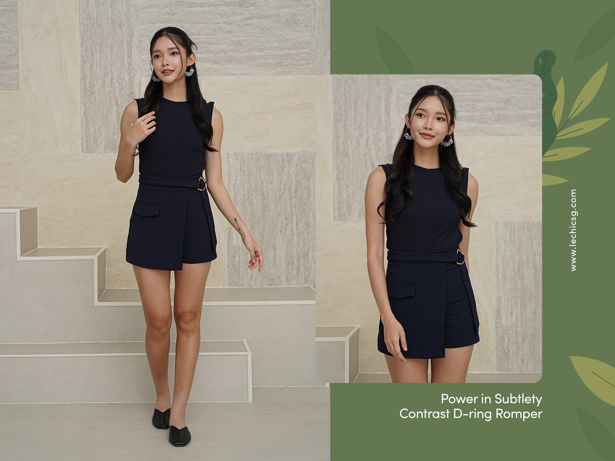 Contrasting textures between the stretchable knit-blend tank top and the structured bottom create a refined two-piece effect that elevates the overall look. Functional left-shoulder button closure offers a unique twist on conventional design; Minimalist chic with a polished twist — this sleeveless mini dress skort romper brings subtle military vibes with its gold shoulder buttons and flap pocket detail. The fabric hugs the upper body in a soft ribbed knit while the skirt adds structure with a tailored cut and belted waist. There is a D-ring buckle affixed to the side of this number, adding a touch of brass to the royal navy. Dress it up with heels or keep it smart casual with loafers for an effortlessly put-together look. Designed with a cinched waistline, signature double d-ring belt, and a softly flared skirt, it sculpts the body with quiet strength. Ideal for defining your presence across seasons and occasions. Experiment with proportions this season with a pair of fitting skorts. The skorts coverage underneath allow for a shorter, more snug and fitted look that would otherwise not be possible with a dress-only ensemble. This is why we love the skorts for its flattering feminine fit and fuss-free convenience. This results in a fitted look that follows your curves more closely and a hem-raising cut that accentuates your legs. Adorned with this season's hottest D-ring accessory, this piece boasts an understated stylish appeal. In a single-toned navy, it has D-ring adjusters at the side for an understated touch of metal, a contemporary foldover origami design, and finished in an asymmetrical finesse. Comfortable and sturdy, add an understated finish to your wardrobe now. Functional buttons. Decorative pocket flap on skort. Attached D-ring sash belt at the side. Concealed side zip closure. Made of knit cotton (top) and polyester cotton blend (bottom). One colour only. Available in sizes XS, S, M & L.