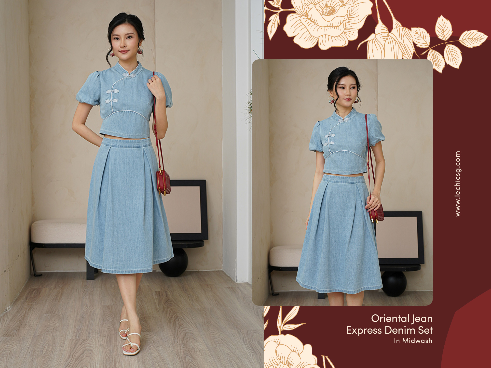 Rebel looks, heritage roots. A denim cheongsam, why not? In a beautiful clean oriental fit with tonal contrasting pankou embroidery floral knots, go glam with that extra bit of x-factor. Capturing the enduring retro inspirations of the oriental Qipao, and then made in a gradient wash of chambray, shaped with a high-rise waist and pretty fit. Sturdy, faded denim with classic tonal stitching and seaming composes this street meets east cheongsam, which gains a contouring fit and eye-catching look with its framing seam details. Our exclusive denim fabric infused with soft spandex smooths out your curves and stretches out to provide a snug fit. The washed denim blue cheongsam dress with novel tailoring and unique style well combines traditional classics and modern fashion. The hand-stitched embroidery fasteners adjacent to the cheongsam collar reflects the Neo-Chinese style and fashionable personality. It also showcases the traditional fit and craft of the Chinese dress. Crafted from soft and comfortable cotton denim, this dress maintains traditional aesthetics such as the mandarin collar and knot buttons, while also offering a contemporary and fresh look that is perfect for any occasion. The combination of Chinese chinoise elegance and western denim is casual and elegant, and provides an interest and a renewed take on the festival. This cute coord is a fusion of Chinese tradition with modern style. Functional pankou buttons on top. True bubbled sleeves for top. Fully lined, not sheer. Exposed back zip closure for top, concealed back zip closure for skirt. Made of denim cotton fabric. Comes in darkwash and midwash. Available in sizes S, M & L.