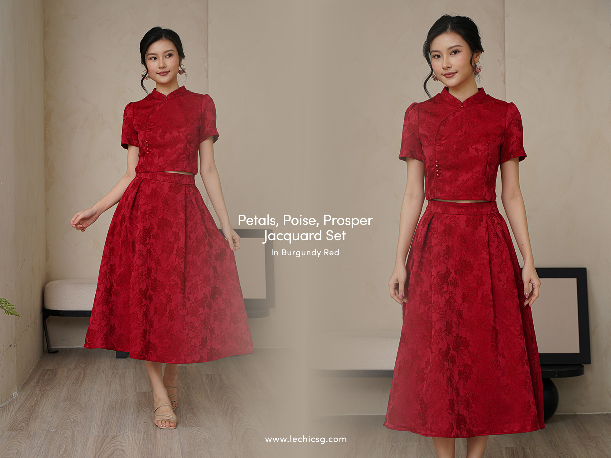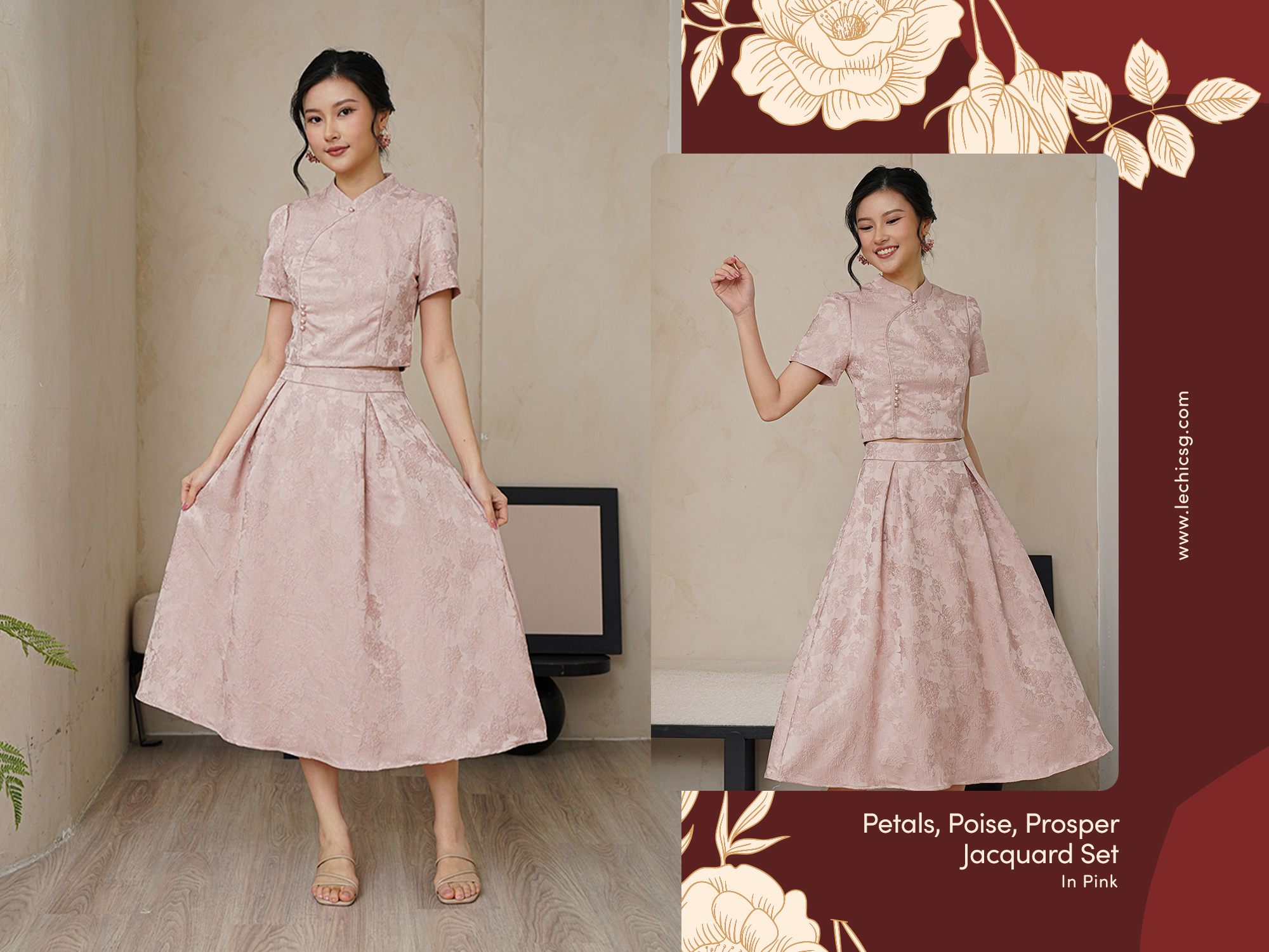 Inspired by the modern oriental aesthetic, every thread and pattern is a tribute to traditional culture. The jacquard craftsmanship makes the patterns on the skirt come to life, as if you can hear the murmurs of ancient weavers. Wearing it is like traveling back to that poetic and picturesque era. Crafted from an exquisite tonal florals jacquard fabric, blending soft pastel pink hues and also festive red, with woven motifs that create a subtle, lustrous sheen. Natural-rise skirt with structured front pressed pleats that form a voluminous silhouette, back zipper closure, full lining, and ends midi length. Designed to celebrate your silhouette, it tapers elegantly at the upper body before flaring out from the waist, adding a playful touch. The Chinese collar and a tasteful pearl button neckline offer traditional sophistication, while the short sleeves keep it fresh and modern. This Qipao set is perfect for showcasing grace with a hint of youthful charm. Made from brocade woven with delicate florals - the subtle embroidered threads catch the light so beautifully. It has an A-line silhouette enhanced by sharp pleats and dainty pearl buttons along the front of the top. The Jacquard fabric enhances its luxurious appeal, offering both sophistication and timeless style. Its modern oriental-inspired design, combined with jacquard detailing, will let you radiate eastern mystique even in the sweltering heat. Decorative buttons on top. Fully lined, not sheer,. Exposed back zip closure for top, concealed back zip closure for skirt. Made of jacquard woven cotton fabric. Comes in burgundy red and pink. Available in sizes S, M & L.