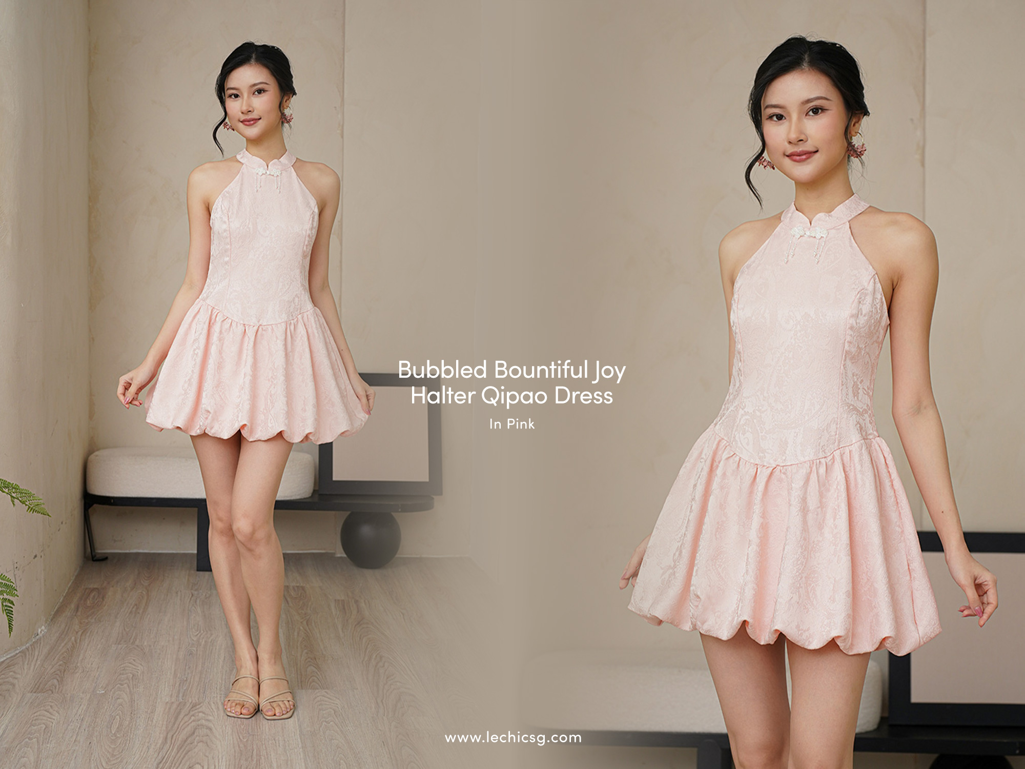 The burgundy woven jacquard offers a confident profile, its refined halter neckline creating a clean line that leads into a precisely tailored bodice adorned with an ornate tonal jacquard pattern. A dramatic puffball skirt provides striking volume and movement, culminating in a short, impactful hem. This is festive wear, perfected with self-assured style. Crafted from woven jacquard, it feels light and feminine while adding beautiful texture to your look. The cinched waist and A-line mini silhouette create a naturally flattering shape, giving you an effortless hourglass effect. Seamlessly fastened with an invisible zipper, the dress stays charming in every view. The bubbled hem design at the bottom is combined with tonal jacquard for richer details. The dress - skorts design is safe and gives a sense of subtly showing skin, endowing girls with elegant charm and a strong sense of security. Make an entrance with a silhouette that redefines festive. Command every room with an undeniably artful silhouette as the woven jacquard halterneck dress redefines the festive. This piece showcases a refined halterneck leading into a cinched bodice, before dramatically blossoming into a voluminous bubbled skirt; the subtle jacquard weave adds a discreet layer of detail to its confident structure. To curate a look that truly owns the moment, opt for sleek stiletto heels and delicate stud earrings, letting a minimalist clutch bag provide the perfect finish, ensuring this piece sets the standard for an entrance that’s truly unforgettable. Inner lined shorts, bubbled hem. Fully lined, not sheer. Concealed back zip closure. Made of jacquard woven cotton fabric. Comes in burgundy red and pink. Available in sizes S, M & L.