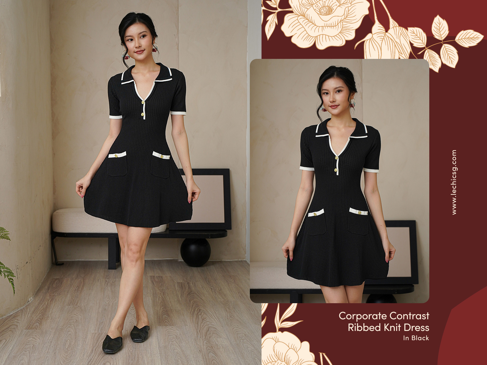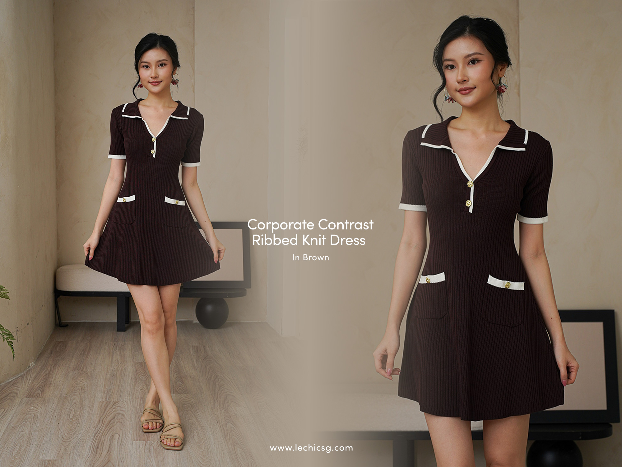 Both classic and preppy, this dress is rib-knitted with touches of knit and cotton, it has a fit-and-flare-shape and a contrasting white collar, sleeves and pockets. The gold functional buttons mean you can keep your jewelry to a minimum. This dress is designed in our fan-favourite silhouette: a flattering mini A-line skirt with short sleeves and a v-shaped neck. Made from knit cotton fabric, this piece features contrasting flap deco pockets with golden roman stud buttons. This T-shirt dress features a classic fit, highlighted by contrasting piping for a playful touch. The ensemble is a mod marvel, offered in a mini shift silhouette. The sartorial essence of grain de poudre knit enhances the silhouette and the details of this dress, like the gold-tone buttons and contrasting colours, enhance its iconic character. The textured knit fabrication provides both comfort and structure, while functional front pockets and buttons enhance its practicality. Sweeten sweater dress season in a cotton-kissed option accented with monochrome styling and knit to a leg-baring length with crisp, clean ribbing fabrication crafting the clean look. Functional buttons. Pull on styling. Made of cotton knit blend. Comes in brown and black. Available in sizes S, M & L.