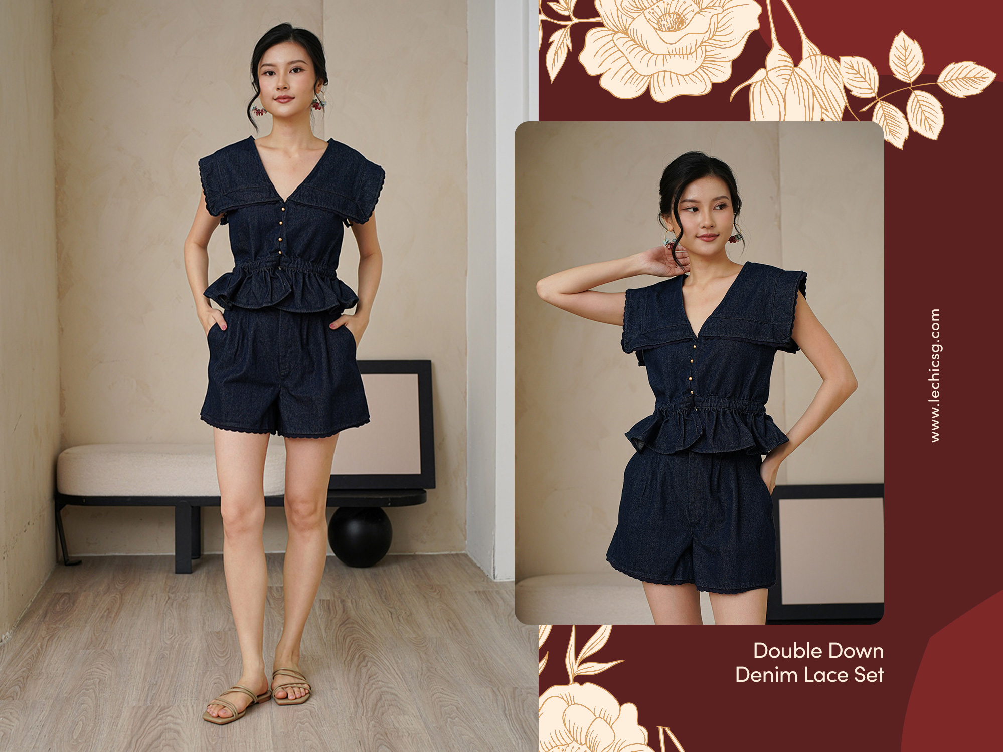 Chambray and Chantilly, combined. This chic set combines the casual vibe of denim with the delicate touch of lace, offering a perfect blend of style and comfort. The denim shorts feature lace trim detailing at the hems, while the matching top adds a feminine flair with its lace accents along the yoke and sleeves. Lace accents in matching indigo tones combined with a V-neck perfectly balance a sweet yet edgy style. The short sleeves add a touch of sophistication while the denim fabric gives it a trendy edge. Cut with directional detailing for a sculpted finish. Designed with an asymmetric lapel neckline and cap sleeves, it frames the silhouette with modern edge. Structured yet feminine, this top balances sharp tailoring with feminine definition—perfect styled with denim or tailored separates. Additionally, accents like its lace details, and tiered ruffle layers are seamlessly incorporated to give each piece a subtle edge. Decorative buttons on top. Comes with side pockets on shorts. Pull on styling for top, hidden zip fly with button closure for shorts. Made of denim cotton poly blend. One colour only. Available in sizes XS, S, M & L.