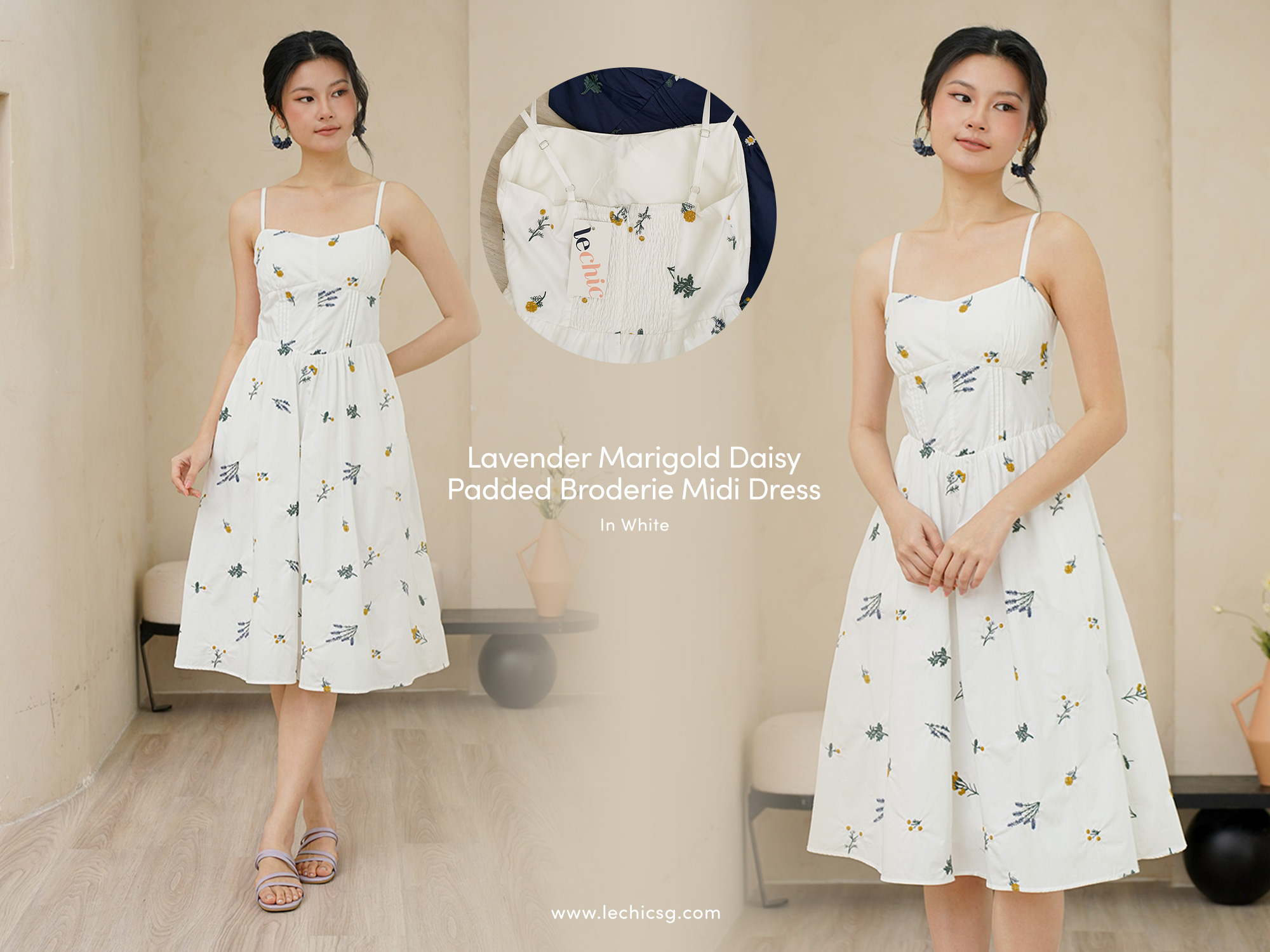 Padded at bust. Evoking the look of a meadow in full bloom. The dramatic florals are allover the dress in concentrations of lavender, marigolds and daisies, cascading delicately down the skirt towards the hem. Thoughtfully designed with a structured full A-line skirt and playful pockets, this piece is both timeless and enchanting. Sun drenched days call for a sundress as pretty and versatile as this, cut from crisp cotton embroidered with dainty florals, it features padding at bust and corsetry to cinch the waist, dainty pintuck trims along the waist and the game changer - secret side pockets! What more can a girl ask for? The gathered flare skirt gives that dreamy, twirl-worthy movement that's oh-so-charming. The mesmerizing lavender broderie in lilac and marigold daisies in cream-white light yellow hues adds an enchanting touch. With a gathered skirt and padded neckline, this dress is a force of nature, exuding a whimsical and free-spirited vibe and emanating cheerful spirit. Aligned with that optimistic approach, this dress is embroidered allover with whimsical floral garden broderie. Slow down — leisurely days call for a little swish and flow. This broderie number is your breezy solution that fits, flares and flatters. Take a stroll and watch those ditsy florals flow with every step. An absolute midsummer daydream, in dress form! The pleated waist design presents ingenious details, in romantic colourways, adding a touch of femininity and agility to the quiet and elegant blue or white tones. The dress captures our gaze with a mosaic of ditsy florals dipped in vibrant lemon hues, cascades of forest vines that dance alongside bursts of yellow hued flower motifs. Then, for a final dusting of magic, it is dotted with floating broderie motifs entwined within the fabric. Padded at bust. Fully lined, not sheer. Adjustable straps. Comes with side pockets. Made of cotton linen rayon. Comes in navy blue and white. Available in sizes S, M & L.