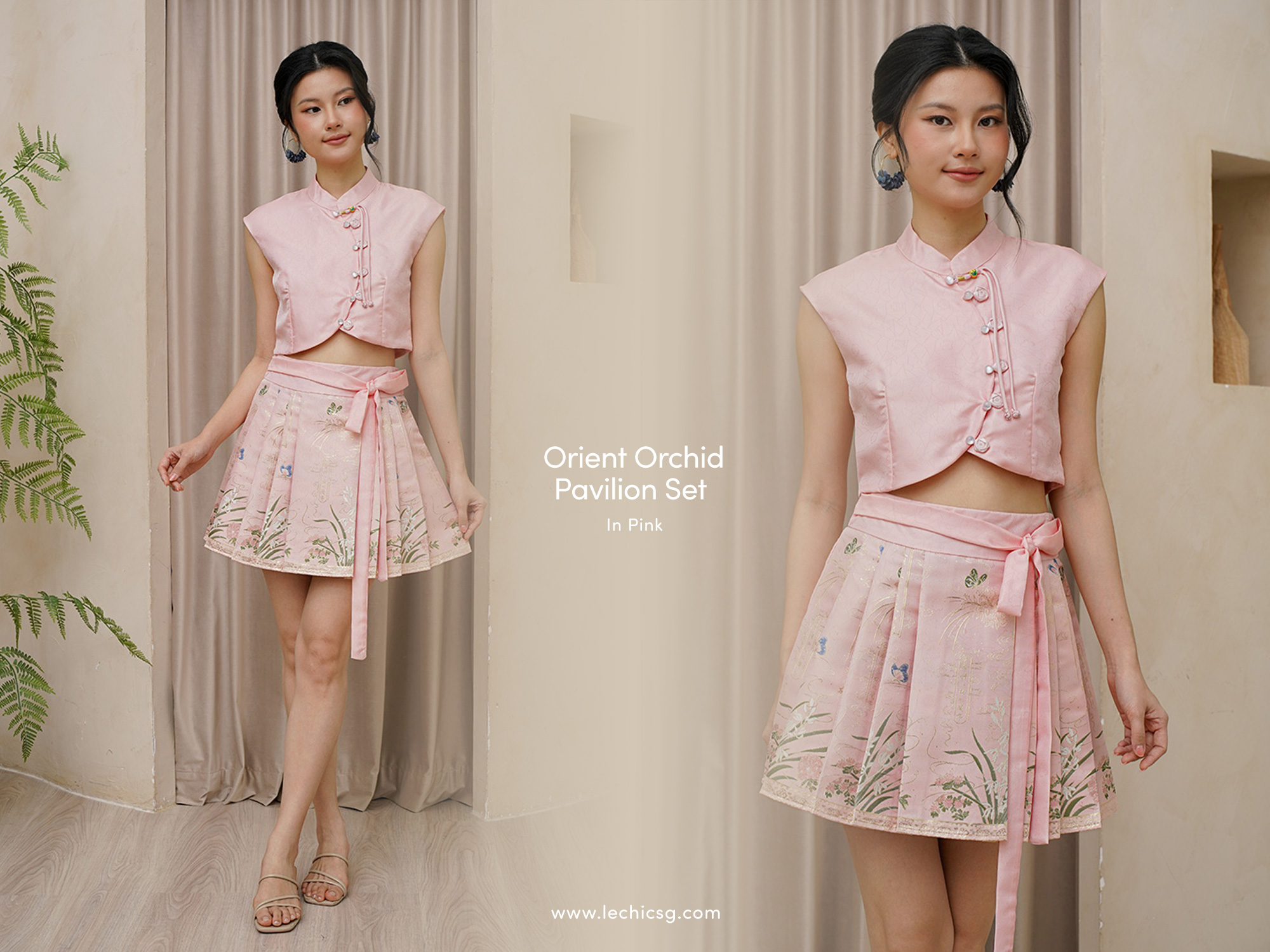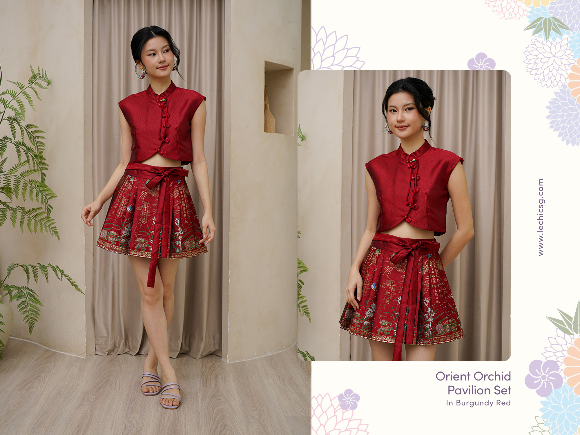 Delicate embossed texture, timeless elegance, and refined oriental charm. Inspired by Chinese mythology, features pure orchids, lilies, noble phoenix motifs, and graceful butterflies in motion, along with swirling gilded Chinese calligraphy. The Orchid Pavilion Gathering, also known as the Lanting Gathering, was a cultural and poetic event during the Jin dynasty of the Six Dynasties era. This event itself has a certain inherent and poetic interest in regard to the development of landscape poetry and philosophical ideas. This print arose as a close study of Falangcai porcelains — their painterly finesse, layered colours, and East–West sensibility. Reimagined through the lens of our Garden City, orchids and foliage unfold with a lighter, Nanyang rhythm. Printed on luminous duchesse, the motif travels beyond dress — becoming a living experience. The top has a very subtle tonal textured butterfly and floral jacquard weave, set to uplift your look instantly. A darkly romantic fusion of Chinese aesthetics and avant-garde spirit. This coord number features an asymmetric button placket on top with glassy cat-eye buttons, and it’s curved style highlights bodily proportions. Finished with printed box pleated skirt with attached sash tie. The matching box pleated skirt, cut from fluid fabric, skims the figure and moves with rhythmic grace. Layered over it, the cropped vest top with a mandarin collar and asymmetric button placket nods to traditional tailoring, while a subtle inverted V at the hem echoes the exposed skin beneath. The skirt is rounded up with a gilded tapestry trimming at the bottom to close off the festive look. The skirt’s orchid motif and asymmetric layered tonal top recall silhouettes in the night, as black and crimson/pink collide in a striking interplay of classical poise and modern edge. Gorgeous gold threads are intertwined on red/pink to carve butterflies and phoenixes, which vividly portrays Chinese colourful civilization and auspiciousness. Fully lined, not sheer. Skirt inner lined with shorts. Functional buttons. Button front styling for top with collar tie, concealed back zip closure for skirt with attached sash tie. Made of silk embroidered duchesse and cotton. Comes in pink and burgundy red. Available in sizes S, M & L.