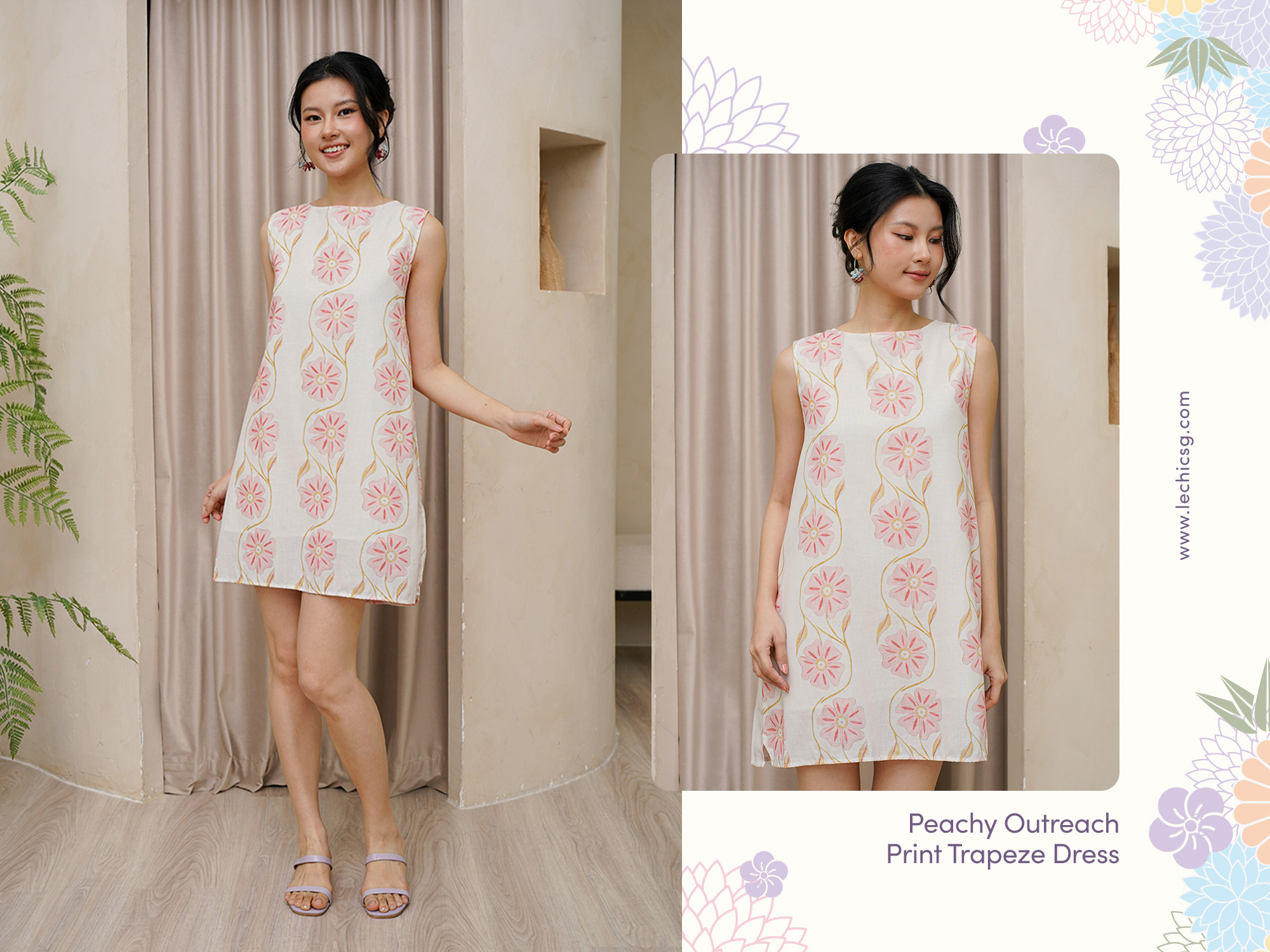 This peachy pink floral printed sundress is cut from crisp linen with a soft cotton lining, finished in a blooming print you won’t find anywhere else. Its relaxed A-line trapeze shape, and back keyhole keep things easy but far from plain. Wear it like you just threw it on - even if you didn’t. Breathable linen–cotton blend featuring an exclusive placement print. It showcases a wide, rounded neckline with a keyhole at the back. The relaxed shift silhouette offers a comfortable and flattering fit, making it the perfect choice for effortless day-to-night styling in warmer weather. it features a vintage style trapeze silhouette with a round neckline + a vibrant geometric floral pattern. The cheerful summery mosaic style print is sure to put you in a peachy summery mood! Fully lined, not sheer. Pull on styling with back keyhole closure. Made of cotton linen poly blend. One colour only. Available in sizes S, M & L.
