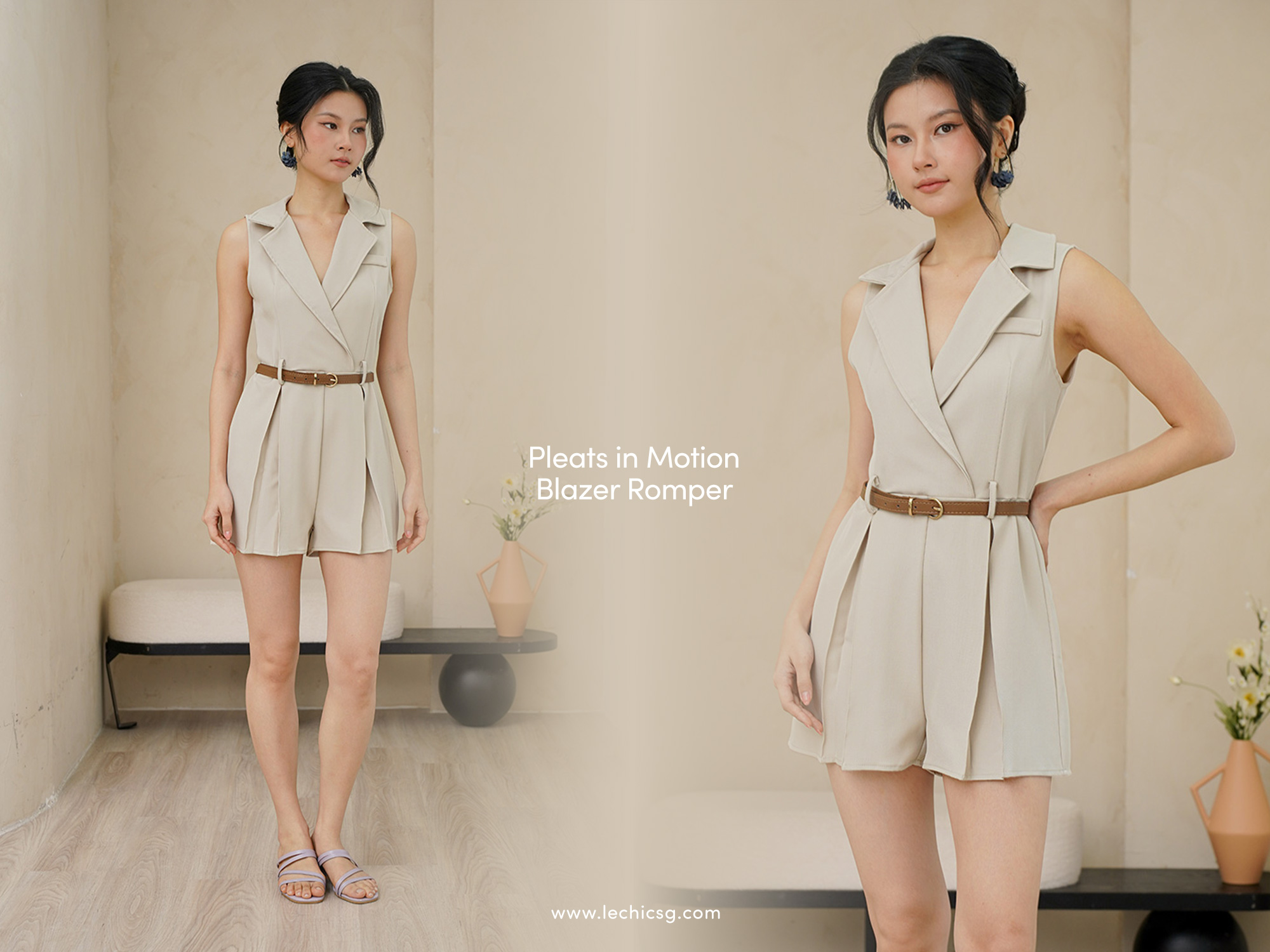 A blazer collared romper to keep you looking sharp while keeping you comfortable on the go. It comes with a waist-cinching mock leather belt for added structure to your look, a halter-neckline to flatter, and box pleat details. Designed in a versatile oatmeal/khaki shade, our tux inspired playsuit features clean seam details, a matching brown leather belt and falls to a modern pleated leg. A tuxedo inspired silhouette featured on a playful skort romper, this contemporary style combines sartorial with casual dressing, complete with a cute romper style. Add a pop of panache and polish to your wardrobe with this chic tuxedo style romper with chic front lapels, topped off with a chic belt for extra polish. Dress up easily in dapper style that is sure to elicit smiles. Work major androgyny chic vibes in this sleek tuxedo style romper that offers modern, edgy styling in crunch time. A vintage style with modern edge, this sophisticated sleeveless romper features a surplice neckline and a romper cut to showcase your legs. The pleats strategically placed pinpoint a defined waistline to figure flattering effect. Concealed back zip closure. Made of quality cotton twill. One colour only. Available in sizes S, M & L.