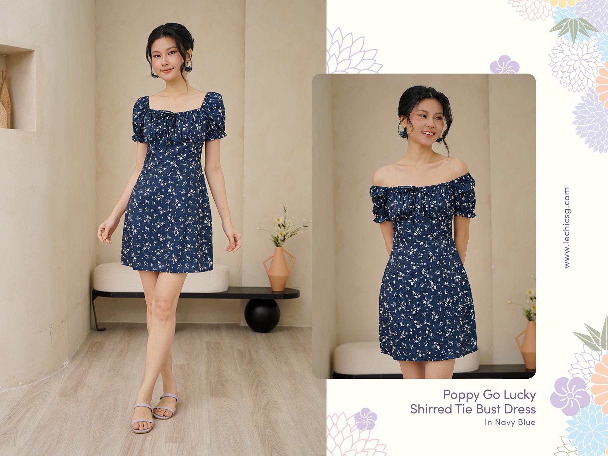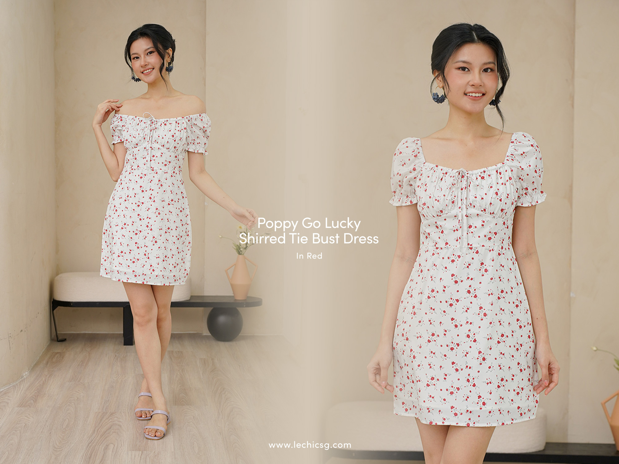 Spotlighting a penchant for the milkmaid prairie style, this shirred tie bust ditsy floral dress is decorated with a garden of whimsical poppy florals and is an utterly romantic piece. The shirred tie bust detail ensures that your shape stays in place and is not lost in the pretty florals composition. It also makes for a very flattering bustline and decolletage. Lovestruck – anyone who lays eyes on this pretty summer dress would become just so. Even if not for CNY, it is also so perfect for Valentine’s Day or beyond. This summery mini dress can be worn on or off the shoulders and is adorned in an awestruckingly pretty floral print on a romantic white or navy base. It has a softly elasticated shirring bodice and a loose hanging skirt to keep its silhouette a little loose and relaxed. Master feminine daytime dressing in this. We love this styled with low heels, sun-kissed skin and salt-tousled waves. Fully lined, not sheer. Elasticised neckline and sleeves. Tie string at bust. Concealed back zip closure. Made of smooth cotton viscose. Comes in navy blue and red. Available in sizes S, M & L.