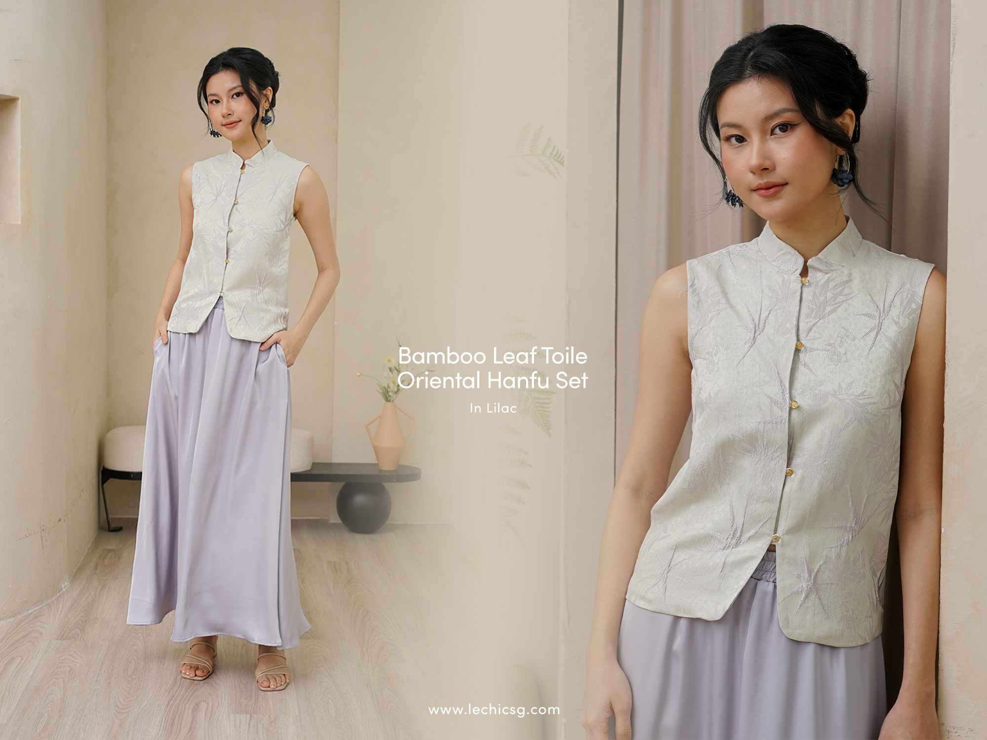 A pairing that speaks softly but stands strong. Adorned with delicate orchid and bamboo toile embroidery, embodies the elegance of Chinese literati aesthetics. This is the first time we did a bamboo themed on toile. The lustrous duchesse silk fabric and mandarin collar pay homage to traditional cheongsam craftsmanship, while the champagne and purple hue symbolizes nobility and prosperity in Chinese culture – a perfect fusion of oriental grace and timeless sophistication. Inspired by the resilience of bamboo and the poetic rhythm of calligraphy inspired ferns, each piece features delicate structure, like patterns that flow gracefully across the fabric, celebrating harmony and the beauty of inner renewal. This coord set features a soft duchesse silk base with delicate golden and pastel embroidery depicting serene bamboo landscapes. The intricate design creates a tranquil, almost ethereal feel, while the piping and button closures offer a sophisticated, modern twist to the classic style. This sleeveless vest is perfect for layering over different pieces, adding elegance and depth to any outfit, whether for casual or formal occasions. A beautiful fusion of traditional craftsmanship and contemporary style, the vest is a timeless wardrobe addition. Made from luxurious toile embroidered fabric, the vest features a soft, textured pattern that adds depth and dimension to the light colour. A harmonious blend of heritage and modern refinement, the bamboo garden toile is a serene expression of Eastern elegance. The bamboo jacquard pattern evokes calm and natural rhythm. Traditional frog closures and a mandarin collar lend cultural authenticity, while the sleeveless silhouette keeps it versatile and contemporary. Layer it over crop tops or tonal shirts to channel an understated sophistication with quiet confidence. The skirt silhouette is high waisted with a billowing, full length skirt. Features include elasticated waistband, it is loose and flared with an irresistible silky texture, the long skirt in duchesse will turn any occasion into an unforgettable moment. The pristine aesthetic and neat elasticated insert on the waist channel mellow stylishness and up–to–date appeal suffused with all the allure of yesteryear. This exquisite 100% duchesse silk flowy maxi skirt is a testament to refined style and elegance. The sway of the fabric is mesmerizing, gracefully moving with your every step. The fluid sheen of the silk reflects light in a delicate, captivating manner. The smooth silk gives it a flattering, elegant drape, perfect for any occasion where you aim to impress. Very premium material. Fully lined, not sheer. Glassy clear cateye buttons. Comes with side pockets on skirt. Fully functional buttons. Button front styling for top, pull on stretchy smocked band styling for skirt. Made of silk embroidered taffeta satin blend. Comes in champagne gold and lilac. Available in sizes S, M & L.