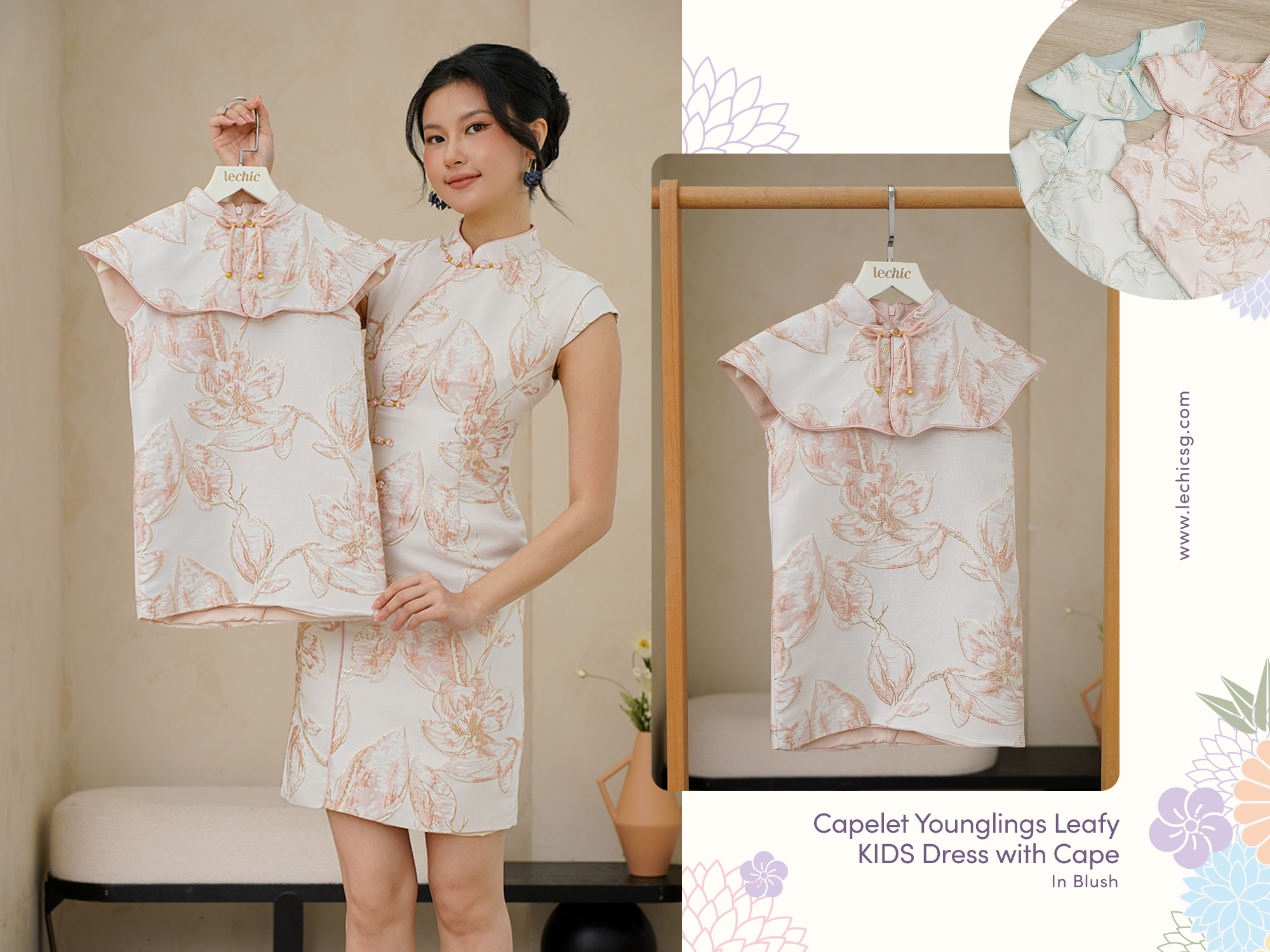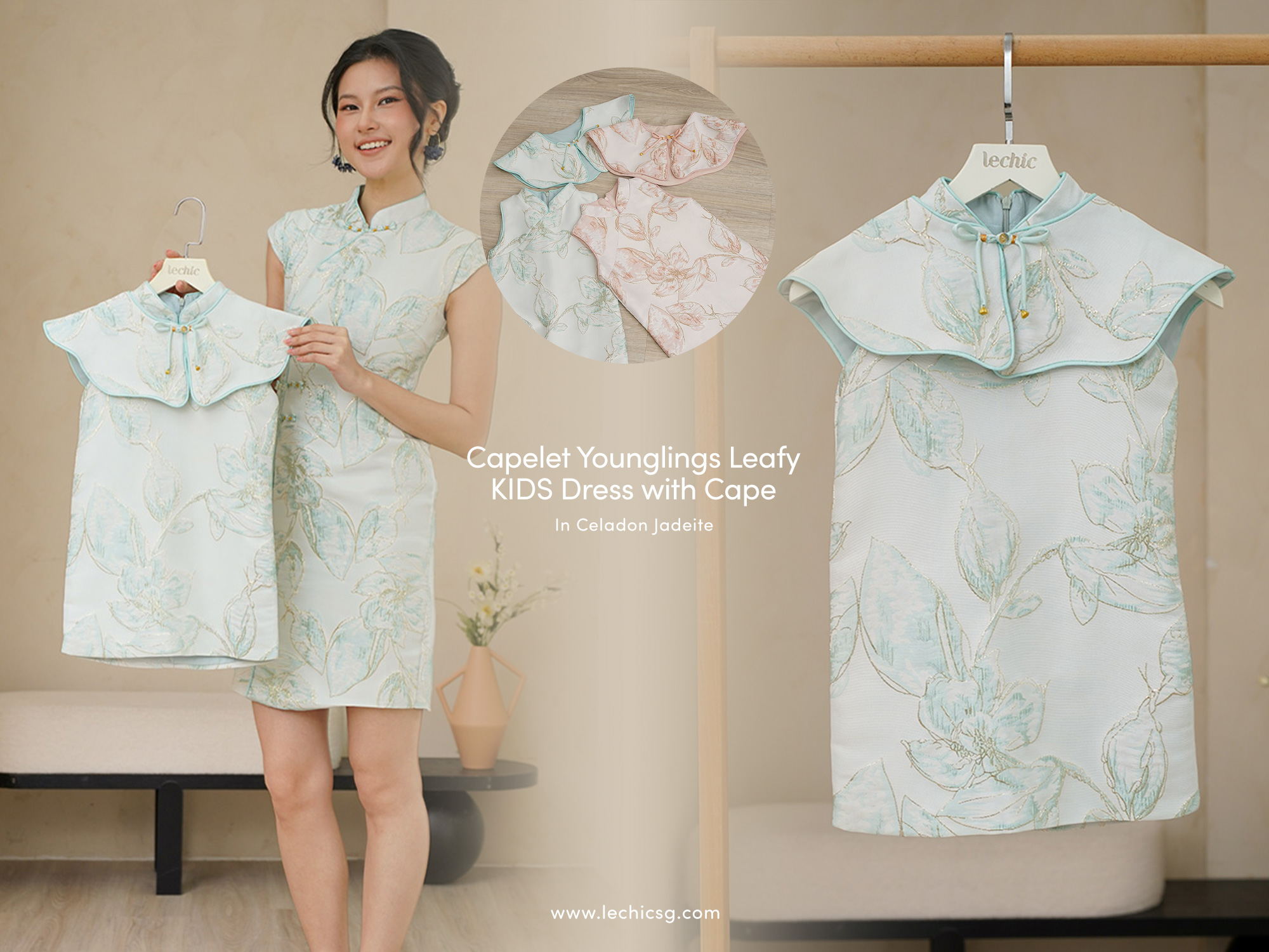 Designed as the kids version of our Gold Leafy Foliage cheongsam dress, this piece is made from the same floral gold pressed papersilk and completed with matching delicate cape—making CNY. Exuding an air of regal aura, this dress incorporates gold threads into the weave, creating a radiant, shimmering effect that catches the light. Designed with intricate embroidery, it features delicate gold floral patterns, exuding an aura of grace and charm. Featuring brightly coloured jacquard, brocade trimmings and pastel colours that appeal to the younger cohort. Complemented by a cute cape pairing made from the brocade’s fabric, the cape can serve as a little bib or as a little play companion for your little one too! The sleeveless flare cut dress is flattering to all your little sweet younglings. Fully lined, not sheer. Detachable cape with functional button pankou and ribbon tie. Concealed back zip closure. Made of silk embroidered taffeta blend. Comes in jadeite mint and blush pink. Available in sizes 110, 130, 150.