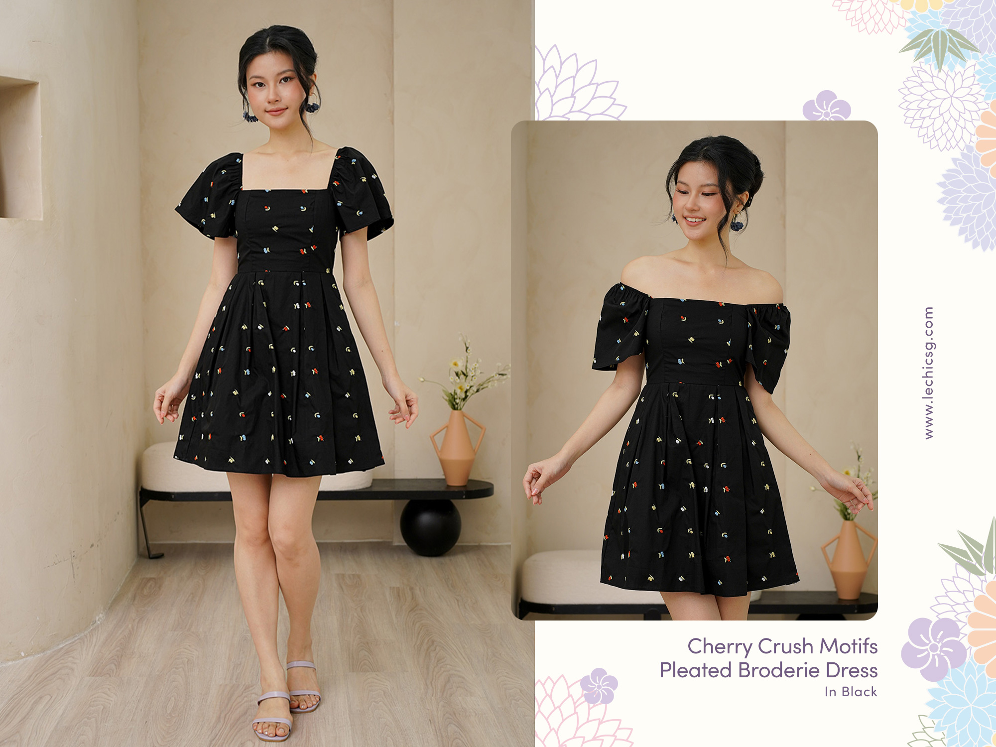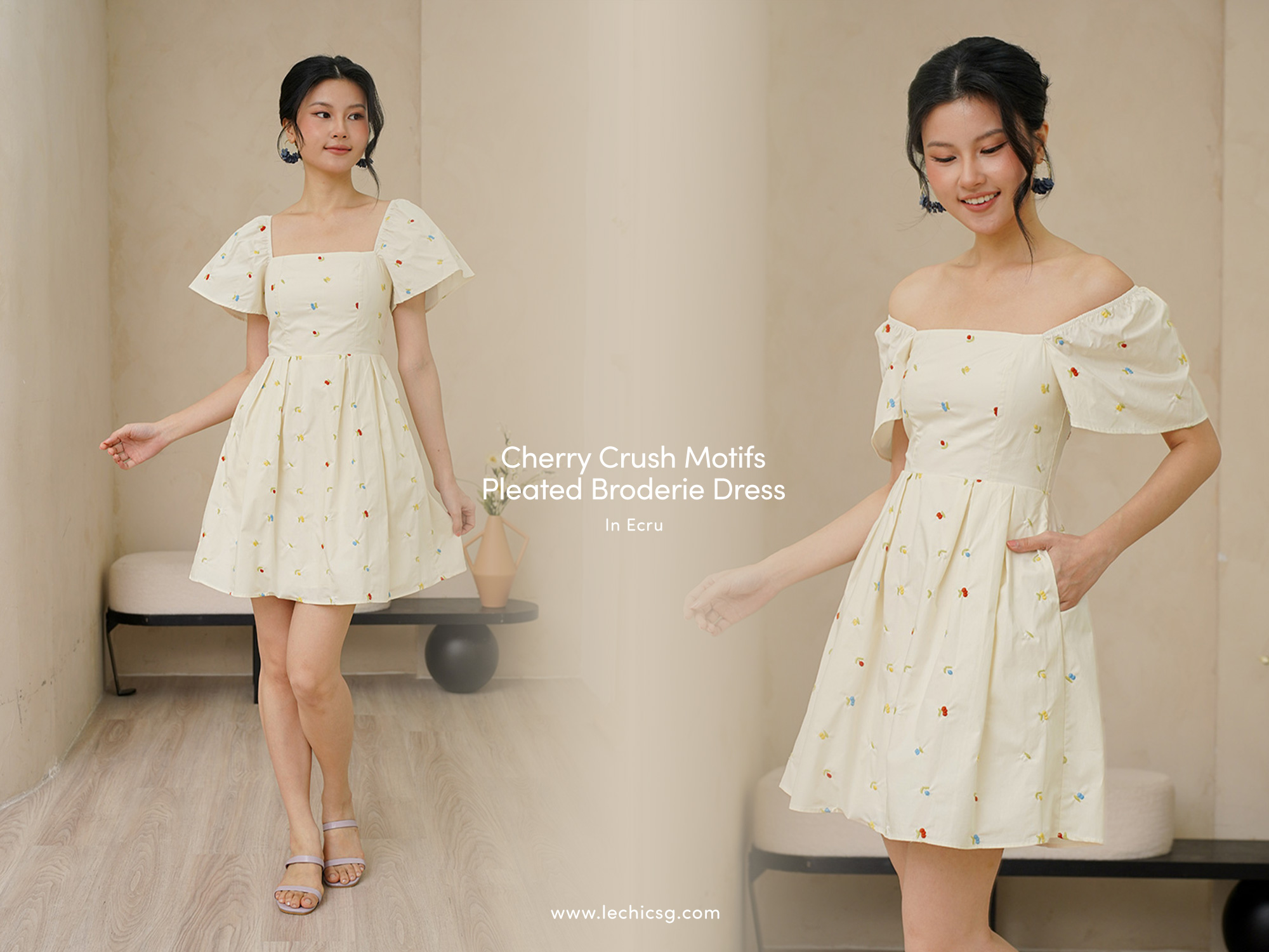 An array of coloured cherry broderies are embroidered onto the light cotton linen of our square neck dress with a pleated full skirt to enhance its transfixing, fluid motion. This dress is a captivating blend of tropical allure and contemporary elegance. Bold tones of cherry, aubergine and sherbet pink. If you harbour a love for all things vintage, this multi coloured broderie dress harnesses a fun cherry motif in a classic sleeved silhouette, and drops down to pleats to create a flowing shape. Bring some carefree colour to your ensembles, in this number boasting no less than rainbow-coloured cheery prints, for an irresistibly whimsical spin to your repertoire. The summery, fruity cherry broderie motif scattered allover captures an eclectic aesthetic. Look on the bright side in this light and airy style fixated with cheery rainbow cherries, that allows you to turn on the summery mon cheri charm in this quirky fruitilicious number! The cherries also look like florals so it’s like a cherry floralilous spring spin. Cherry oh, cherry oh, baby. Don't you know I'm in love with you? Flutter sleeves on top of pleats make life a bowl of cherries, all in a ‘cherrific’ all over embroidered dress. The charming and cheeky cherry print adds to the sweet appeal of a swingy A-line dress finished with pleats and flutter sleeves. The joyous cherry motifs gives this summer dress a playful twist perfect for picnic parties. Comes with side pockets. Smocked at back. Fully lined, not sheer. Concealed back zip closure. Made of cotton linen rayon. Comes in black and ecru. Available in sizes S, M & L.