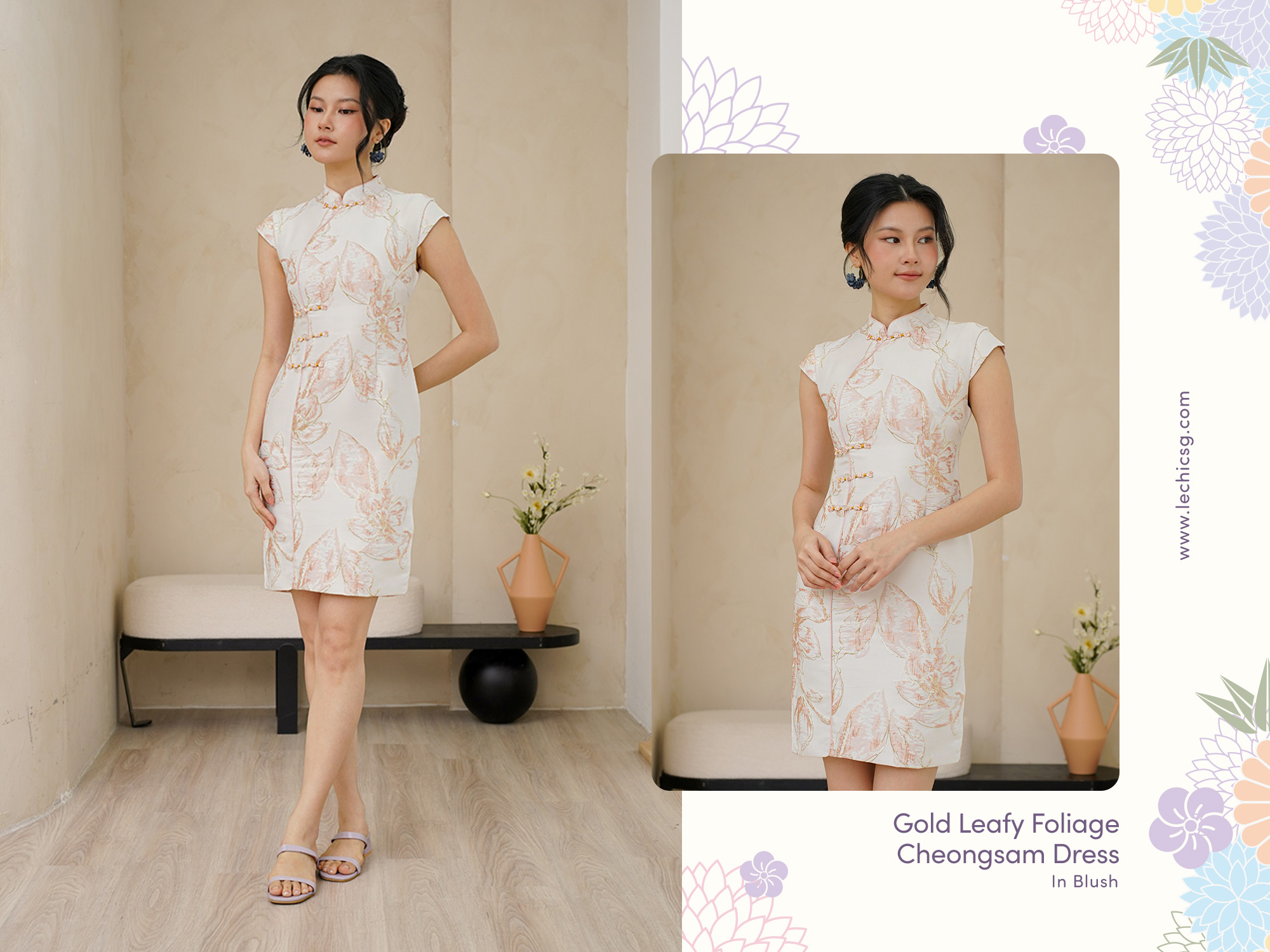 Inking tradition with a modern tropical touch, this dress conveys luscious greens in a more playful, shorter cut. Luscious leaves outlined in gold threads. It features a right-sided youren closure, a classic mandarin collar, and cap sleeves with subtle waist shaping to create a flattering silhouette. Ensuring comfort and ease of movement throughout the day. Made from fine silk in the elegant leafy foliage pattern, threaded in gold, it features contrasting piping and a flattering waistline to accentuate the silhouette. This timeless yet contemporary piece is versatile‚ pair with heels for an elegant soiree. With its tailored finish, it embodies modern Asian aesthetics and our signature touch of contemporary chinoiserie. Crafted from luxurious woven sateen, this dress features a vibrant leaf pattern that adds a touch of nature-inspired elegance. The design and above knee length create a balanced silhouette, while the delicate Chinese buttons offer a refined, classic touch. This set features a delicately structured bodice adorned with soft pastel foliage, each leaf and branch brought to life with intricate embroidery and gilded accents. Its duchess satin sheen catches the light gracefully, creating a luminous, ethereal glow with every movement. The silk embroidered fabric adds a modern romantic touch, layering subtle sparkle over a timeless silhouette. Together, the ensemble embodies refined elegance — a gentle harmony of tradition, craftsmanship, and contemporary femininity. Fully lined, not sheer. Functional pankou buttons. Concealed back zip closure. Made of silk embroidered taffeta blend. Comes in jadeite mint and blush pink. Available in sizes S, M & L.