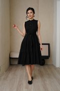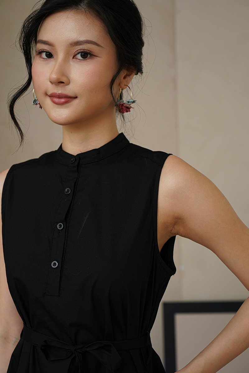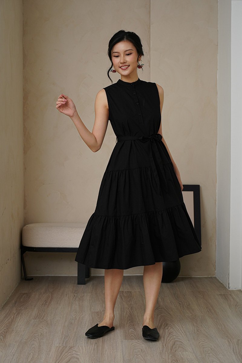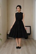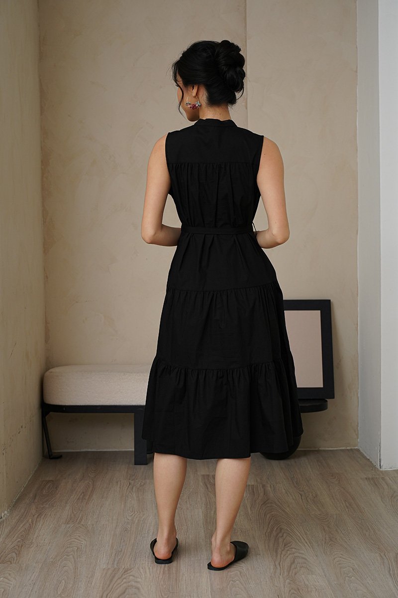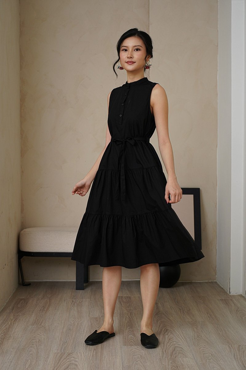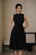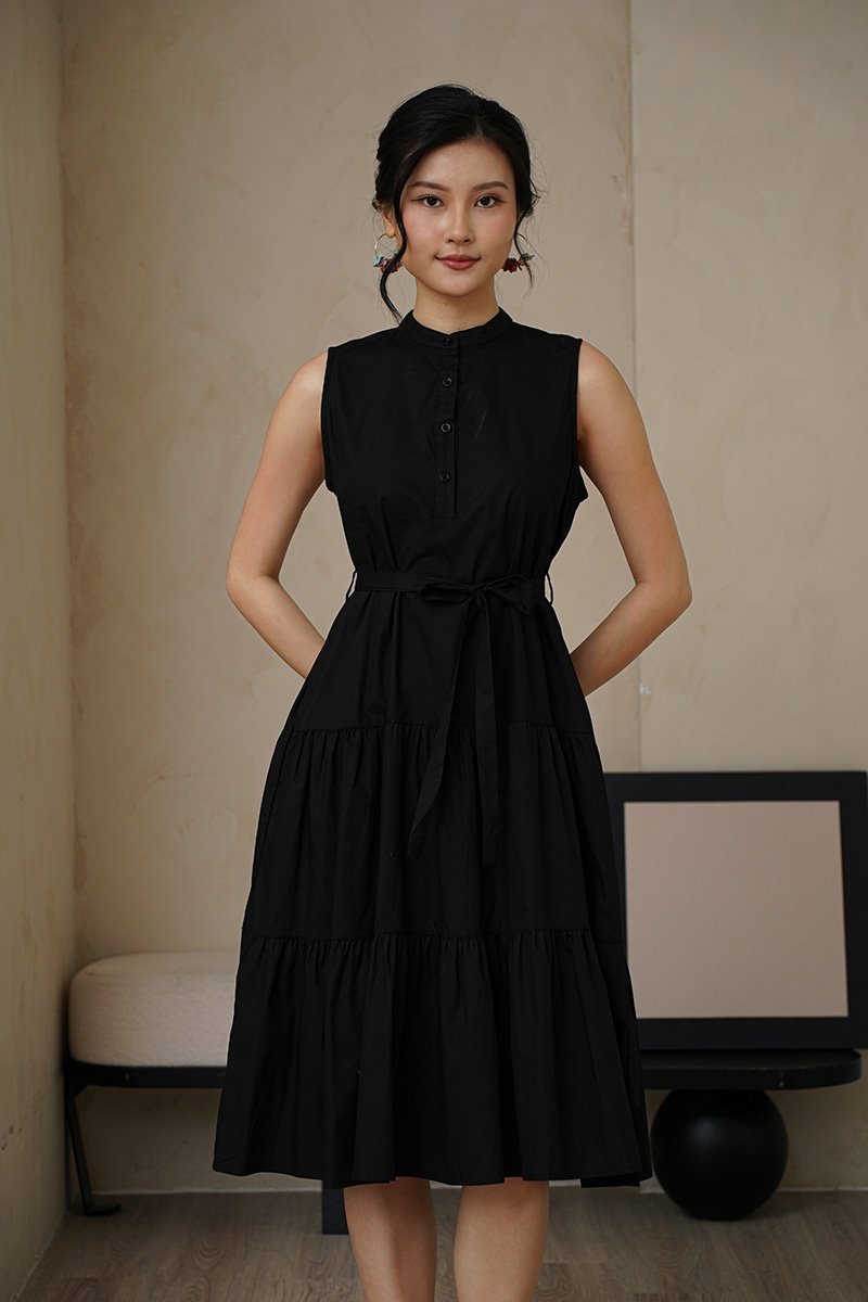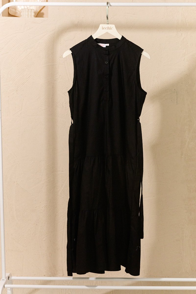 This feminine hybrid shirt dress channels the ultimate airy and breezy ambience into your wardrobe. Defined by a sleeveless buttoned placket and tiered skirt construction, features a mandarin collar and tie belt in the waistline this piece makes for a great addition to your well-curated seasonal edits. Crafted in a crisp organic linen cotton, this hybrid style shirt silhouette combines elegant detailing with everyday ease making it a dream to wear year-round. The dress has a relaxed fit through the body, a button down placket, side seam pockets and a removable waist tie. The bodice features a neat mandarin collar with gathering all through its tiers that flows into the body. The tiered skirt creates a floaty silhouette finishing at a flattering midi-length that looks great worn with a classic pump or casual sneaker. Designed for relaxed wearing, its free-flowing style in breathable cotton linen, makes it a staycation essential. With a formfitting bodice and full skirt, this hybrid shirt dress cuts a timelessly elegant silhouette, but still feels everyday-friendly in cotton linen and its breezy blue marine tones. Simple and comfortable sandals and a straw hat will suit this midi dress nicely. Three shirred tiers at the skirt create a sweeping effect to this pure cotton shirt dress, while the matching sash tie adds an elevated finish. A removable self-belt allows for versatile styling options. Comes with side pockets. Functional buttons. Pull on styling with button front placket. Made of cotton linen blend. One colour only. Available in sizes S, M & L.