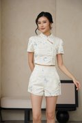 Butterflies and flowers bloom on this oriental coord set, swaying gracefully in the breeze. Paired perfectly with one another, exuding a fresh and elegant charm. Beneath the flowers, the butterflies on the fabric dances, embroidered with blue and white threads, the butterflies flutter and shimmer on the jacquard. Like a butterfly drawn to the lamp's glow, dancing gracefully in the night. Adorned with the gentle colours of light spring, the young maiden appears, wearing a bamboo hat and veil, her beauty both gentle and refined. Like the light flutter of the wings of a butterfly. The silk jacquard are heavily embroidered with butterfly motifs in a satin stitch reminiscent of what is used by traditional embroiderers. From the vibrant floral patterns to the majestic flights of butterflies, from tranquil landscapes to profound poetic and calligraphic themes, each pattern is the crystallization of artisans' wisdom, with every stitch embodying profound cultural heritage. Let us step into this beautiful world woven with silk threads and feel the infinite charm of oriental embroidery patterns. The butterflies with beautifully elongated and swirling wings fly amidst a profusion of densely woven flowers. Side pockets on shorts. Functional pankou buttons on top. Fully lined, not sheer. Exposed back zip closure for top, concealed back zip closure for shorts. Made of silk and taffeta poly blend. Comes in white and pink. Available in sizes S, M & L.