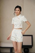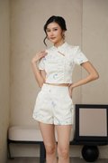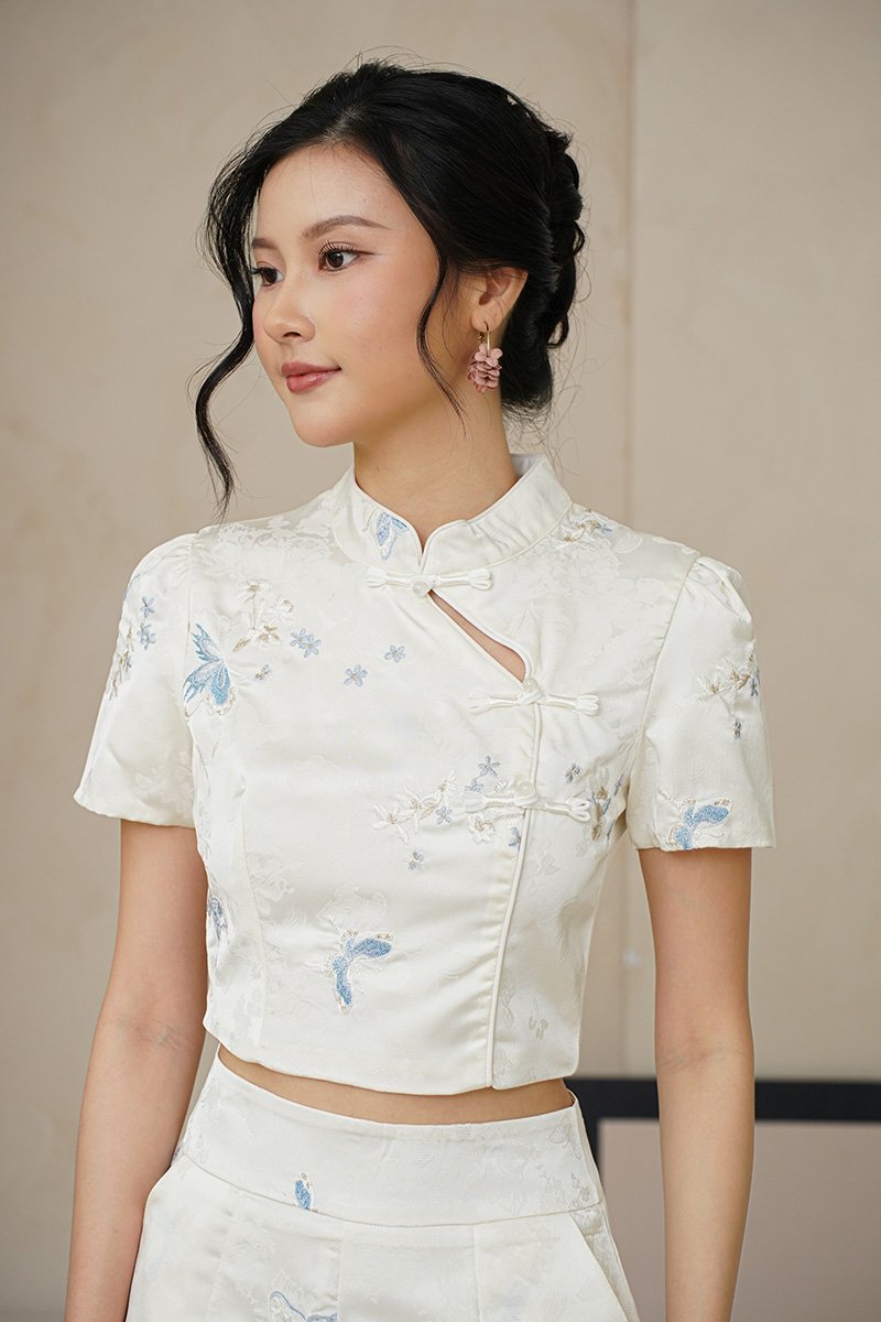 Butterflies and flowers bloom on this oriental coord set, swaying gracefully in the breeze. Paired perfectly with one another, exuding a fresh and elegant charm. Beneath the flowers, the butterflies on the fabric dances, embroidered with blue and white threads, the butterflies flutter and shimmer on the jacquard. Like a butterfly drawn to the lamp's glow, dancing gracefully in the night. Adorned with the gentle colours of light spring, the young maiden appears, wearing a bamboo hat and veil, her beauty both gentle and refined. Like the light flutter of the wings of a butterfly. The silk jacquard are heavily embroidered with butterfly motifs in a satin stitch reminiscent of what is used by traditional embroiderers. From the vibrant floral patterns to the majestic flights of butterflies, from tranquil landscapes to profound poetic and calligraphic themes, each pattern is the crystallization of artisans' wisdom, with every stitch embodying profound cultural heritage. Let us step into this beautiful world woven with silk threads and feel the infinite charm of oriental embroidery patterns. The butterflies with beautifully elongated and swirling wings fly amidst a profusion of densely woven flowers. Side pockets on shorts. Functional pankou buttons on top. Fully lined, not sheer. Exposed back zip closure for top, concealed back zip closure for shorts. Made of silk and taffeta poly blend. Comes in white and pink. Available in sizes S, M & L.