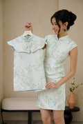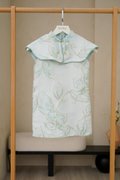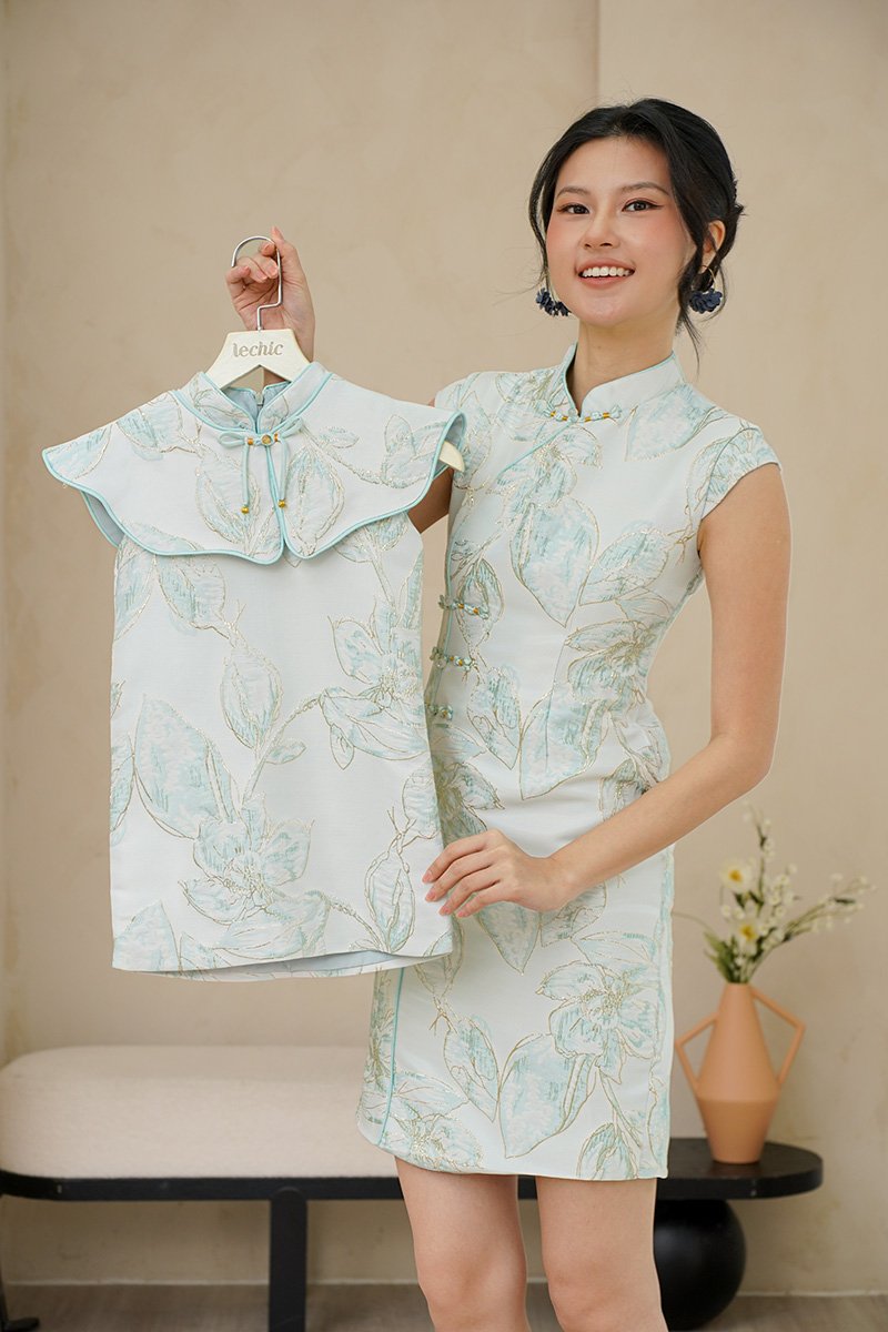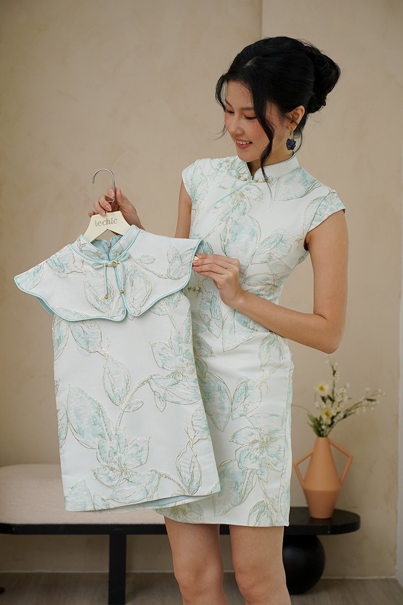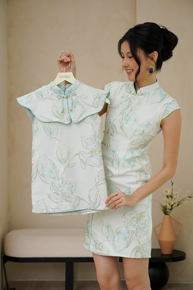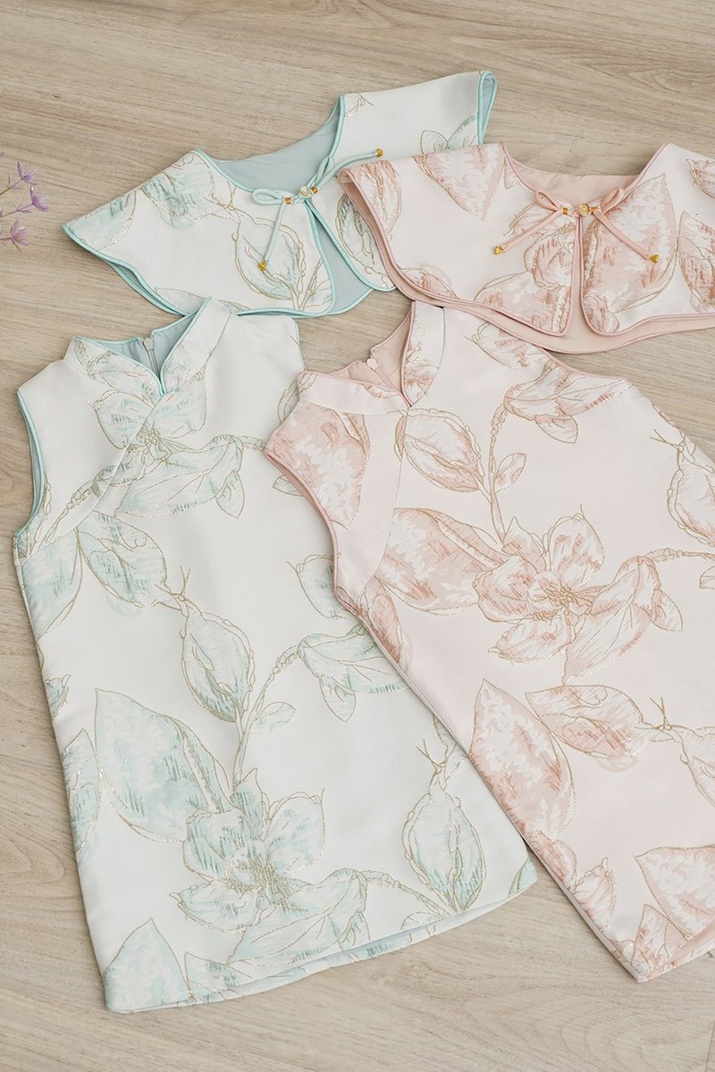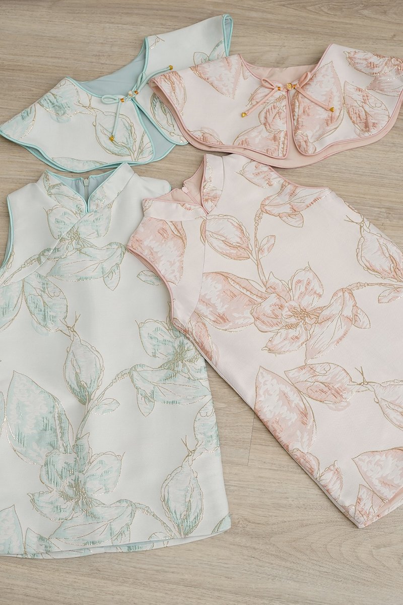 Designed as the kids version of our Gold Leafy Foliage cheongsam dress, this piece is made from the same floral gold pressed papersilk and completed with matching delicate cape—making CNY. Exuding an air of regal aura, this dress incorporates gold threads into the weave, creating a radiant, shimmering effect that catches the light. Designed with intricate embroidery, it features delicate gold floral patterns, exuding an aura of grace and charm. Featuring brightly coloured jacquard, brocade trimmings and pastel colours that appeal to the younger cohort. Complemented by a cute cape pairing made from the brocade’s fabric, the cape can serve as a little bib or as a little play companion for your little one too! The sleeveless flare cut dress is flattering to all your little sweet younglings. Fully lined, not sheer. Detachable cape with functional button pankou and ribbon tie. Concealed back zip closure. Made of silk embroidered taffeta blend. Comes in jadeite mint and blush pink. Available in sizes 110, 130, 150.