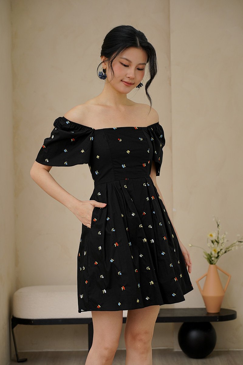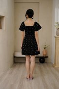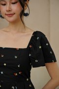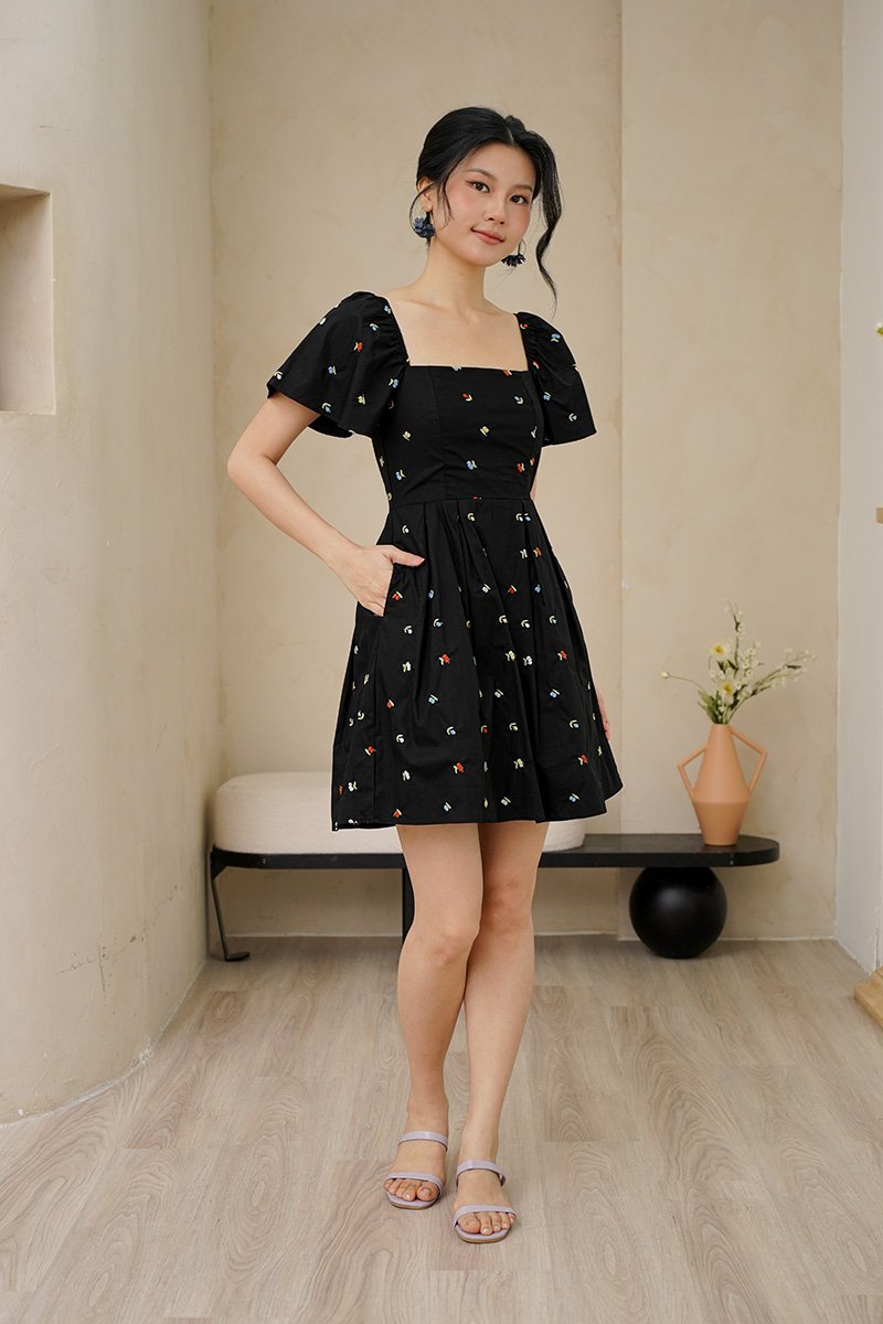 An array of coloured cherry broderies are embroidered onto the light cotton linen of our square neck dress with a pleated full skirt to enhance its transfixing, fluid motion. This dress is a captivating blend of tropical allure and contemporary elegance. Bold tones of cherry, aubergine and sherbet pink. If you harbour a love for all things vintage, this multi coloured broderie dress harnesses a fun cherry motif in a classic sleeved silhouette, and drops down to pleats to create a flowing shape. Bring some carefree colour to your ensembles, in this number boasting no less than rainbow-coloured cheery prints, for an irresistibly whimsical spin to your repertoire. The summery, fruity cherry broderie motif scattered allover captures an eclectic aesthetic. Look on the bright side in this light and airy style fixated with cheery rainbow cherries, that allows you to turn on the summery mon cheri charm in this quirky fruitilicious number! The cherries also look like florals so it’s like a cherry floralilous spring spin. Cherry oh, cherry oh, baby. Don't you know I'm in love with you? Flutter sleeves on top of pleats make life a bowl of cherries, all in a ‘cherrific’ all over embroidered dress. The charming and cheeky cherry print adds to the sweet appeal of a swingy A-line dress finished with pleats and flutter sleeves. The joyous cherry motifs gives this summer dress a playful twist perfect for picnic parties. Comes with side pockets. Smocked at back. Fully lined, not sheer. Concealed back zip closure. Made of cotton linen rayon. Comes in black and ecru. Available in sizes S, M & L.