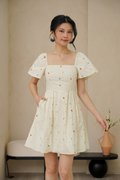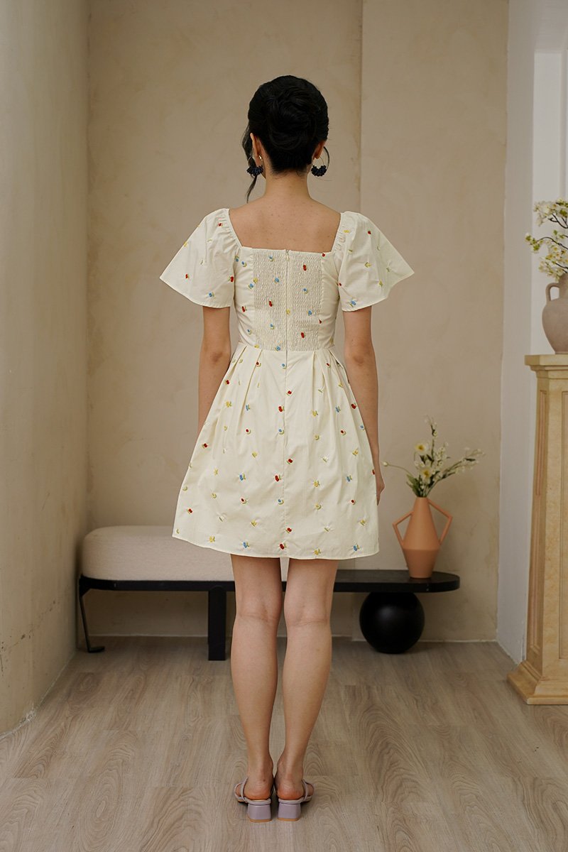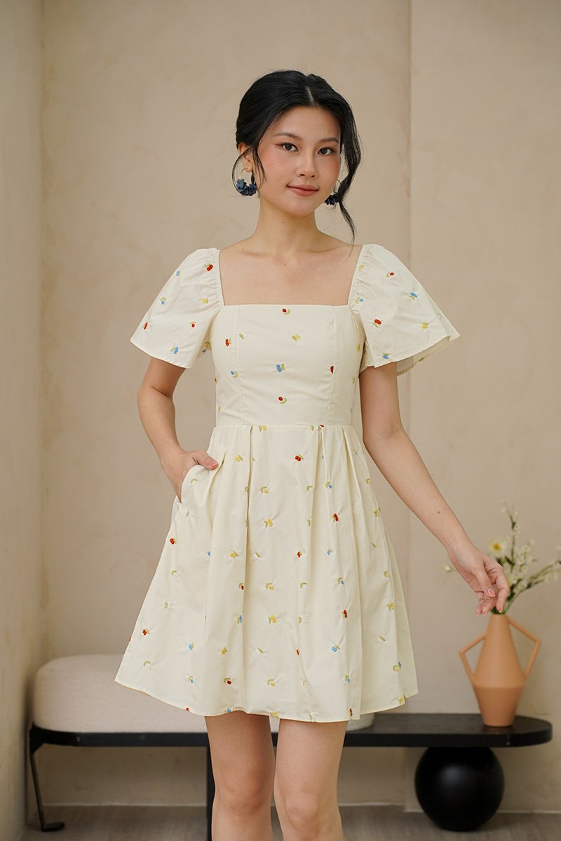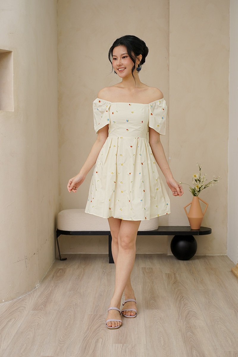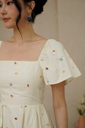 An array of coloured cherry broderies are embroidered onto the light cotton linen of our square neck dress with a pleated full skirt to enhance its transfixing, fluid motion. This dress is a captivating blend of tropical allure and contemporary elegance. Bold tones of cherry, aubergine and sherbet pink. If you harbour a love for all things vintage, this multi coloured broderie dress harnesses a fun cherry motif in a classic sleeved silhouette, and drops down to pleats to create a flowing shape. Bring some carefree colour to your ensembles, in this number boasting no less than rainbow-coloured cheery prints, for an irresistibly whimsical spin to your repertoire. The summery, fruity cherry broderie motif scattered allover captures an eclectic aesthetic. Look on the bright side in this light and airy style fixated with cheery rainbow cherries, that allows you to turn on the summery mon cheri charm in this quirky fruitilicious number! The cherries also look like florals so it’s like a cherry floralilous spring spin. Cherry oh, cherry oh, baby. Don't you know I'm in love with you? Flutter sleeves on top of pleats make life a bowl of cherries, all in a ‘cherrific’ all over embroidered dress. The charming and cheeky cherry print adds to the sweet appeal of a swingy A-line dress finished with pleats and flutter sleeves. The joyous cherry motifs gives this summer dress a playful twist perfect for picnic parties. Comes with side pockets. Smocked at back. Fully lined, not sheer. Concealed back zip closure. Made of cotton linen rayon. Comes in black and ecru. Available in sizes S, M & L.