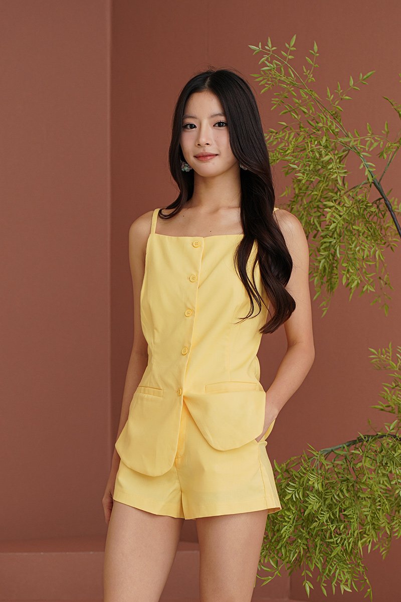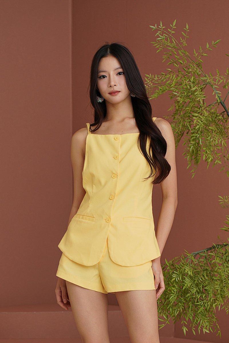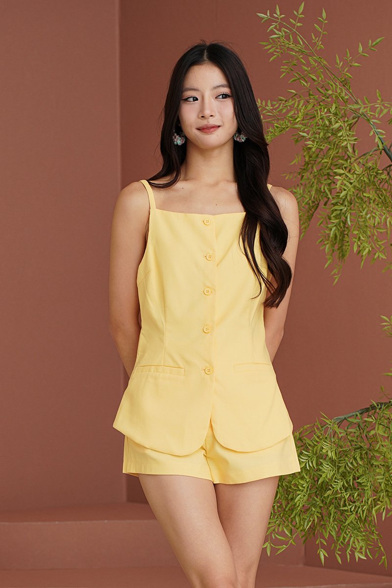 This waistcoat top is made from airy linen with slender straps and darted through the middle to draw in the waist. It'll look great with tailored pants or shorts. With a lightweight feel and sleeveless design, this top is the perfect transitional piece between other items or with the matching pocket linen shorts, in white or butter yellow. Butter yellow, however, is shaping up to be a top colour trend, and it's one you'll find ease in styling. Its leveled saturation allows it to act as a neutral shade that pairs easily with the rest of your wardrobe. It's subtle but offers just the right amount of interest in an outfit. Refine your vest + shorts edit with this must-have silhouette. Both the white and butter yellow colours would go into your wardrobe seamlessly. Crafted from our much loved linen blend fabrication and exudes simplicity with its waistband and relaxed A-line silhouette. Tailored from linen-blend, it has a squareneck-style profile and fastens with lustrous buttons down front. This linen-look vest and shorts coord is a must-have addition to your wardrobe, offering endless styling possibilities for the fashion-forward person. The tonal buttons add a subtle yet eye-catching detail, while the square neckline and regular fit create a flattering silhouette suitable for various body types. Say hello to your new layering obsession and here, the new butter yellow beauty that’s here to serve sunshine with a side of sass. With its softest linen fabric in the dreamiest buttery hue and white, this is basically the fashion equivalent of golden hour lighting. Designed with a modern, minimalist aesthetic, this fully lined set is perfect for warm-weather days, casual outings, or elevated lounging. Comfortable yet polished, it’s an easy go-to for summer styling. Designed with a clean square neckline and sleek silhouette, this vest brings a modern edge to classic tailoring. The straps ensure a personalized fit, while the front button closure and decorative welt pocket accents add a refined finish. Featuring a square neckline and front split, forming a subtly flared hemline for flattering shape. Its button-down front is complemented by a flattering square neckline, thin straps, and front split for an effortlessly chic look. Functional buttons. Decorative pockets on vest top. Fully lined top, not sheer. Button front styling for top. Concealed zip fly with center hookeye closure for shorts. Made of 10% natural hemp, 30% viscose, 60% polyester. Comes in white and yellow. Available in sizes XS, S, M & L.