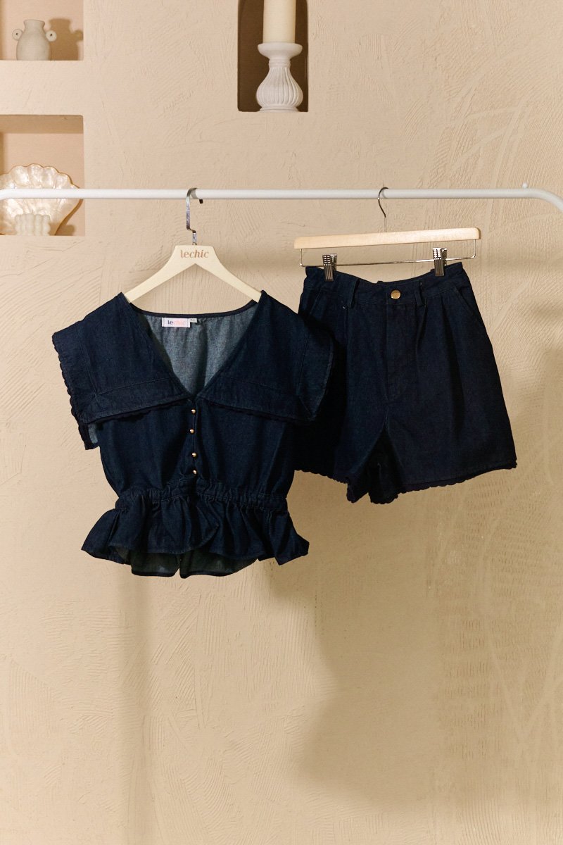Chambray and Chantilly, combined. This chic set combines the casual vibe of denim with the delicate touch of lace, offering a perfect blend of style and comfort. The denim shorts feature lace trim detailing at the hems, while the matching top adds a feminine flair with its lace accents along the yoke and sleeves. Lace accents in matching indigo tones combined with a V-neck perfectly balance a sweet yet edgy style. The short sleeves add a touch of sophistication while the denim fabric gives it a trendy edge. Cut with directional detailing for a sculpted finish. Designed with an asymmetric lapel neckline and cap sleeves, it frames the silhouette with modern edge. Structured yet feminine, this top balances sharp tailoring with feminine definition—perfect styled with denim or tailored separates. Additionally, accents like its lace details, and tiered ruffle layers are seamlessly incorporated to give each piece a subtle edge. Decorative buttons on top. Comes with side pockets on shorts. Pull on styling for top, hidden zip fly with button closure for shorts. Made of denim cotton poly blend. One colour only. Available in sizes XS, S, M & L.