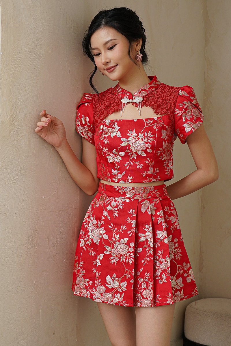 Our latest gilded co-ord set reimagines festive dressing with a modern, confident edge. Crafted from a very special premium silk brocade fabric, the surface features richly woven florals with metallic gold threads that catch the light beautifully, creating depth, texture, and a subtle luxurious sheen. The beautiful top is also enhanced with Chantilly lace over the neckline and jewel pankou details to up the glam factor. Tulip style sleeves add structure to the golden festive number. The floral motifs woven into the fabric add depth and dimension, making it a unique work of art. The flowing four-panel skirt, like a blooming flower—a sight to behold. Embrace your inner majesty with our radiant premium gold silk Qipao set adorned with elegant pearl trim details and lace. Embellished with tonal floral motifs and accents of complementary shades of gilded leaves, step into any event feeling like a majestic queen in the perfect 2 piece set. Created using traditional hand or mechanical looms, this brocade incorporates supplementary weft threads (metallic) to form raised, decorative patterns. A fusion of traditional Chinese design and contemporary style, this qipao top and pleated skirt set features elegant floral lace, pearl accents, a mandarin collar, and alluring tulip sleeves. The floral leaves and gold thread capture blessings of harmony, prosperity and joyful reunion. Functional pankou buttons on top. Inner lined shorts for skirt. Fully lined, not sheer. Exposed back zip closure for top, concealed back zip closure for skirt. Made of silk satin taffeta blend. Comes in red and pink. Available in sizes S, M, L & XL.