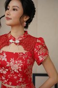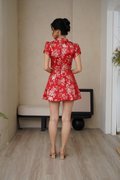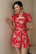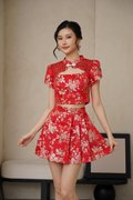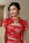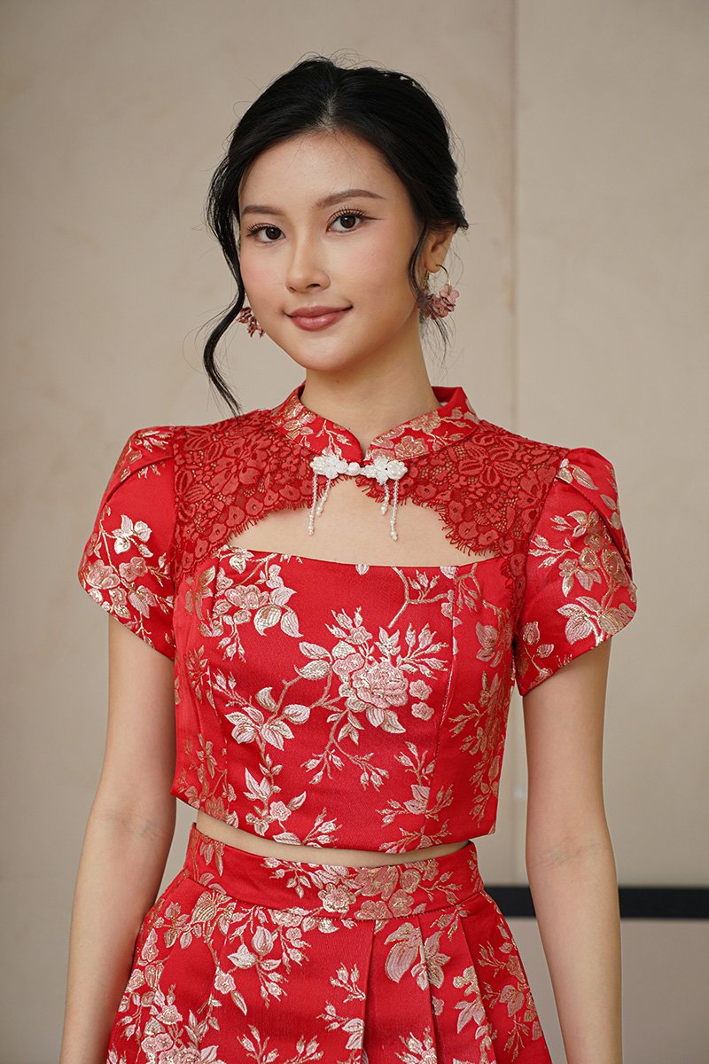 Our latest gilded co-ord set reimagines festive dressing with a modern, confident edge. Crafted from a very special premium silk brocade fabric, the surface features richly woven florals with metallic gold threads that catch the light beautifully, creating depth, texture, and a subtle luxurious sheen. The beautiful top is also enhanced with Chantilly lace over the neckline and jewel pankou details to up the glam factor. Tulip style sleeves add structure to the golden festive number. The floral motifs woven into the fabric add depth and dimension, making it a unique work of art. The flowing four-panel skirt, like a blooming flower—a sight to behold. Embrace your inner majesty with our radiant premium gold silk Qipao set adorned with elegant pearl trim details and lace. Embellished with tonal floral motifs and accents of complementary shades of gilded leaves, step into any event feeling like a majestic queen in the perfect 2 piece set. Created using traditional hand or mechanical looms, this brocade incorporates supplementary weft threads (metallic) to form raised, decorative patterns. A fusion of traditional Chinese design and contemporary style, this qipao top and pleated skirt set features elegant floral lace, pearl accents, a mandarin collar, and alluring tulip sleeves. The floral leaves and gold thread capture blessings of harmony, prosperity and joyful reunion. Functional pankou buttons on top. Inner lined shorts for skirt. Fully lined, not sheer. Exposed back zip closure for top, concealed back zip closure for skirt. Made of silk satin taffeta blend. Comes in red and pink. Available in sizes S, M, L & XL.