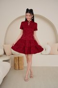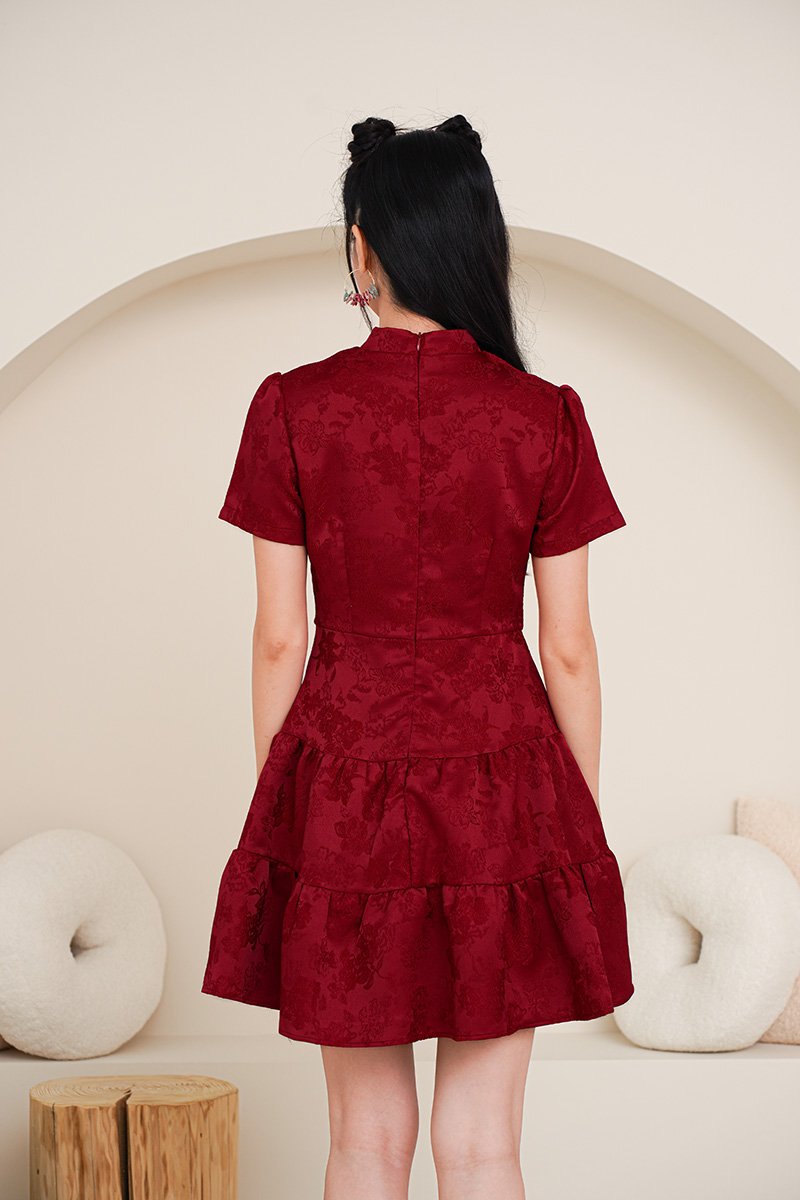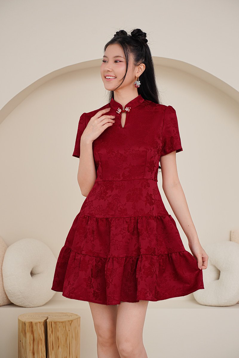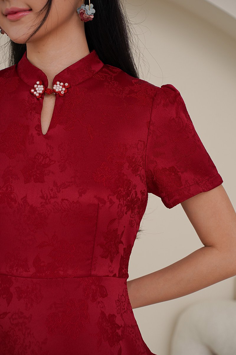 Couture femininity in its most refined form — sculpted yet softened by tiered layers and pearl pankou detailing. This stunning dress is crafted from a richly textured jacquard fabric featuring an all-over structured floral design in a bold, beautiful red, and the sweetest pink hue. Embellished with luminous pearls on its pankou collar, the pearly whites stand out nicely against the rich jacquard fabric and adds distinction to the outfit. The pearls are delicately interwoven into the knots of the pankou collar. The fitted bodice flows into a tiered skirt, creating a flattering and structured shape perfect for special occasions. Crafted with a delicately patterned exterior for a romantic finish. The cotton blend jacquard keeps it breathable, while the high collar and pankou placket lend structure. A fresh, cheerful take on the classic qi pao silhouette. The rich jacquard weave brightens the complexion, while the mandarin piping and handcrafted knot buttons add a beautifully traditional touch. Functional pearl pankou buttons on high collar. Fully lined, not sheer. Concealed back zip closure. Made of jacquard embossed weave fabric. Comes in burgundy red and pink. Available in sizes S, M & L.