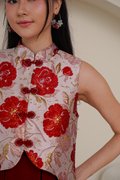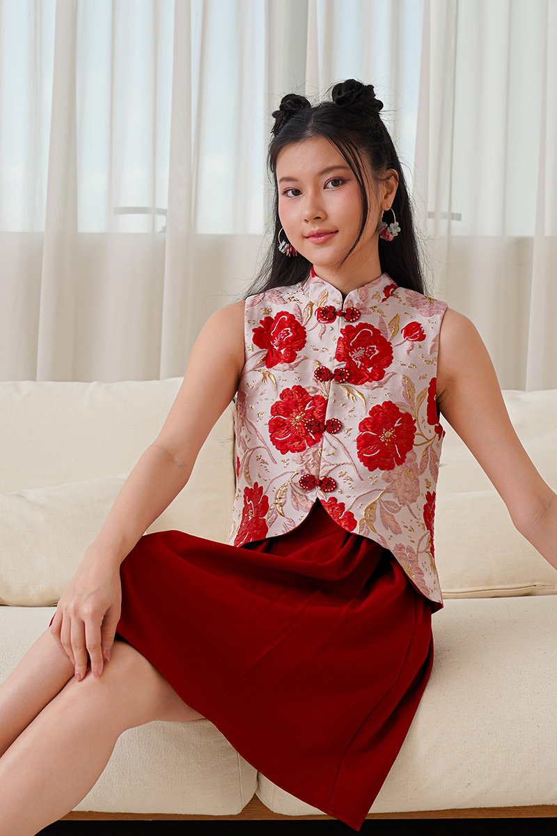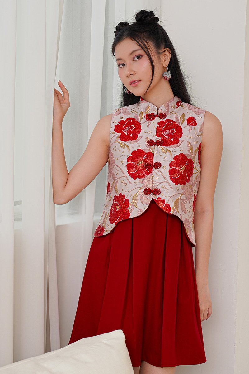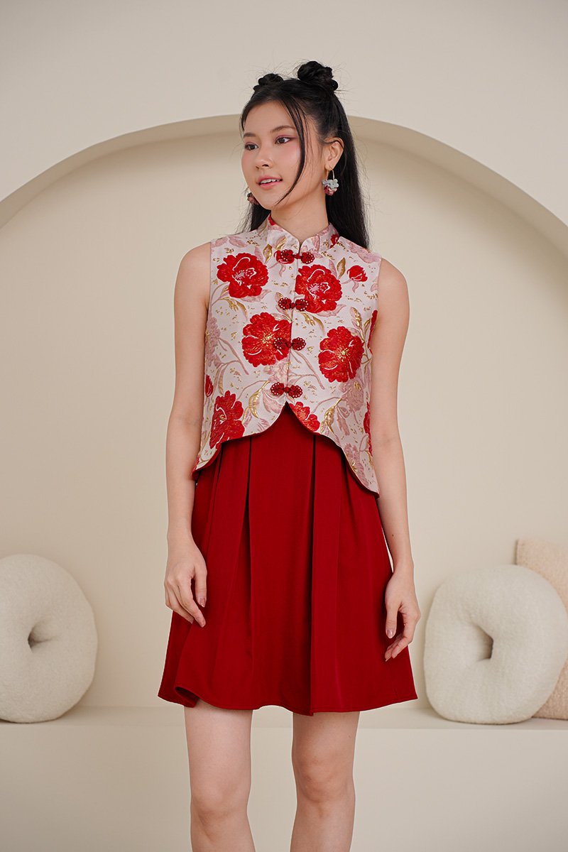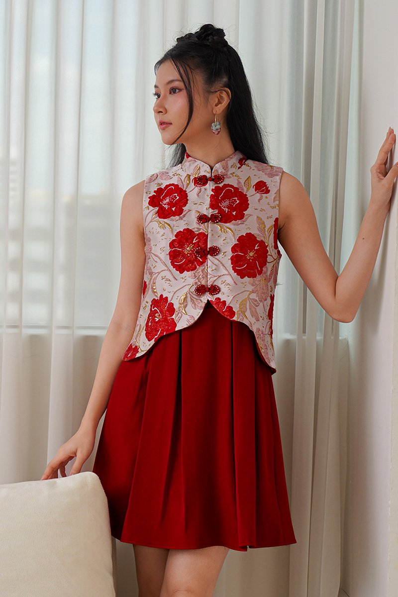 A mock 2pc dress designed to look like a layered outfit, delivering you the full grandeur of spring experience. We made the popular Grandeur of Spring into a full piece dress version, designed with well defined pleats of cotton twill at the bottom. Lush peonies or butterflies, which would be your pick? Its blooming peony and butterfly embroidery will attract attention and its A-line silhouette will allow you to move freely. The dress version keeps the same pretty scalloping detail of the top, that runs symmetrically down both sides but in an uneven hem length. Mirrored in the scallop- finished train on an asymmetrical hemline. Featuring a mock-layered tailored hanfu vest top adorned with intricate butterfly embroidery or peony jacquard, adding a whimsical touch to its refined design. The scallop detailing along the edges of the top and matching pleats below creates a graceful, scalloped silhouette that enhances the overall look. Crafted from premium fabrics, the dress drapes beautifully and provides a comfortable fit, features hand-embroidered butterflies and jacquard stamped peonies, symbolizing beauty, love, and joy. A woman’s jacket or informal surcoat embroidered with peony and butterflies and waves at the bottom borders. Now we bring the worry out of styling by making it into a full piece dress for convenience. The Peony, highly regarded in Chinese tradition, and the butterfly, signifying happiness, combine their luxuriance in the most delicate of media. The details of Spring certainly come alive in this swoon worthy ensemble full of the most wondrous details and embossments. Fully lined, not sheer. Concealed back zip closure. Made of luxe woven jacquard cotton for top, premium cotton twill for pleated skirt below. Comes in red and butter yellow. Available in sizes S, M & L.