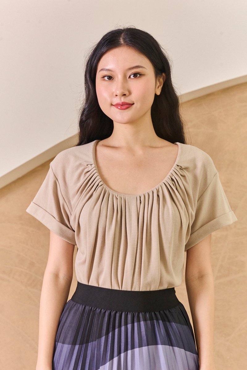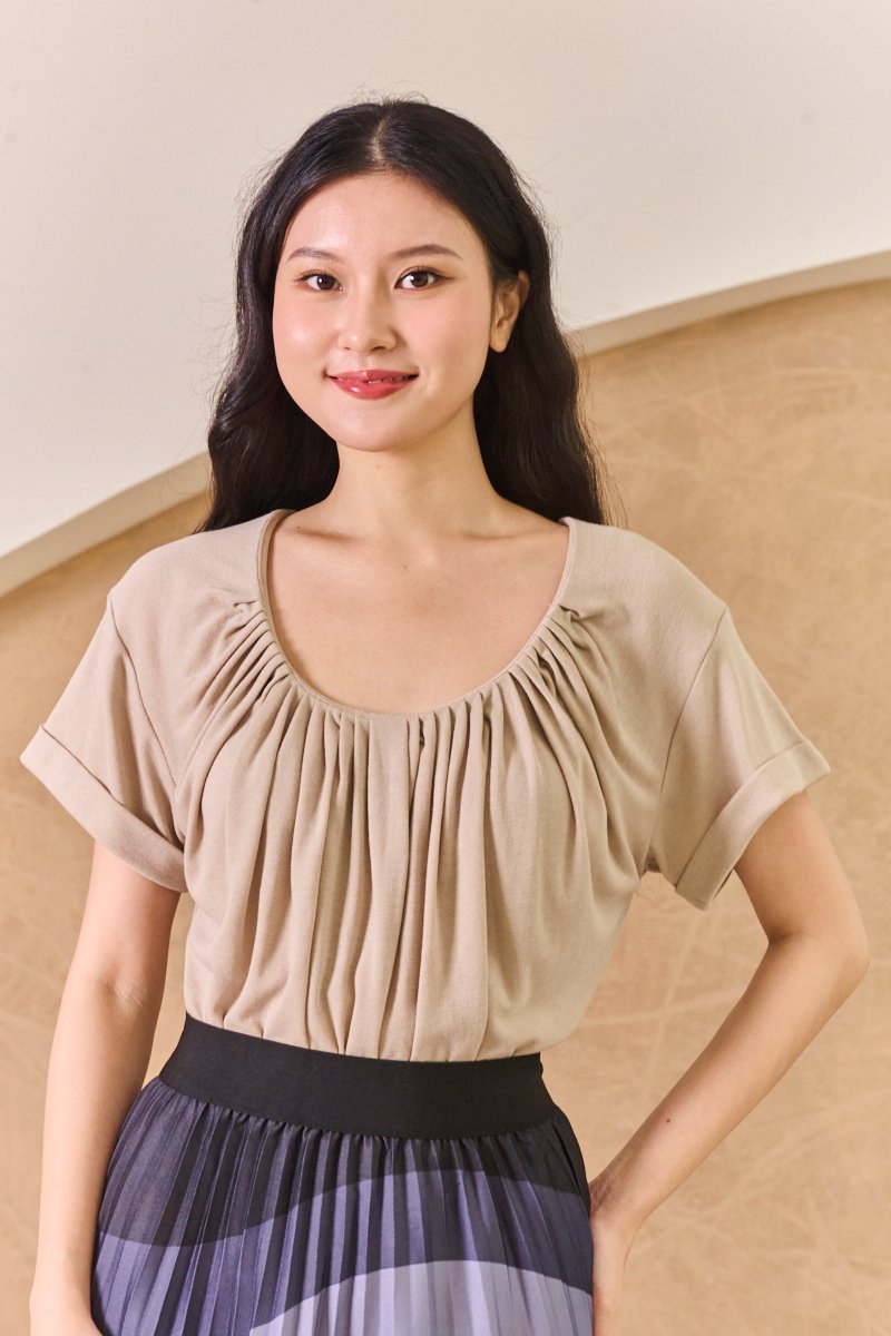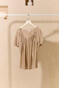 This cuff shirred sleeve tee combines a lightweight, modal jersey fabric with stylish ruched bodice for a refined take on a wardrobe essential. Its classic hue adds an easy style factor, while the shirred detailing elevates the classic tee silhouette, making it perfect for layering or wearing on its own with a polished edge. This throw-on top has shirred sides for an effortless feel. With its cuffed short sleeves, it's a prettier take on a tee. The relaxed fit and lightweight jersey fabric drapes beautifully for effortless wear, and makes it so easy to tuck into midi skirts. This basic style takes your classic, everyday tee to a new level. Made in a supersoft fabric, rolled sleeves and a round neck add to the casual appeal. The beckoning of a new season means time for some new basics! Featuring sweet rolled cuff details that is tacked down to stay in place, the simplicity of this pared back tee makes it a wonderful canvas for creativity and versatility in styling, making for a cool casual pick. Pull on styling. Made of modal jersey cotton. Comes in black and khaki. Available in sizes S & M.