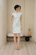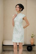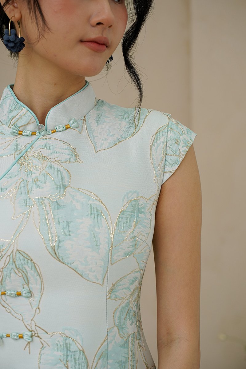 Gold Leafy Foliage Cheongsam Dress Celadon Jadeite