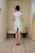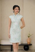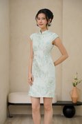 Inking tradition with a modern tropical touch, this dress conveys luscious greens in a more playful, shorter cut. Luscious leaves outlined in gold threads. It features a right-sided youren closure, a classic mandarin collar, and cap sleeves with subtle waist shaping to create a flattering silhouette. Ensuring comfort and ease of movement throughout the day. Made from fine silk in the elegant leafy foliage pattern, threaded in gold, it features contrasting piping and a flattering waistline to accentuate the silhouette. This timeless yet contemporary piece is versatile‚ pair with heels for an elegant soiree. With its tailored finish, it embodies modern Asian aesthetics and our signature touch of contemporary chinoiserie. Crafted from luxurious woven sateen, this dress features a vibrant leaf pattern that adds a touch of nature-inspired elegance. The design and above knee length create a balanced silhouette, while the delicate Chinese buttons offer a refined, classic touch. This set features a delicately structured bodice adorned with soft pastel foliage, each leaf and branch brought to life with intricate embroidery and gilded accents. Its duchess satin sheen catches the light gracefully, creating a luminous, ethereal glow with every movement. The silk embroidered fabric adds a modern romantic touch, layering subtle sparkle over a timeless silhouette. Together, the ensemble embodies refined elegance — a gentle harmony of tradition, craftsmanship, and contemporary femininity. Fully lined, not sheer. Functional pankou buttons. Concealed back zip closure. Made of silk embroidered taffeta blend. Comes in celadon jadeite and blush pink. Available in sizes S, M & L.