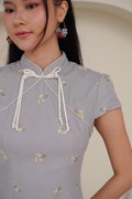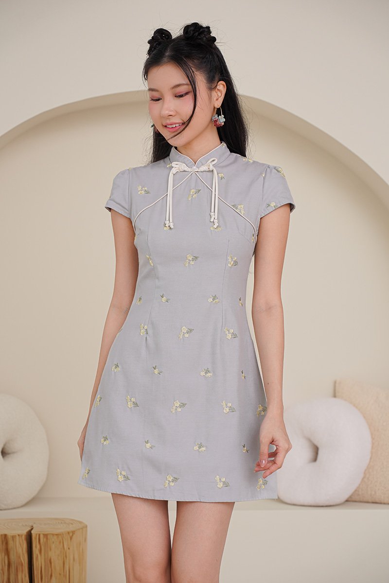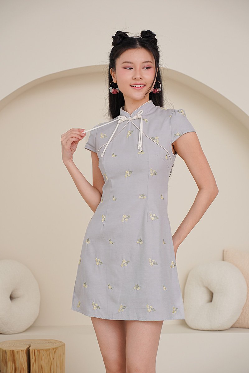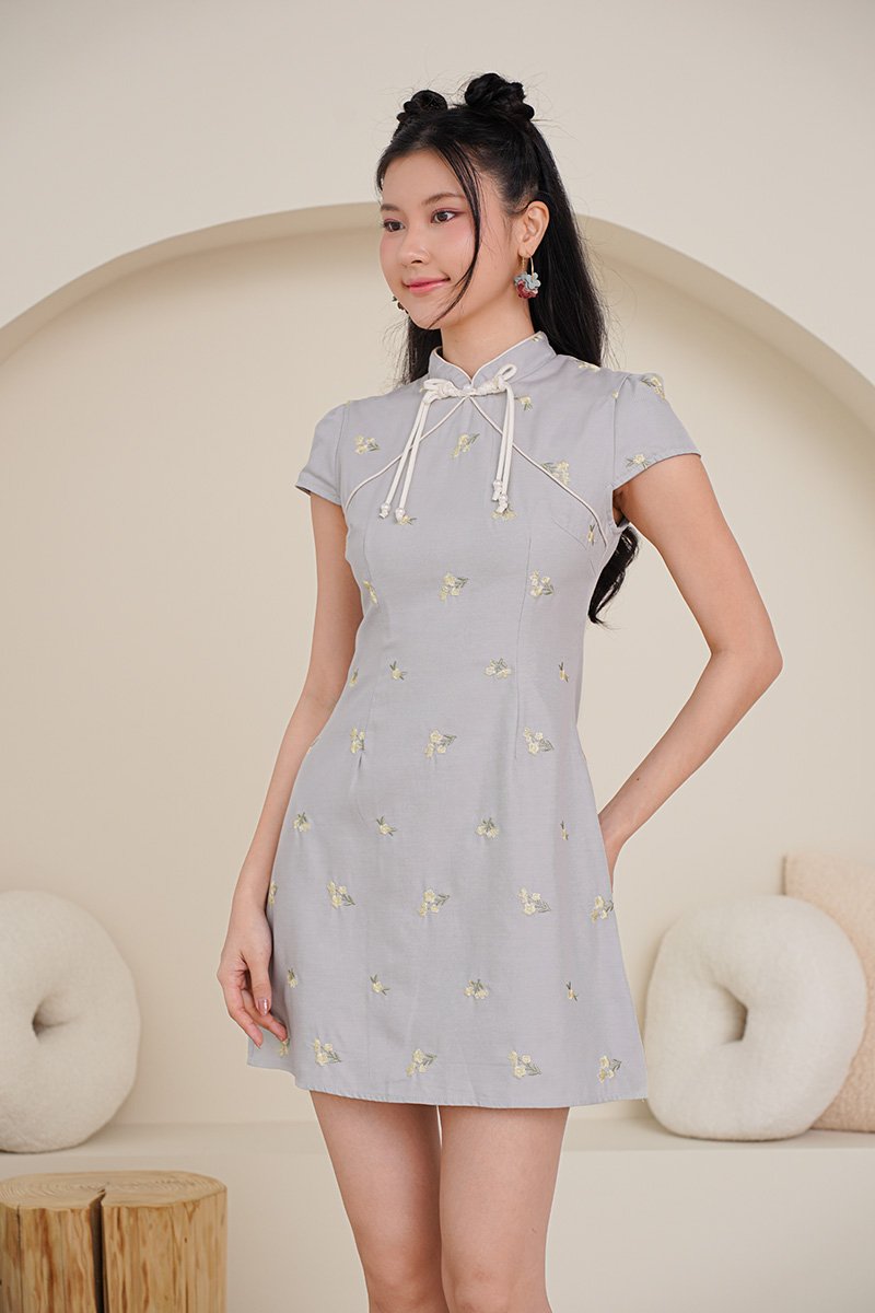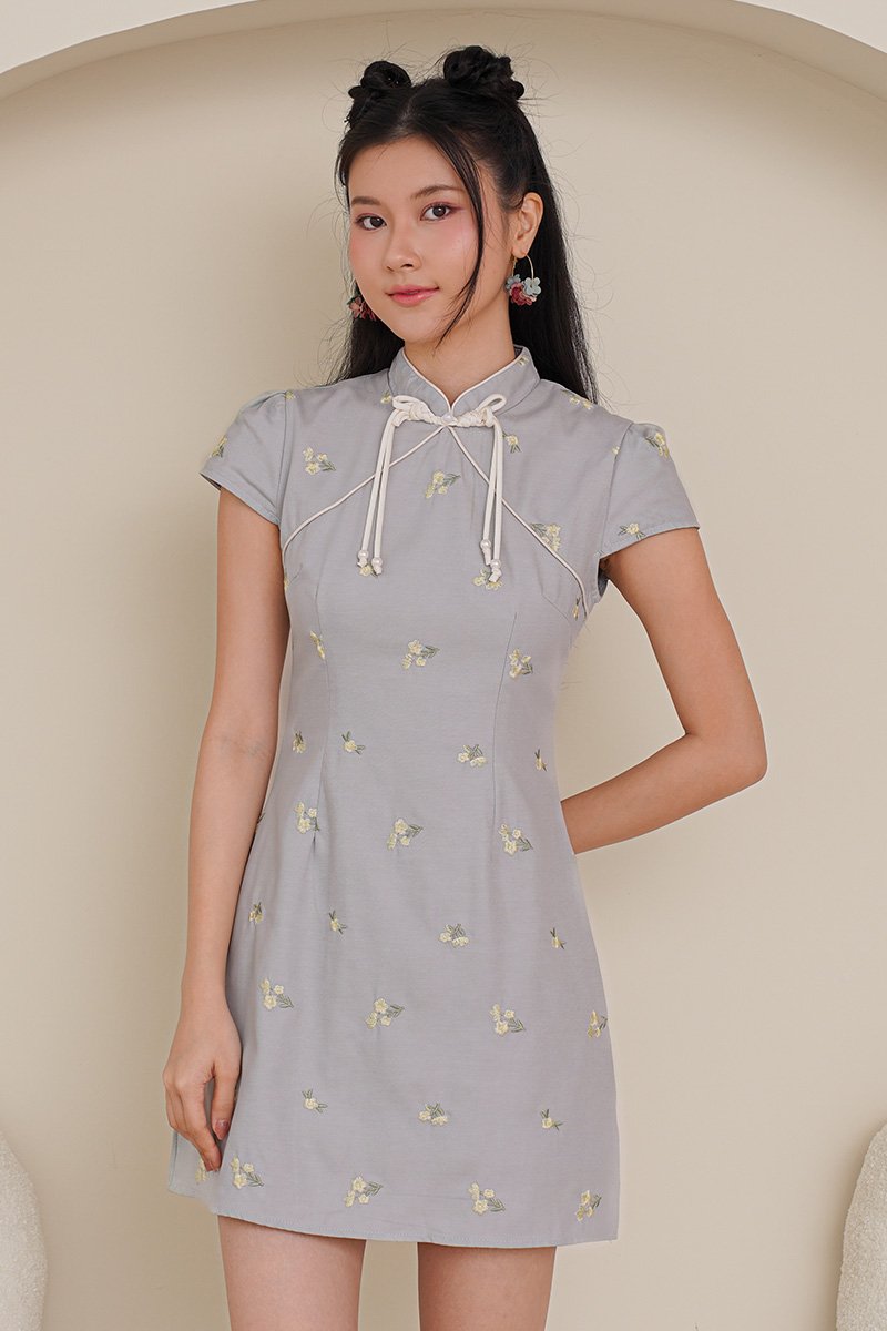 Where soft buttercups meets structural precision. This is the first time we had little broderie motifs on an oriental dress. Our first cotton-based cheongsam dress! This piece features an intricately braided ribbon bow pankou design accented by pearl tassels and bespoke design. The embroidery captures the essence of Japanese artistry, featuring delicate floral motifs and nature-inspired designs. The embroidery adds depth and texture, giving each piece a refined, heirloom quality that feels festive yet wearable beyond the season. Very light and full of youthful appeal, this piece can be worn to give an oriental spin on a garden party as well and gives options for wear after the festive. A quiet celebration of grace, offered in blue grey and butter yellow — hues that symbolise purity, blessings, and gentle joy. The sweet floral embroidery flows softly over a sculpted silhouette, finished with delicate yellow accents that echo auspicious CNY wishes and the warmth of reunion gatherings. Light, fluid, and refined, this dress is designed for moments of togetherness — where tradition meets modern elegance, and festive seasons blend seamlessly into one timeless expression. Soft buttercup florals – symbols of prosperity and romance – bloom across a soft dove gray/yellow backdrop, accented by delicate green foliage embroidery. Whispers of light Spring all throughout. Functional pankou button on high collar. Fully lined, not sheer. Concealed back zip closure. Made of premium cotton twill blend. Comes in butter yellow and blue grey. Available in sizes S, M & L.