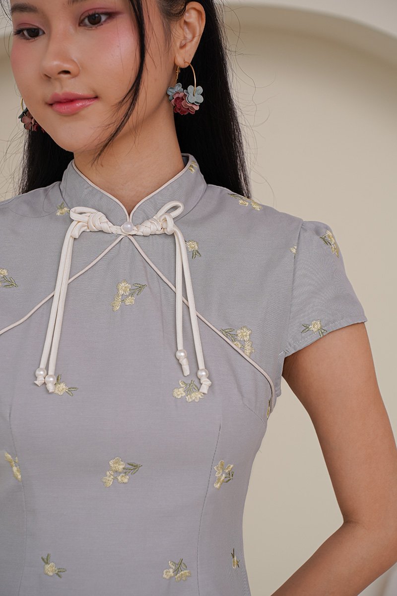 Heirloom Embroider Florals Qipao Dress Blue Grey