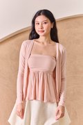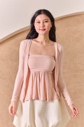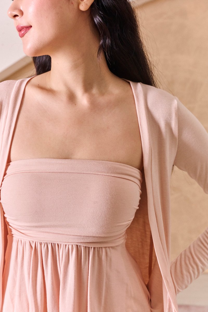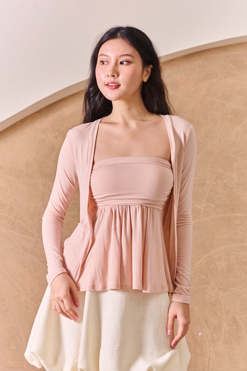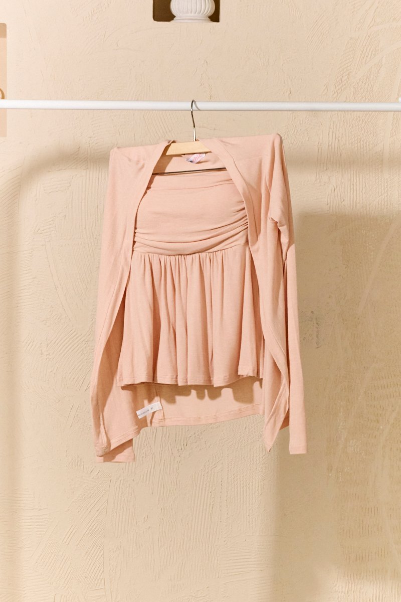 Padded camisoles/tubes and cardigan sets are having a moment, currently. The perfect basic in candy colours, and keeping your bases all covered in included padding. Snuggle up in style with our tube and cardigan set! This cozy set features a rayon tube top paired with a cardigan. Perfect for layering, it adds warmth and texture to your fall and winter wardrobe. Whether you're lounging or out and about, this set brings the perfect balance of comfort and style! Crush it in candy colours for a fun day out with a cosy twist that got your ins and outs all covered. A playful yet cozy ensemble that effortlessly captures nostalgic vibes. Wear the tube top solo to exude flirty confidence or layer it with the matching cardigan for a stylish, coordinated look that's perfect for any occasion. Oh so buttery soft rayon cotton and in the most eye pleasing sorbet shades ever, this set doubles up on all the reasons to adore cardigans and top sets! There's nothing as darling as you in this distinctive set! Sold together only and not separately as the size is cut to be the same size up top. This product is considered to be one top together and so it is not sold separately. Padded at bust. Pull on styling and throw on styling for cardigan. Made of stretchy cotton rayon. Comes in pink, cream and lilac. Available in sizes S, M & L.