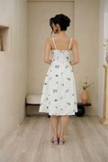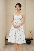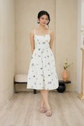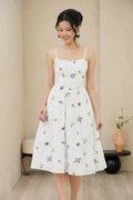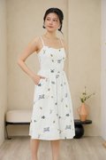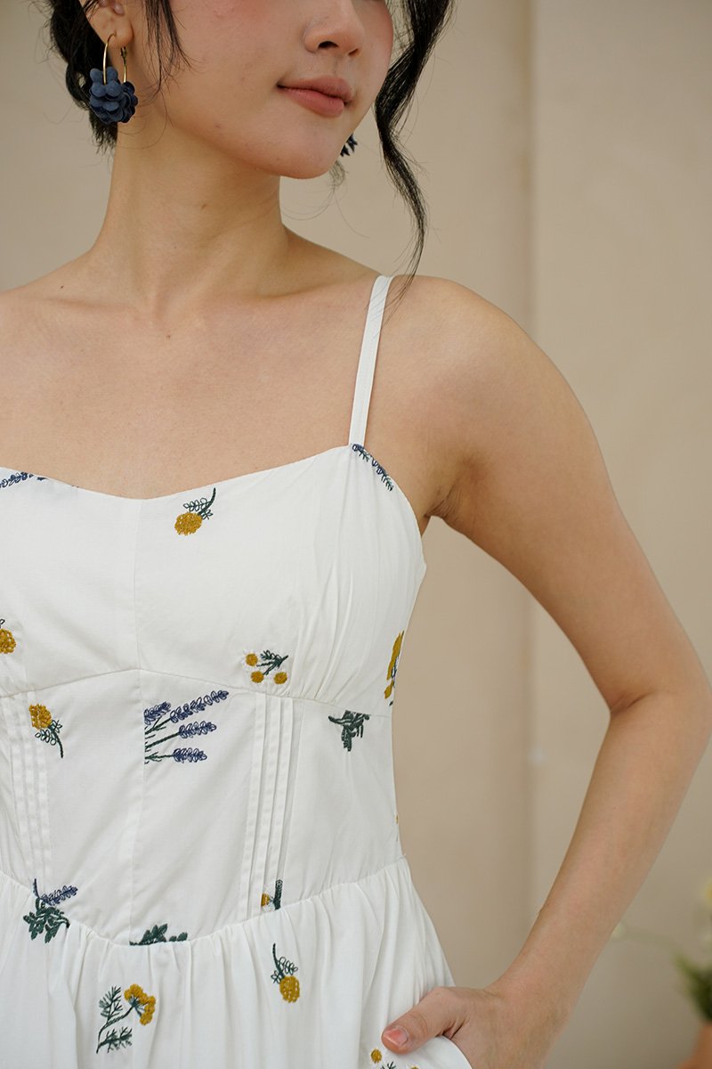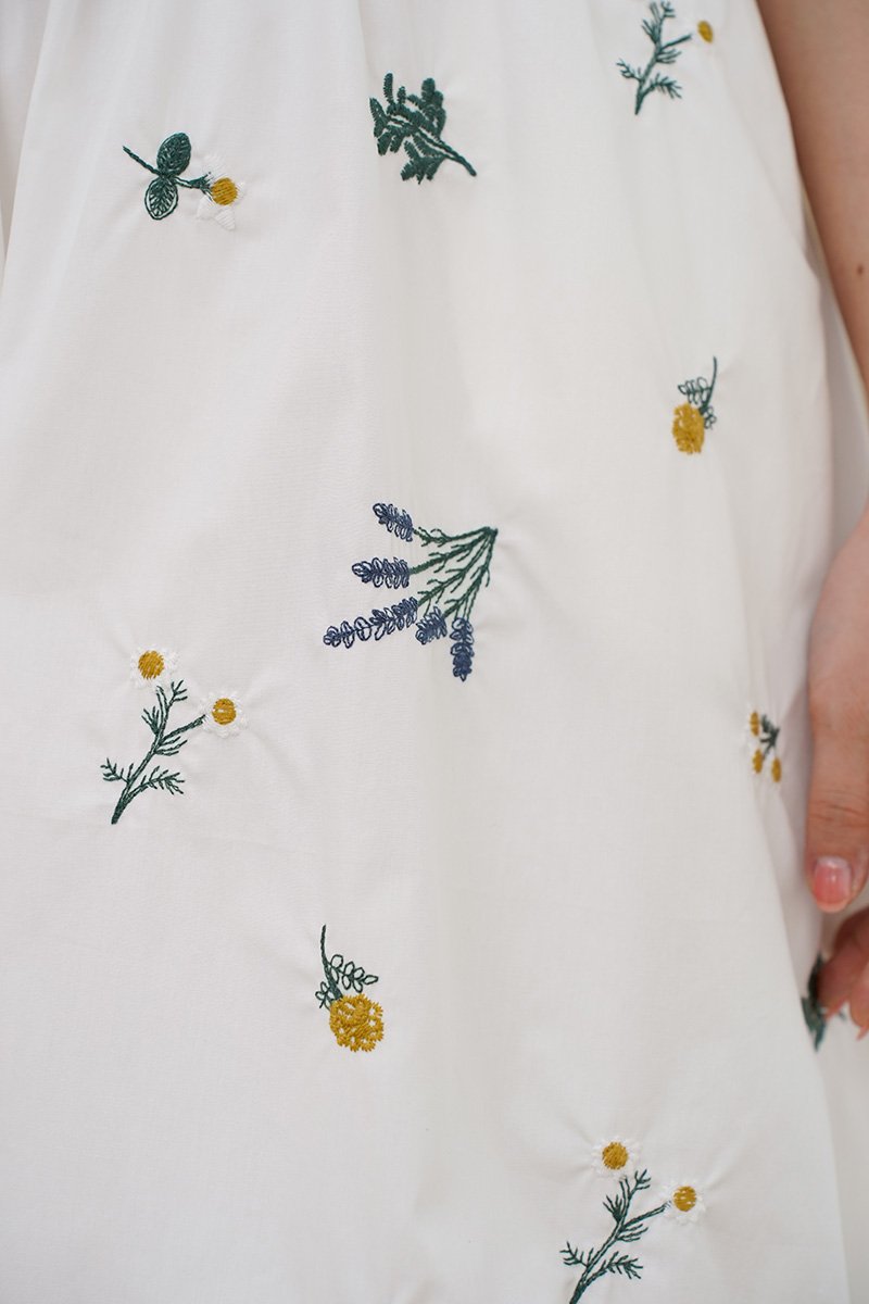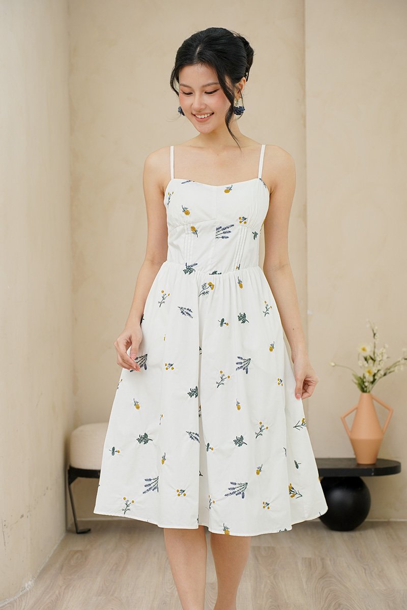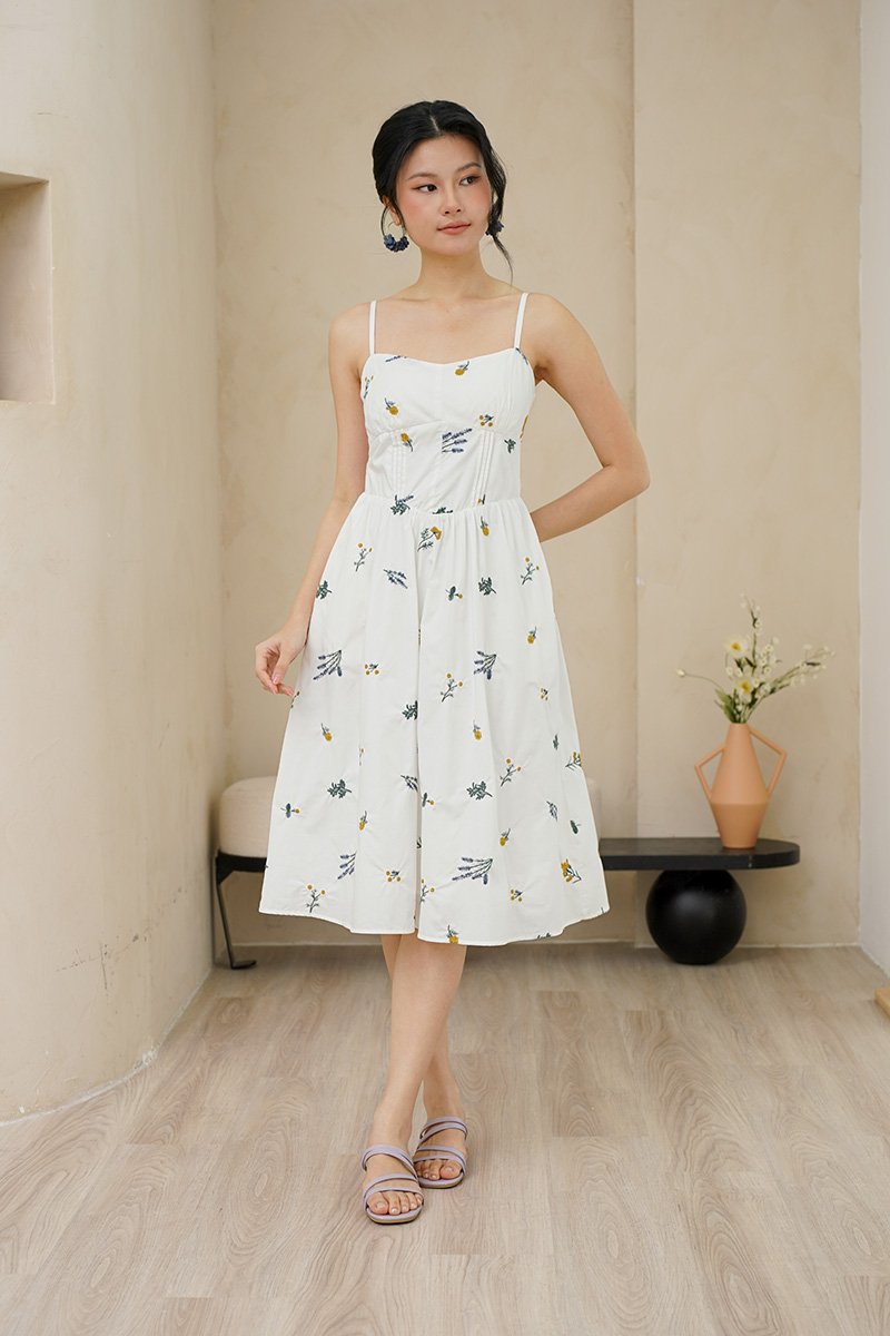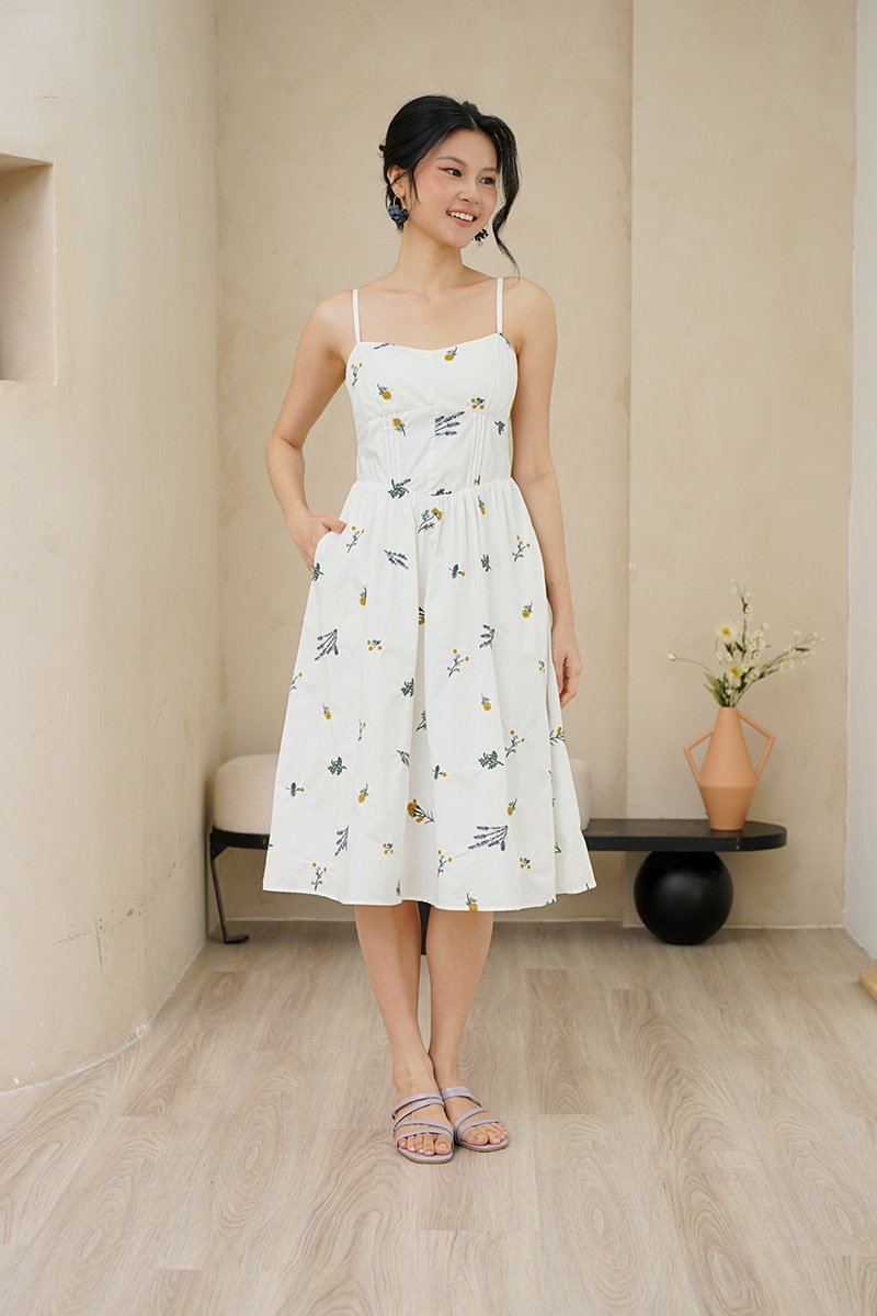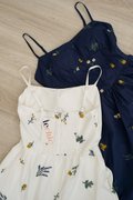 Padded at bust. Evoking the look of a meadow in full bloom. The dramatic florals are allover the dress in concentrations of lavender, marigolds and daisies, cascading delicately down the skirt towards the hem. Thoughtfully designed with a structured full A-line skirt and playful pockets, this piece is both timeless and enchanting. Sun drenched days call for a sundress as pretty and versatile as this, cut from crisp cotton embroidered with dainty florals, it features padding at bust and corsetry to cinch the waist, dainty pintuck trims along the waist and the game changer - secret side pockets! What more can a girl ask for? The gathered flare skirt gives that dreamy, twirl-worthy movement that's oh-so-charming. The mesmerizing lavender broderie in lilac and marigold daisies in cream-white light yellow hues adds an enchanting touch. With a gathered skirt and padded neckline, this dress is a force of nature, exuding a whimsical and free-spirited vibe and emanating cheerful spirit. Aligned with that optimistic approach, this dress is embroidered allover with whimsical floral garden broderie. Slow down — leisurely days call for a little swish and flow. This broderie number is your breezy solution that fits, flares and flatters. Take a stroll and watch those ditsy florals flow with every step. An absolute midsummer daydream, in dress form! The pleated waist design presents ingenious details, in romantic colourways, adding a touch of femininity and agility to the quiet and elegant blue or white tones. The dress captures our gaze with a mosaic of ditsy florals dipped in vibrant lemon hues, cascades of forest vines that dance alongside bursts of yellow hued flower motifs. Then, for a final dusting of magic, it is dotted with floating broderie motifs entwined within the fabric. Padded at bust. Fully lined, not sheer. Adjustable straps. Smocked at back.  Comes with side pockets. Concealed back zip closure.  Made of cotton linen rayon. Comes in navy blue and white. Available in sizes S, M & L.