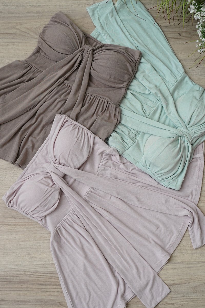 Padded at bust. This rayon soft cardigan set is perfect for brunch and an afternoon of shopping. The unique tie bust detail gives the strapless design built in support, and also the removable paddings give unparalleled support. Adjustable ties along the padded bust add a dynamic touch and soften the waistline. Delightful drapey bows tether the front of this tube cardi set that's full of warmth and charm. The feminine ribbon knot detail on the basic line makes it a lovely point, and you can tie the ribbon in various ways according to your taste. Designed in a breathable, crease-ease rayon knit, it’s your go-to layer for breezy days. With a classically cozy silhouette, this must-have cardigan and tube set will be the crush-worthy wardrobe addition of the season. A skin smooth cardigan meets the flirty tie-front bodice, complete with long drop that angle your frame nicely. Padded camisoles/tubes and cardigan sets are having a moment, currently. Wear the tube top solo to exude flirty confidence or layer it with the matching cardigan for a stylish, coordinated look that's perfect for any occasion. Oh so buttery soft rayon cotton and in the most eye pleasing shades ever, this set doubles up on all the reasons to adore cardigans and top sets! There's nothing as darling as you in this distinctive set! Sold together only and not separately as the size is cut to be the same size up top. This product is considered to be one top together and so it is not sold separately. Tube is padded at bust. Paddings are detachable. Pull on styling. Made of stretchy 66% rayon, 29% acrylic, 5% spandex. Comes in taupe grey, mint green and lilac. Available in sizes S & M.