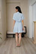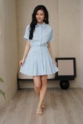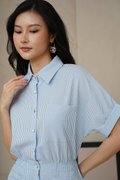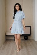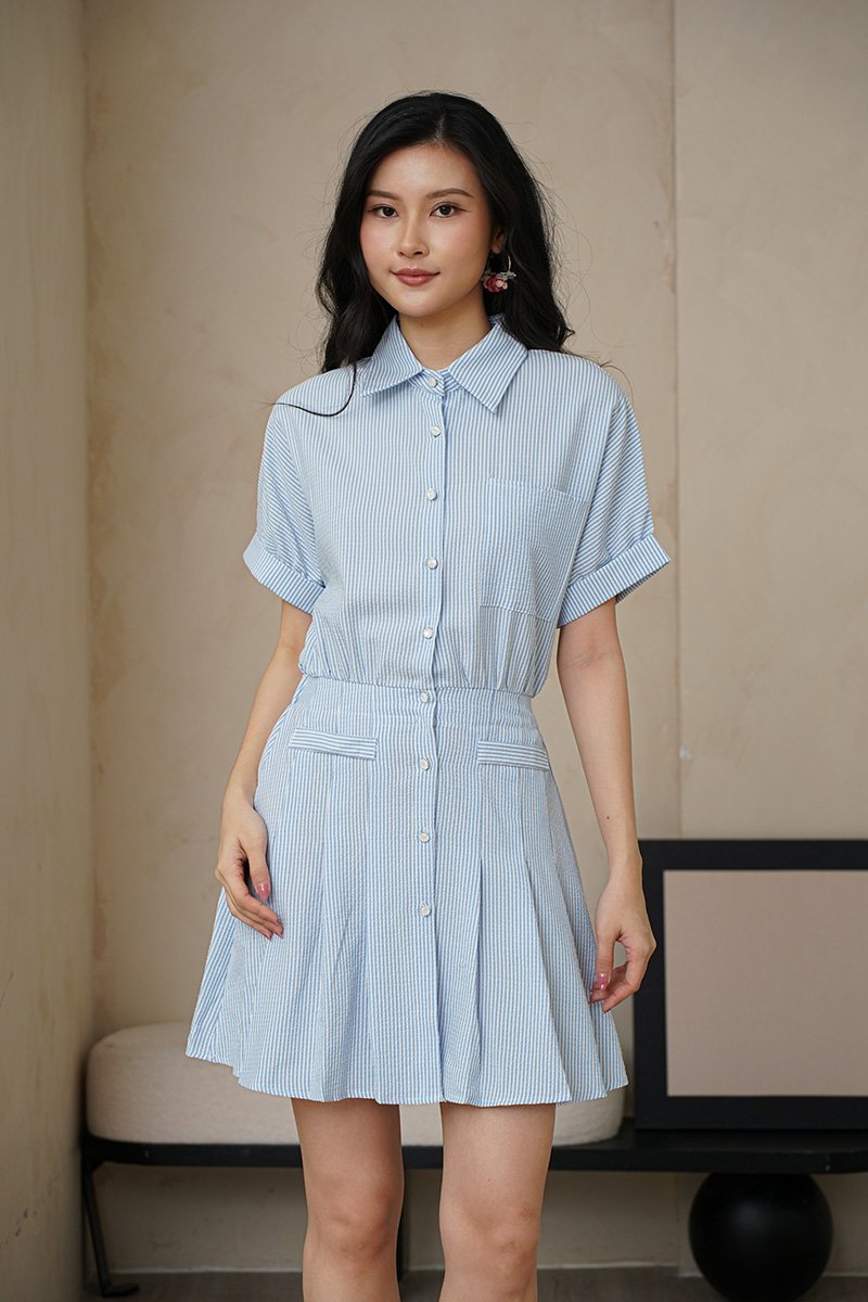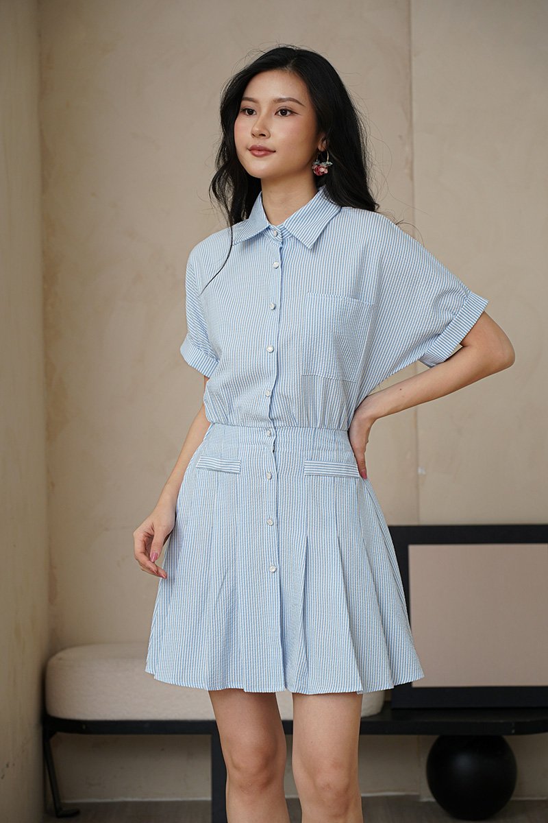 A mini version of our Starlet Stripes Power Pleats Midi dress! We have sailor stripes and power pleats, the whole package – in this. Resolutely feminine, understated, glamourous and bold, that is the statement silhouette flaunted by this hybrid shirt dress rendered in all stripes. Designed in oatmeal beige stripes and sailor blue stripes, this striped shirt dress cinches at the waist whilst falling into a pleated skirt. We know you do it all, so we designed a hybrid shirt dress that's just as versatile (and fabulous!) as you are. This timeless piece is a refreshingly feminine rendition of the classic menswear shirt with brass buttons and thin pinstripes. A relaxed silhouette means you can take this dress from brunch to business with the addition of a belted waist and heel. Or, style open as a layering piece over a silk camisole and trousers for a look that's casual-chic. Combining avant-garde silhouettes with resolute practicality, as showcased by this shirt dress, the garment features a shirt bodice with a vertical stripe pattern that falls to a combined pleated skirt. The fitted waist and A-line silhouette create a slimming effect. Additionally, the pleated skirt comes with an elastic waistband for added stretch and inclusivity. Featuring a subtle vertical stripe print, the versatile elastic waistband allows it to alter its silhouette, which is finished with a mid-pleated skirt. A button-down collar and full placket bring classic shirt styling to this organic cotton midi dress, while sharp pleats add feminine flair. Crafted using a cotton blend that’ll smooth and skim the figure, the carefully placed stripes also define your bust and draw attention in at the waist. Languid elegance defines this draped midi dress, balancing a flourishing nautical print with a softly pleated skirt and a concise tailored bodice. Nothing combines the best of both worlds (stripes and pleats) in such flair, seriously. Functional buttons and chest pocket. Decorative skirt pockets. Elasticised waistline. Full button down styling, with concealed metal hook closure on waistline. Made of cotton polyester blend. Comes in ecru and blue. Available in sizes XS, S, M & L.