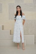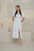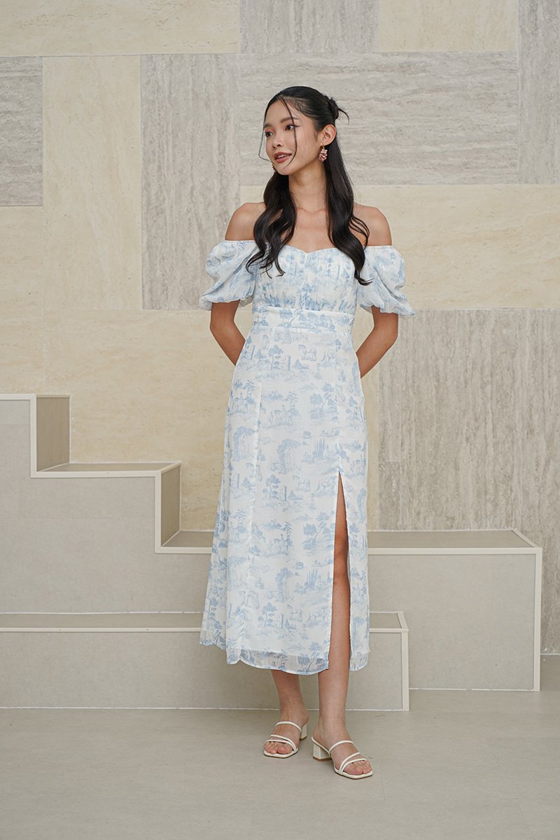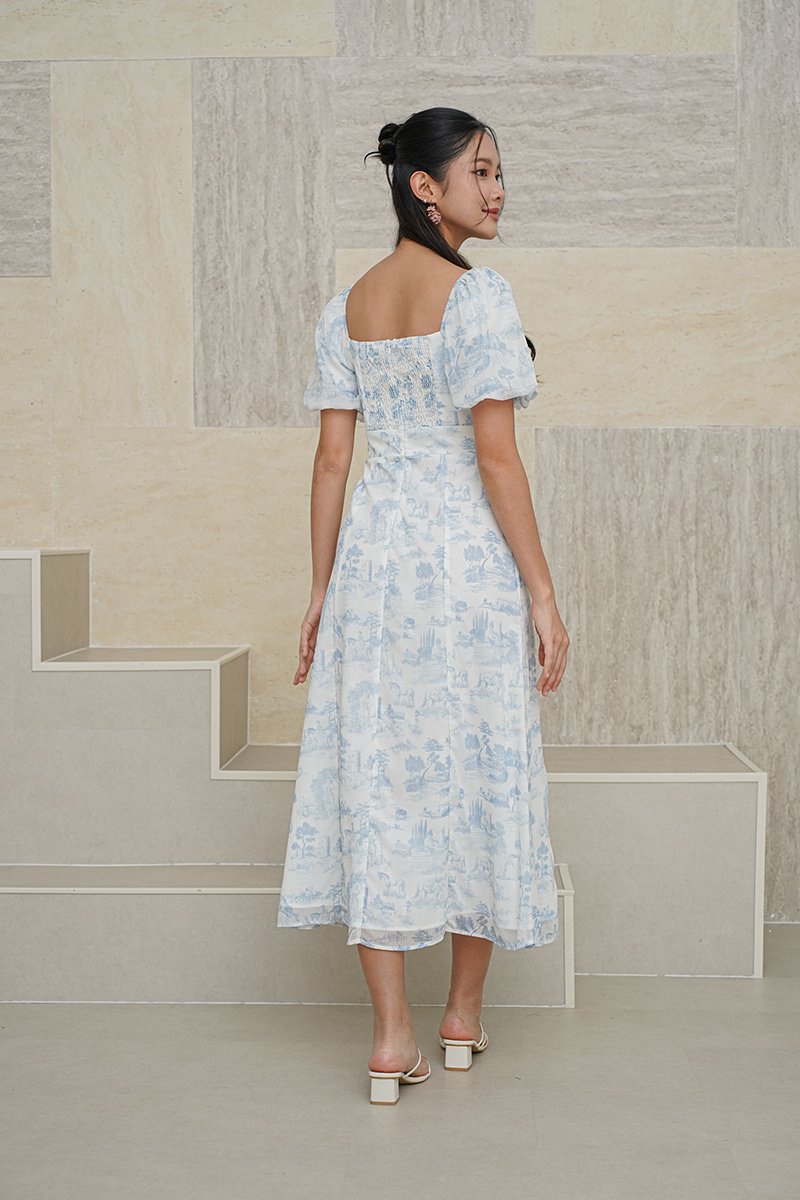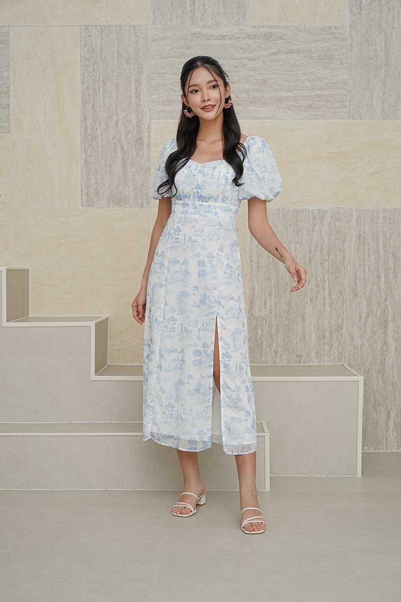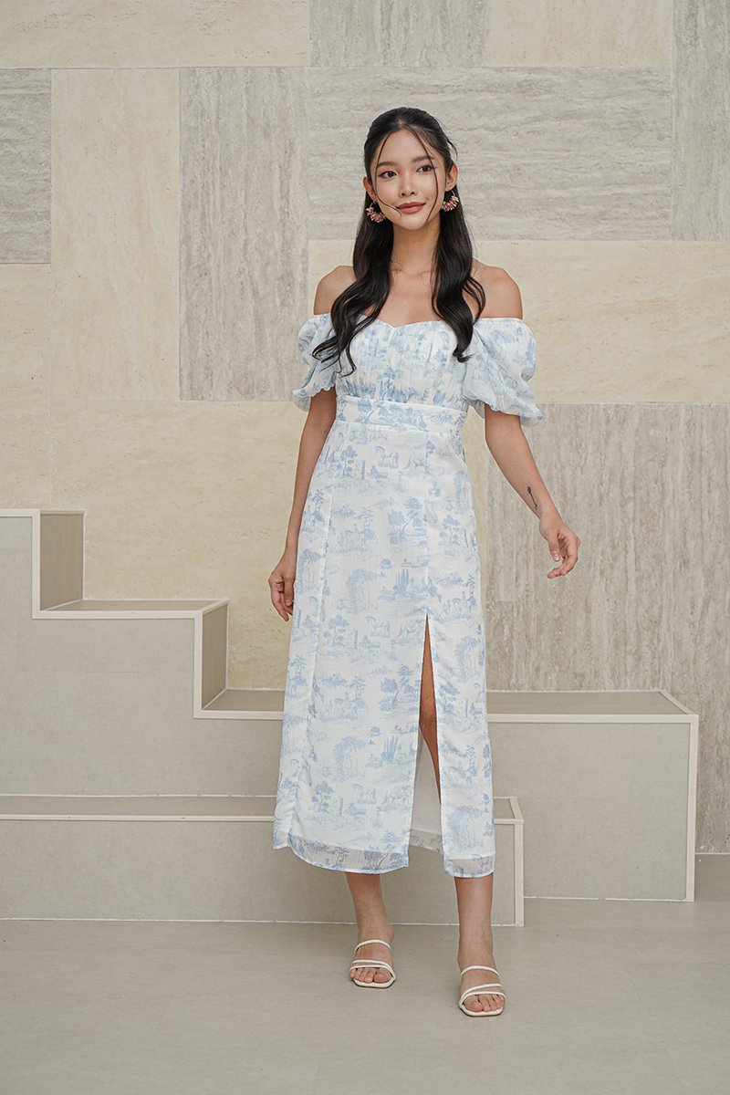 Light, airy, printed fabric with scenes of pastoral life, mythology, exotic travel, flora, and fauna, verging sometimes on the whimsical. It provides a gentle uplift to a person’s imagination. Enrich your repertoire to prepare well for the new season's evenings with this gorgeous toile printed number from our latest collection. Printed across a beautifully shirred neckline and a column silhouette with a slit. Beautifully tailored in premium cotton for a luxurious softness and feel packed with fine sheen and excellent drape, it's modern print pattern and trendy sweetheart design should get you bouquets of compliments. Enjoy hot days to the max with this pretty midi dress! Its shirred neckline and short puffy bubble sleeves will add a romantic touch to your outfit. You will love its ruched bodice and its A-line cut as they will highlight your beautiful silhouette. A soft, feminine piece made for daydreamers. Adorned with a delicate toile pattern in watercolour inspired pastel hues, this dress features a flattering neckline and voluminous puff sleeves that channel timeless vintage elegance. The gently gathered bodice creates a sculpted shape, while the flowing A-line skirt adds graceful movement with every step. Whether you're attending a garden wedding, brunch, or an afternoon picnic, this dress offers elegance with ease and charm. The easy choice for weddings and soirees of any kind, this will take you anywhere, and present a quiet confidence without upstaging the host. Padded at bust. Elasticised neckline. Bubbled sleeves. Smocked at back. Fully lined, not sheer. Concealed back zip closure. Made of cotton polyester blend. Comes in pink and blue. Available in sizes S, M & L.