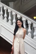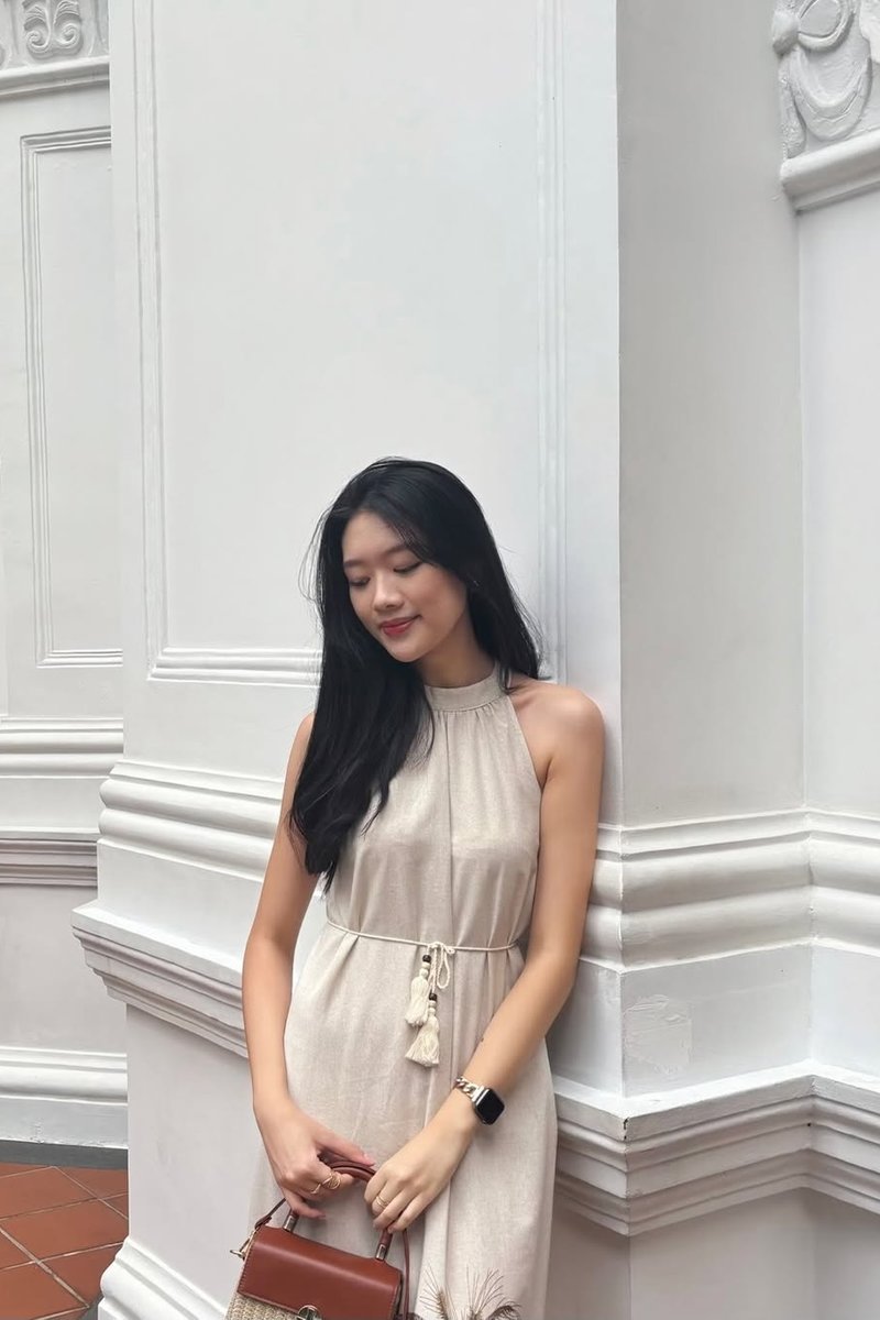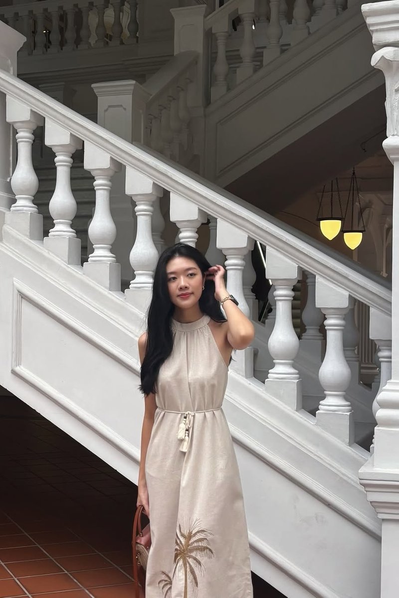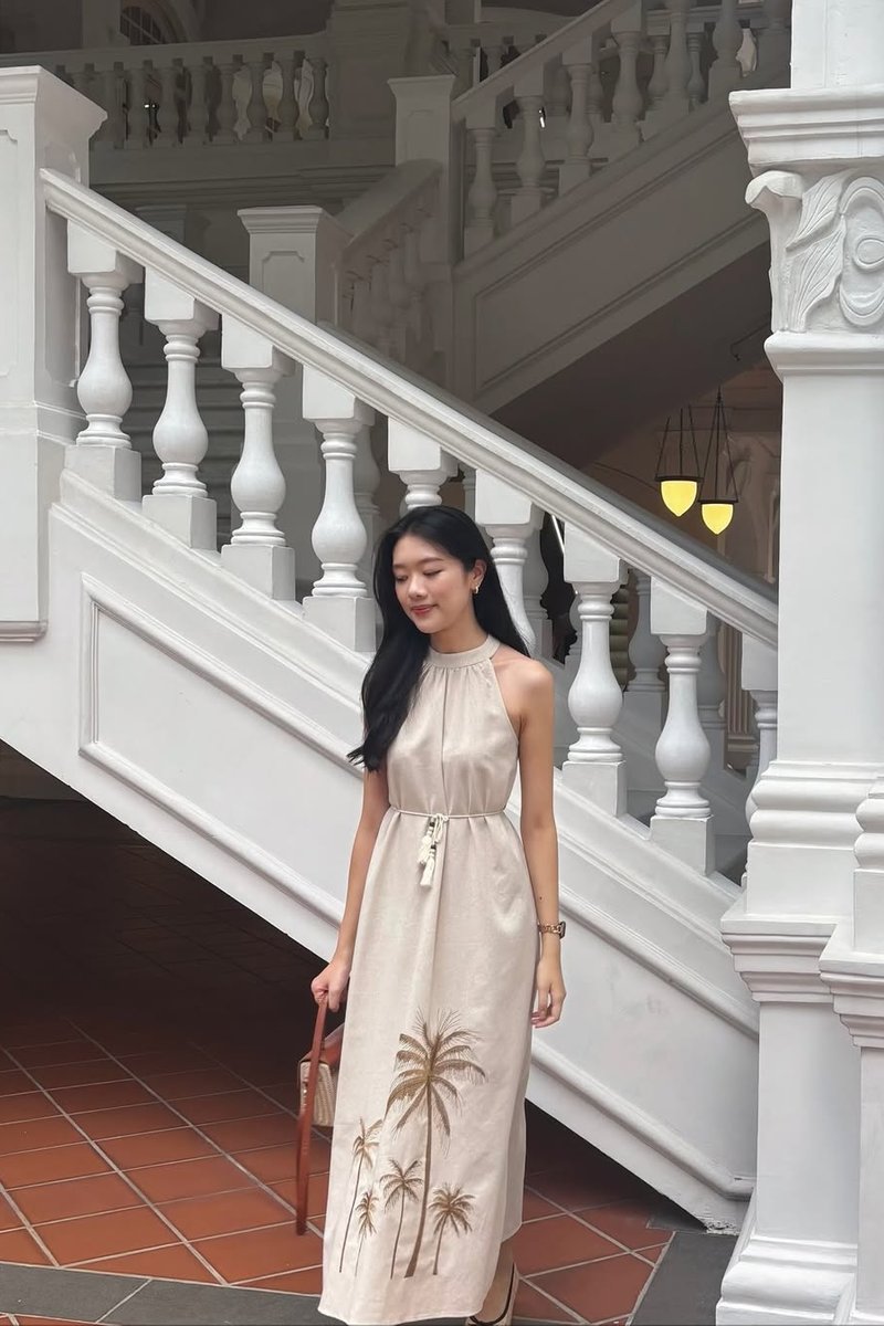 Stunning and undeniably refined, this embroidered tassel-style halter maxi dress in oatmeal radiates effortless sophistication. Designed to complement a wide range of skin tones, its soft neutral palette and intricate embroidery create a striking harmony of classic elegance and modern edge. In this darling dress, a row of gold palm tress marks the divide between a smooth, shoulder-showing bodice and a swirling skirt shaped with petite gathers. A refined blend of natural elegance and artisanal craftsmanship, this linen dress embodies effortless luxury. The highlight of this piece lies in the intricate golden embroidery of palm trees along the hem, adding a touch of desert inspired opulence. Perfect for warm weather occasions, from serene coastal getaways to chic city outings, this dress is a timeless staple that seamlessly transitions from day to night. With its halter design, the dress stands out for its charming rope tassel tie detail and softly gathered high neckline. The palm trees on the front of the dress adds a tropical touch of palm beach paradise. It's ideal for a summer look that combines style and comfort. Intricate embroidery adds a touch of artistry, while the adjustable size ensures a perfect fit. Make a statement of sophistication and refinement with this tropical-inspired piece. A vacation-perfect palm print enlivens this flared cotton maxi meant to show off your shoulders. Features embroidered flowers with metallic thread. Pull on styling with back keyhole closure. Made of polyester crepe blend rayon linen. One colour only. Available in sizes XS, S, M & L.