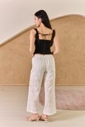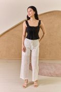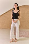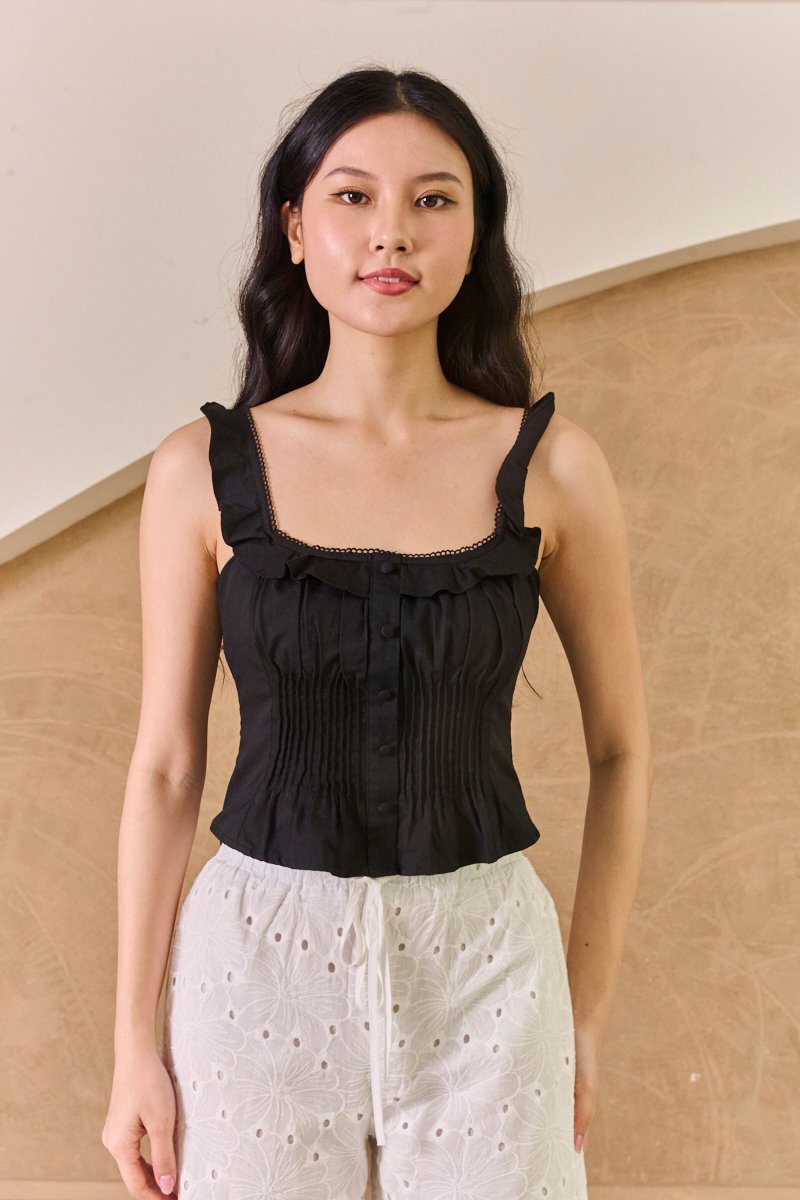 This delightful padded cotton poplin crop top combines playful charm with everyday wearability. The ruffle-trimmed lattice scoop neckline adds a touch of feminine flair, whilst the button-decorated front allows for versatile styling. Pair with our pretty Bali pants as seen on our model for a coordinated summer ensemble, or style with high-waisted denim shorts and trainers for casual daytime outings. The regular fit and sturdy shoulder straps ensure comfort for family gatherings or weekend brunches. For cooler evenings, layer with an oversized cardigan and accessorise with statement jewellery to enhance the look. Feminine scoop neckline with charming ruffle trim detail, enhanced with subtle lattice details. Wide shoulder straps provide comfortable support. This top is the epitome of daring meets delicate, with its structured corset design that cinches the waist and accentuates the figure, and pintuck gathers giving a sweet delicate vibe. Crafted from a soft, stretchable fabric, it ensures both comfort and a flattering fit. The ruffled neckline adds a touch of romantic flair, perfect for those who love to blend edgy with sweet. It features classic palettes that makes it a versatile piece for layering or as a standout solo piece. The side zipper closure and pleated pintucks ensures a snug fit, while the cropped length makes it an ideal partner for high-waisted bottoms. Dress for your dreams in this cute number, featuring classically femme details like lace, ruffles and pleats. Each piece evokes a romantic ideal, bringing a whimsical feel to every silhouette. Padded at bust. Decorative buttons. Fully lined, not sheer. Smocked at back. Concealed side zip closure. Made of cotton. Comes in black, burgundy red and white. Available in sizes S, M & L.