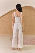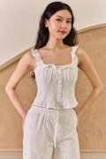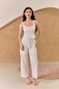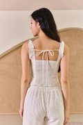This delightful padded cotton poplin crop top combines playful charm with everyday wearability. The ruffle-trimmed lattice scoop neckline adds a touch of feminine flair, whilst the button-decorated front allows for versatile styling. Pair with our pretty Bali pants as seen on our model for a coordinated summer ensemble, or style with high-waisted denim shorts and trainers for casual daytime outings. The regular fit and sturdy shoulder straps ensure comfort for family gatherings or weekend brunches. For cooler evenings, layer with an oversized cardigan and accessorise with statement jewellery to enhance the look. Feminine scoop neckline with charming ruffle trim detail, enhanced with subtle lattice details. Wide shoulder straps provide comfortable support. This top is the epitome of daring meets delicate, with its structured corset design that cinches the waist and accentuates the figure, and pintuck gathers giving a sweet delicate vibe. Crafted from a soft, stretchable fabric, it ensures both comfort and a flattering fit. The ruffled neckline adds a touch of romantic flair, perfect for those who love to blend edgy with sweet. It features classic palettes that makes it a versatile piece for layering or as a standout solo piece. The side zipper closure and pleated pintucks ensures a snug fit, while the cropped length makes it an ideal partner for high-waisted bottoms. Dress for your dreams in this cute number, featuring classically femme details like lace, ruffles and pleats. Each piece evokes a romantic ideal, bringing a whimsical feel to every silhouette. Padded at bust. Decorative buttons. Fully lined, not sheer. Smocked at back. Concealed side zip closure. Made of cotton. Comes in black, burgundy red and white. Available in sizes S, M & L.