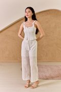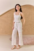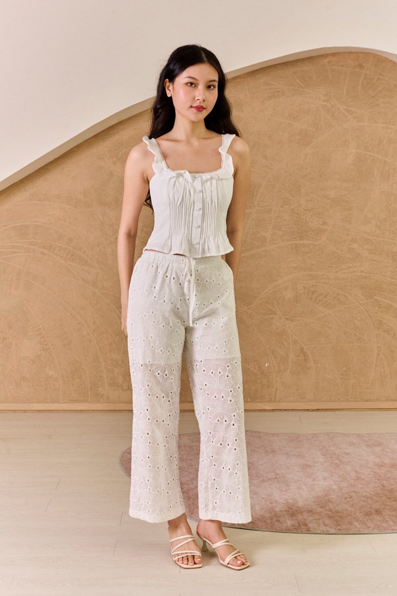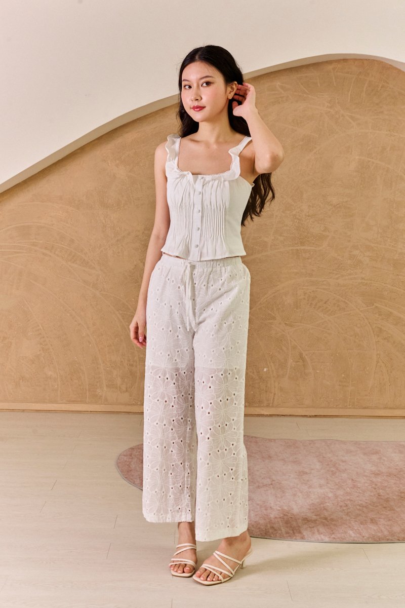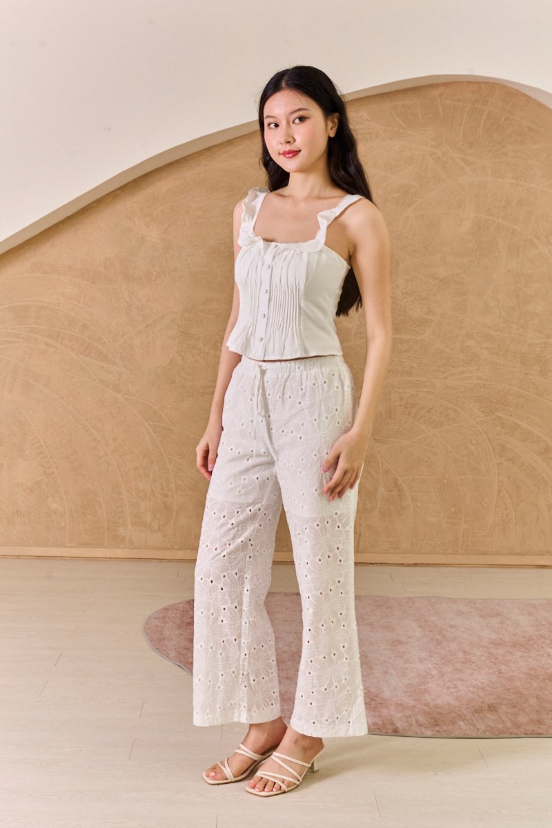 Styled with Bali Boheme Broderies Openwork Palazzo Pants, Cutting Precision Pleated Skorts Gunmetal Grey and Moving Right Along Strappy Heels Cream.